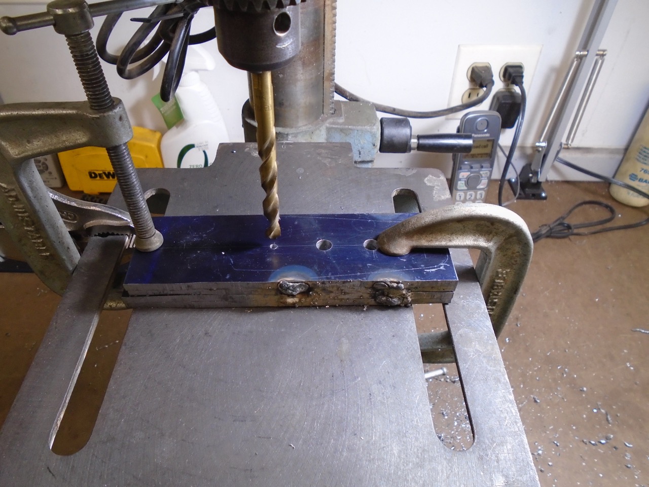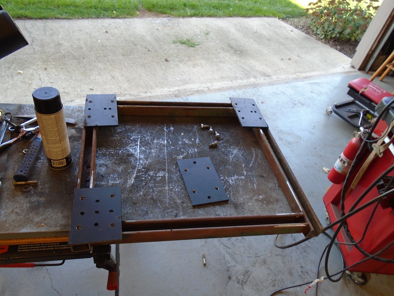 I lay everything out on this plate I then will cut them out, weld all 4 together, then drill the holes out, cut out all 4 together, and then run them all through the disc sander to clean them up. Stick a couple of bolts in them and add them weld them to the arm pieces I cut off earlier. |