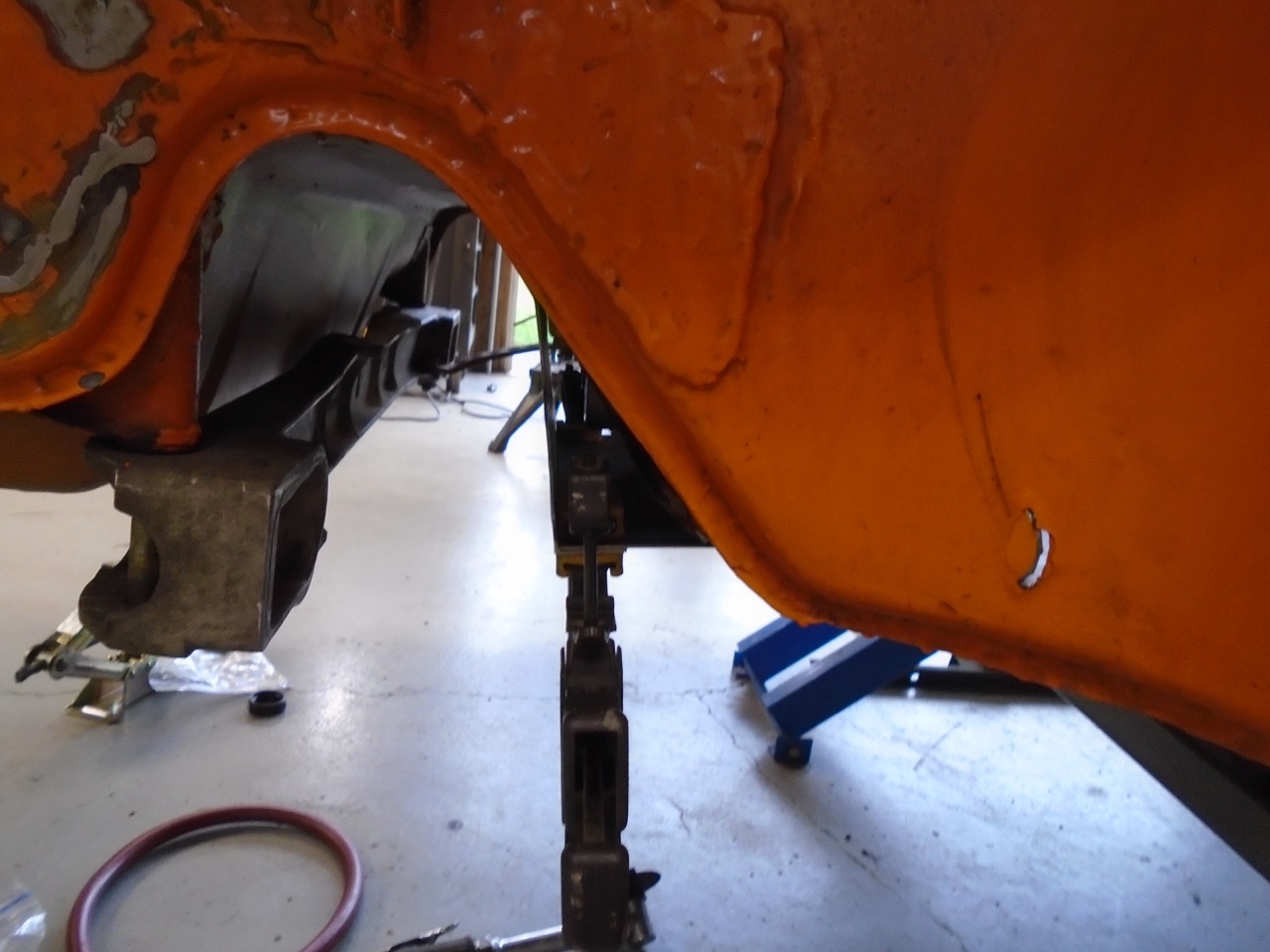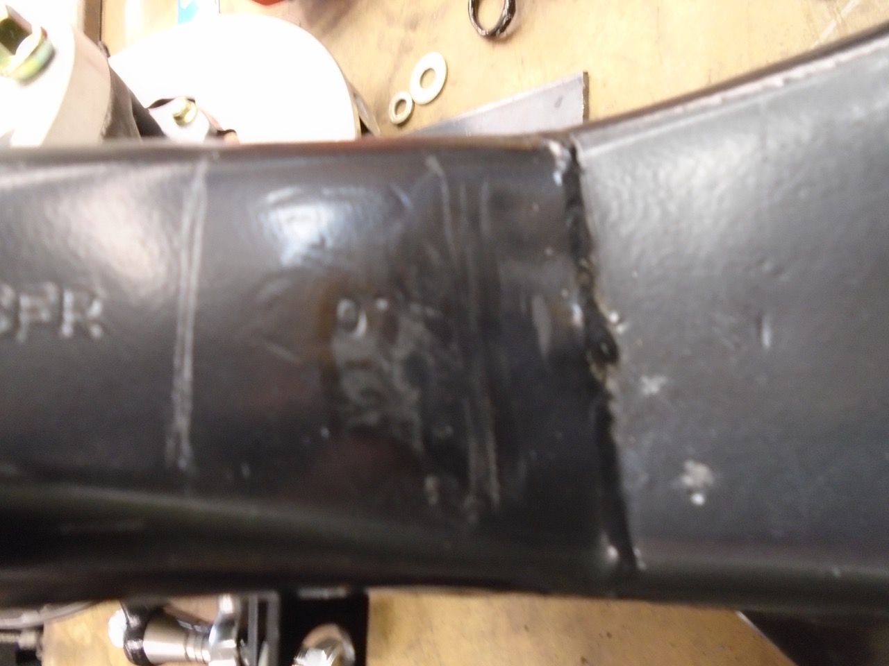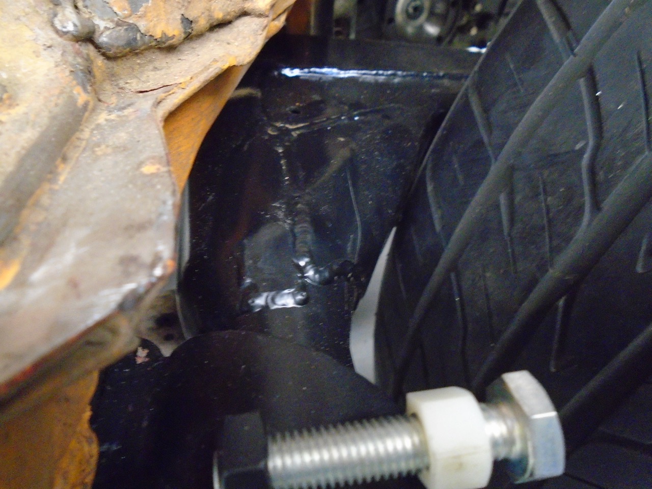 That tire rub spot on the trailing arm reinforcement can be mitigated by carefully "denting" the reinforcement with a hammer. |