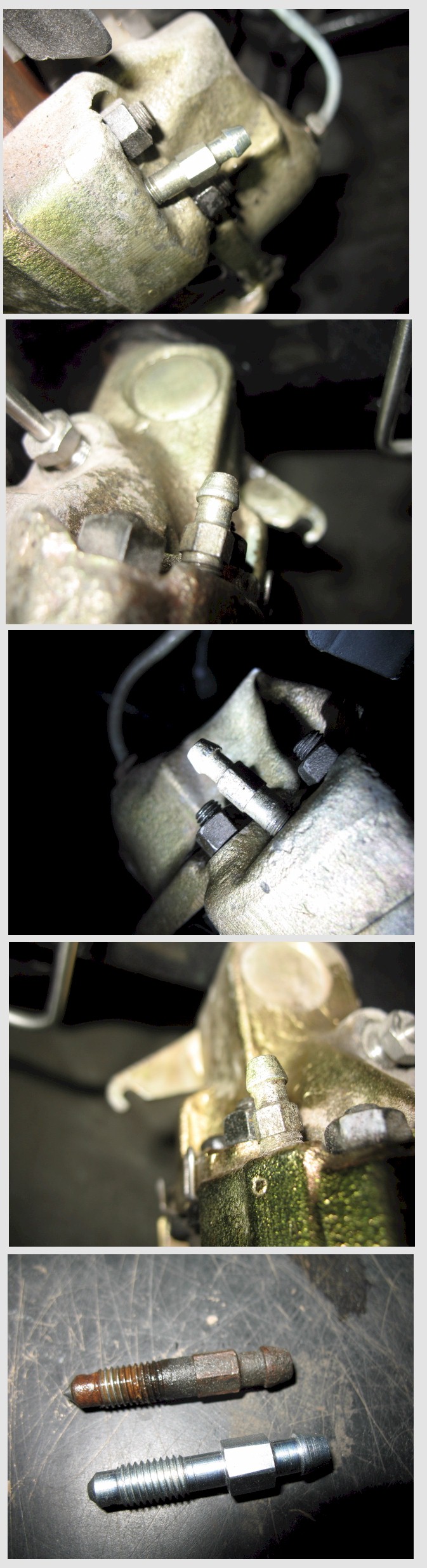 I did bleed each corners twice so far and have some small amount of peddle, maybe 25% or so of normal. the picture below is a new bleeder and one I pulled out of my jack standed car. Attached thumbnail(s) |