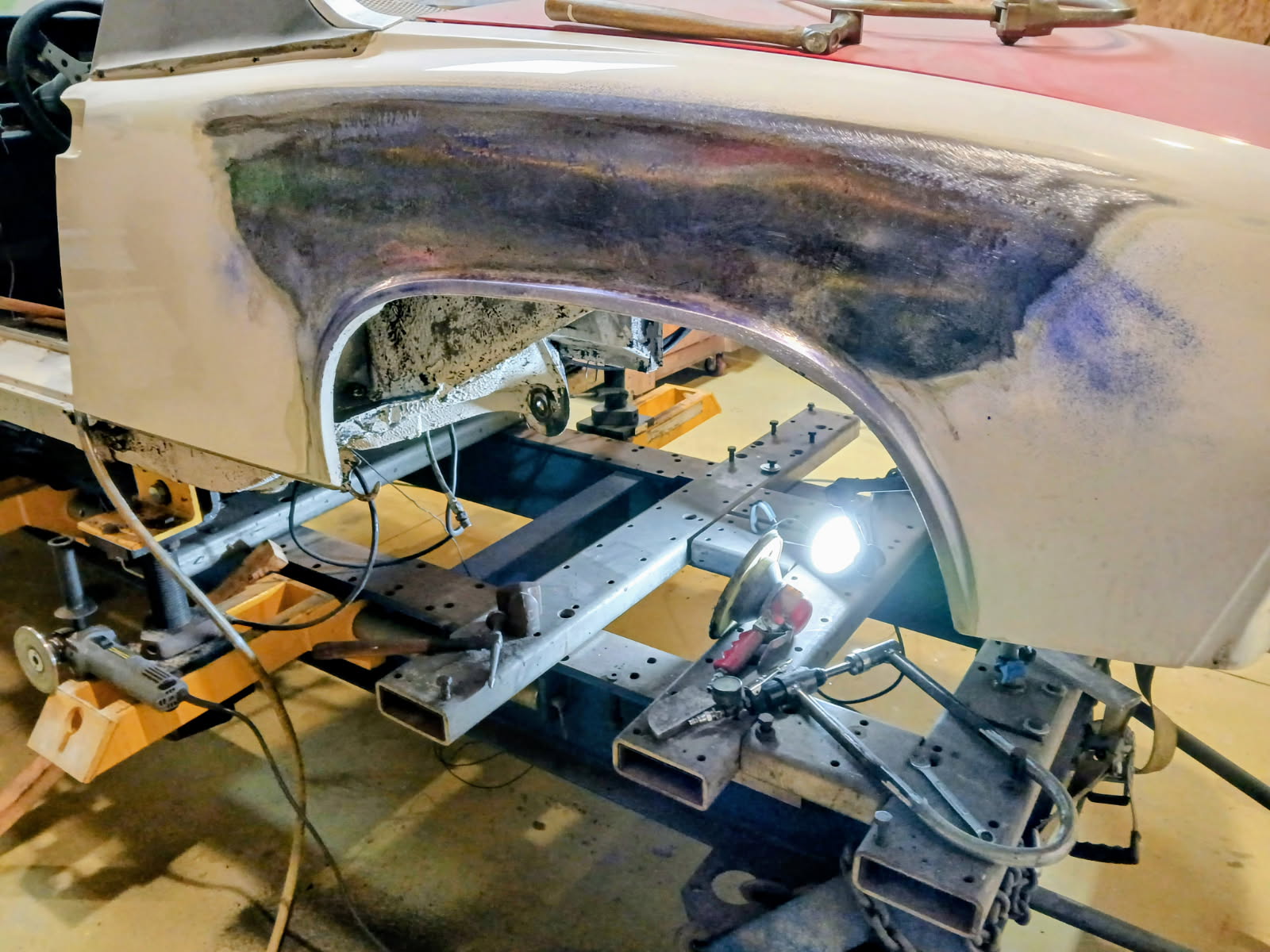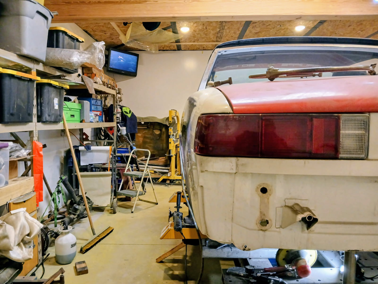 I don't have the height or the space in my shop for a lift. I made this from a 2500lb air jack. It worked to get Jueren's car up on the Celette. It was a bare shell. When I did my 6 it barely lifted it and I was afraid it would topple over. When I took it off the Celette I pulled the doors & lids. I should have used a 4500lb jack.