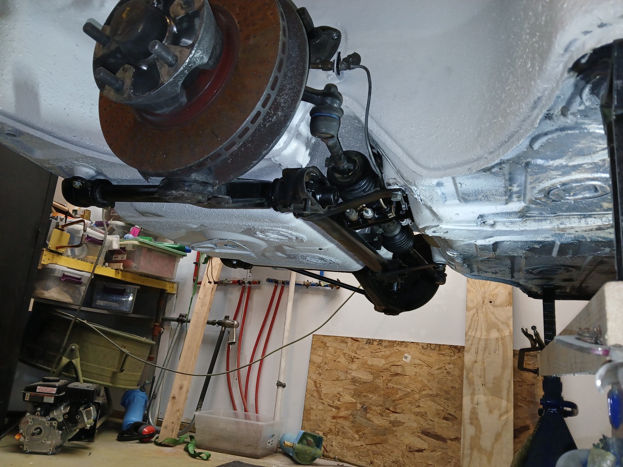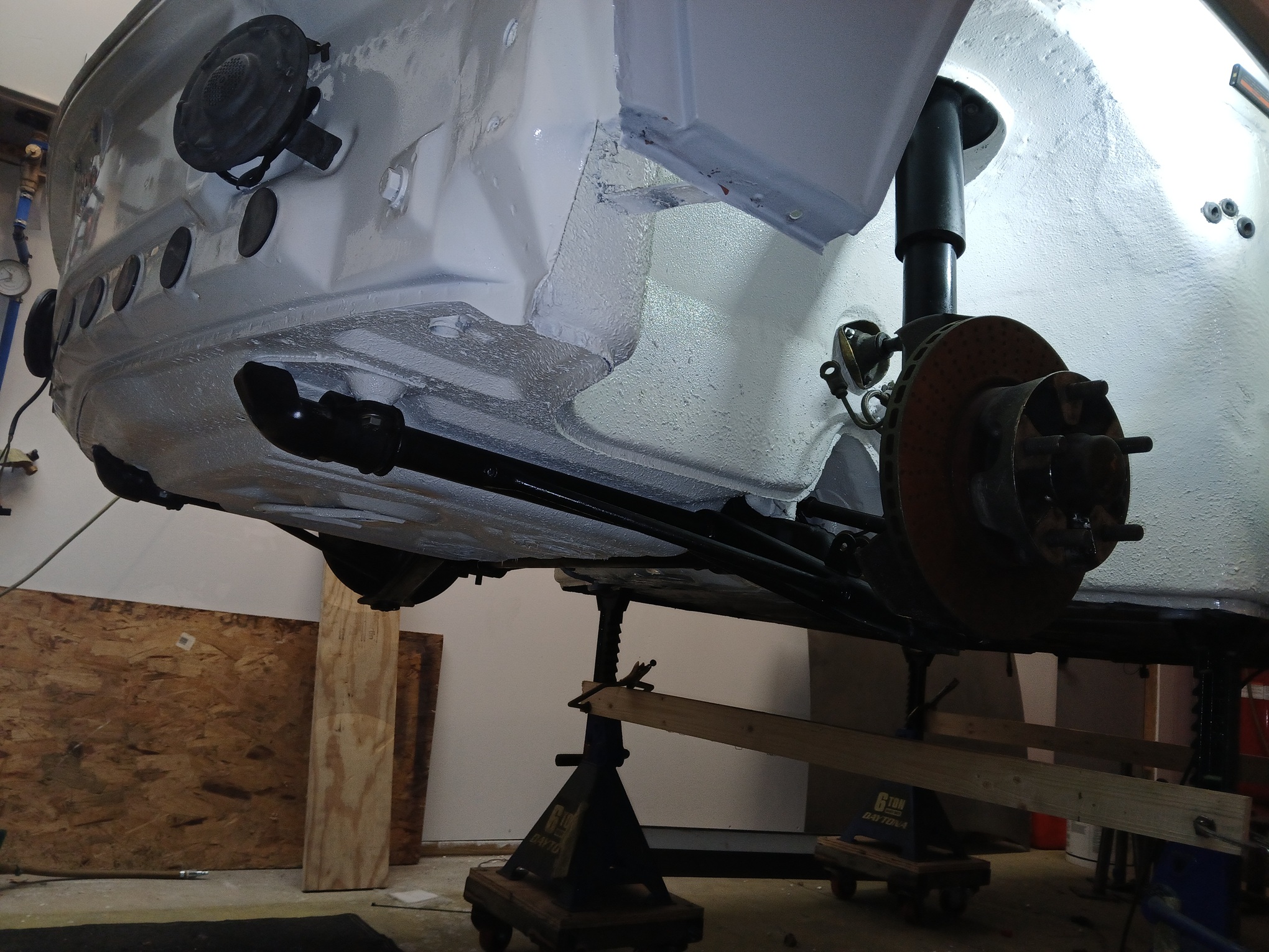 Rick, Do you get nervous moving the car on jackstands on the rolling furniture dollies? Yes! It was vey Scary! The stands are bolted to the bases. I ended up clamping braces to the jack stands to keep them from twisting. I only moved the car against the wall. Once the suspension is on the car can hit the floor. |