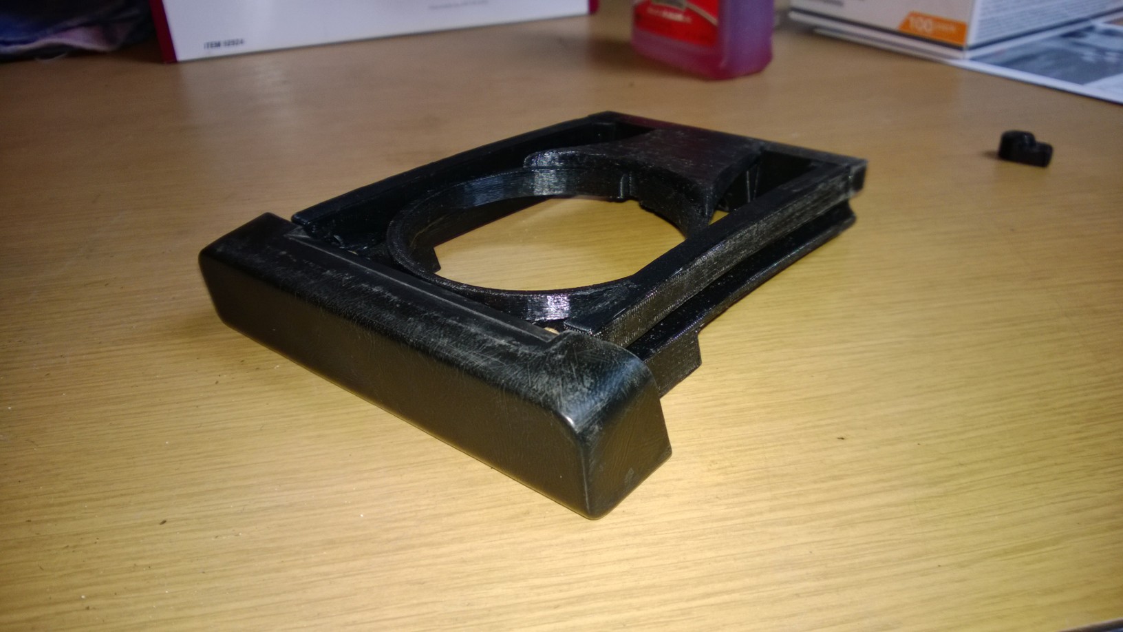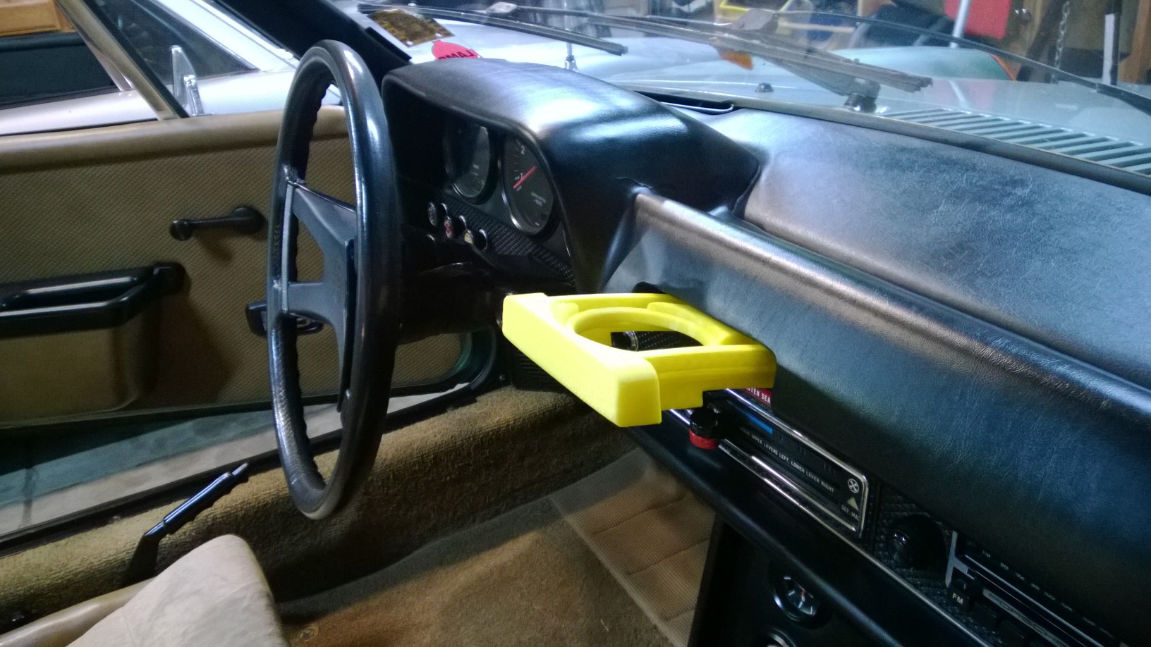 There will be four models available, each priced at $45 shipped. Each model can hold a 32 oz “Big Gulp” comfortably, and excel equally well at holding more traditional 16oz coffee cups. The units will be printed in black ABS plastic, assembled using ABS glue. Each of these designs takes approximately 9 hours to print, allowing us to print two units per day. With the amount of interest in this item some will likely be waiting 30 days+ before delivery. The models are described below: #1 The 914 Ashtray Cupholder - $45 This model has a printed front face and is intended as a direct slide-in replacement for the stock ashtray. #4 The Stealth Ashtray Cupholder (Up to 73') -$45 This model re-uses the stock front from the ashtray, making the cupholder indistinguishable from a stock ashtray when closed. There are differences between ashtrays! See http://www.914world.com/bbs2/index.php?sho...&hl=ashtray for more information. I expect that prior to mid-74 the ashtray fronts was held on with screws (100% compatible with stealth design), and after 74 they switched. 74 and LATER ASHTRAY CUPHOLDERS are now available!! IMPORTANT: before placing your order, verify which ashtray you have (either a screw on ashtray front, or one with funny rivets). ![]() There will also be several accessories available. The list of accessories, along with short descriptions of each are listed below. #5 Soda-holding Insert -$8 This clips into the ashtray cupholder allowing it to hold a soda can or small water bottle ![]() #6 Phone Holder -$15 This accessory clips into any of the ashtray cupholders and rotates to lock in place. I currently have holders for the following phones, but will be continuing to expand the models available.