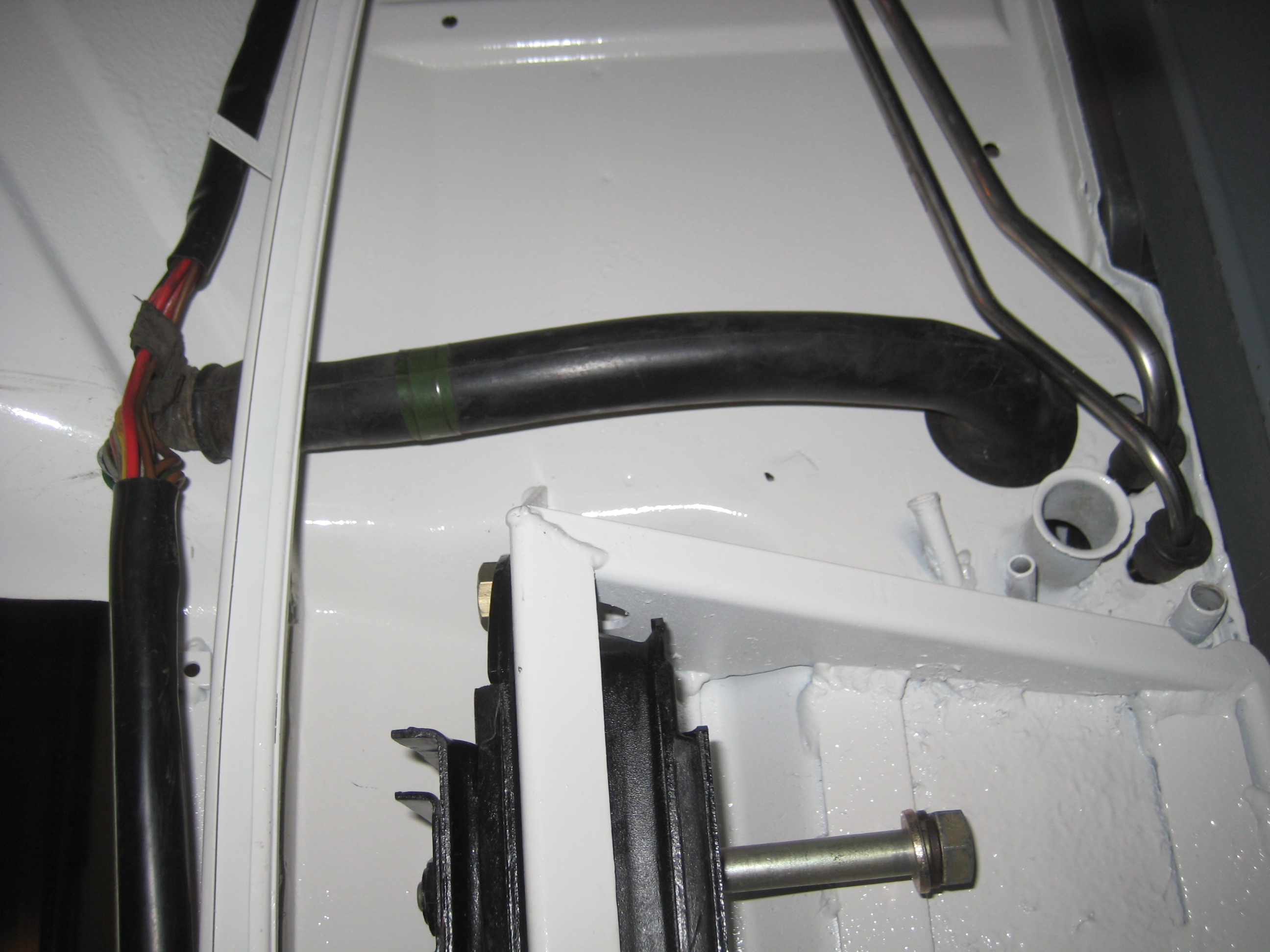 From above you can see the hole in my 72 engine shelf and the big washer is about where I have seen on 75 cars. It is in the middle section where the shelf gets wider. I also found a picture earlier that showed the latter 75 location but was said to be a 74, so I don't know when the change was made or if there was an equipment difference that went along with the change. My late 75 rear half harness was out of a2.0L California car. Jim ![]() |