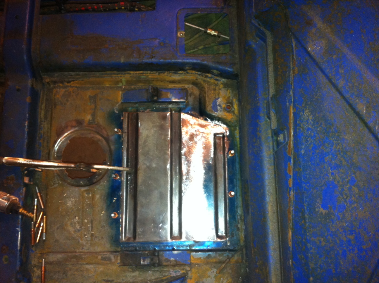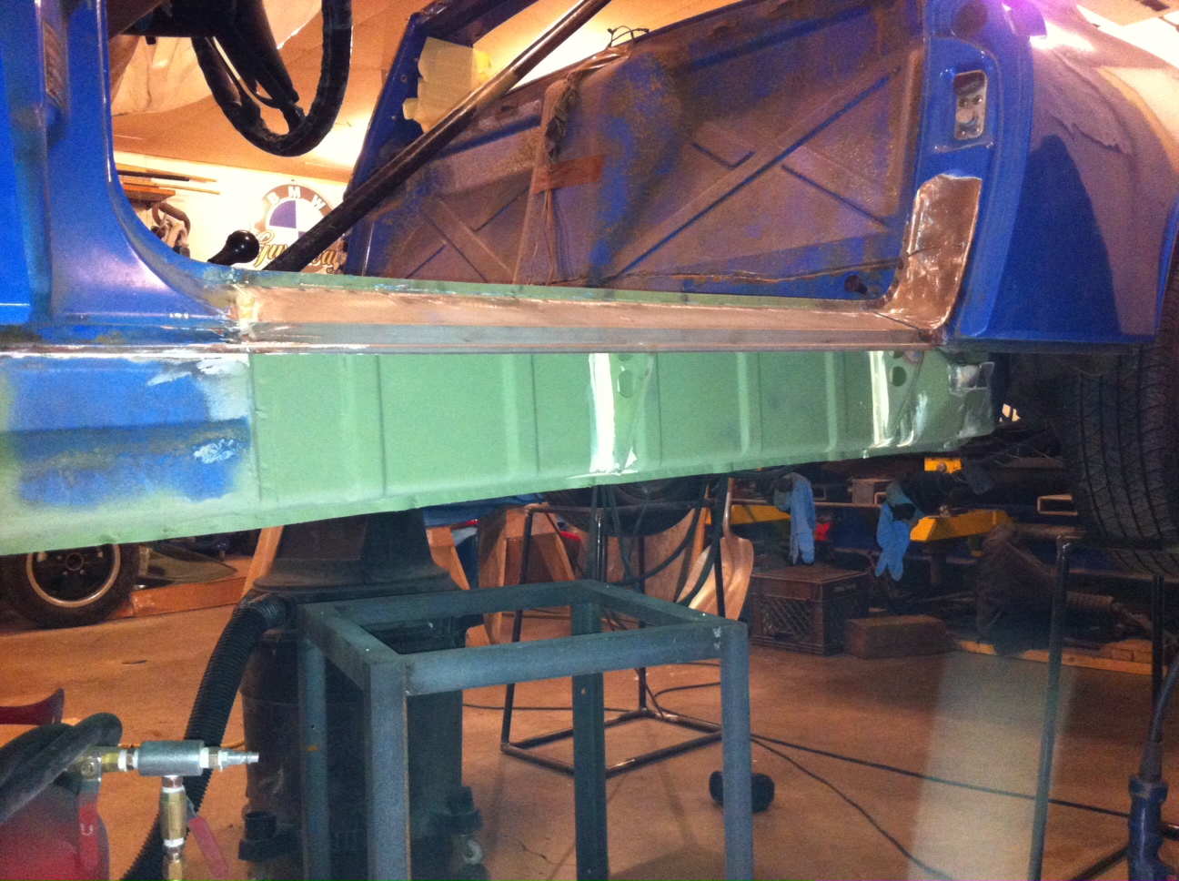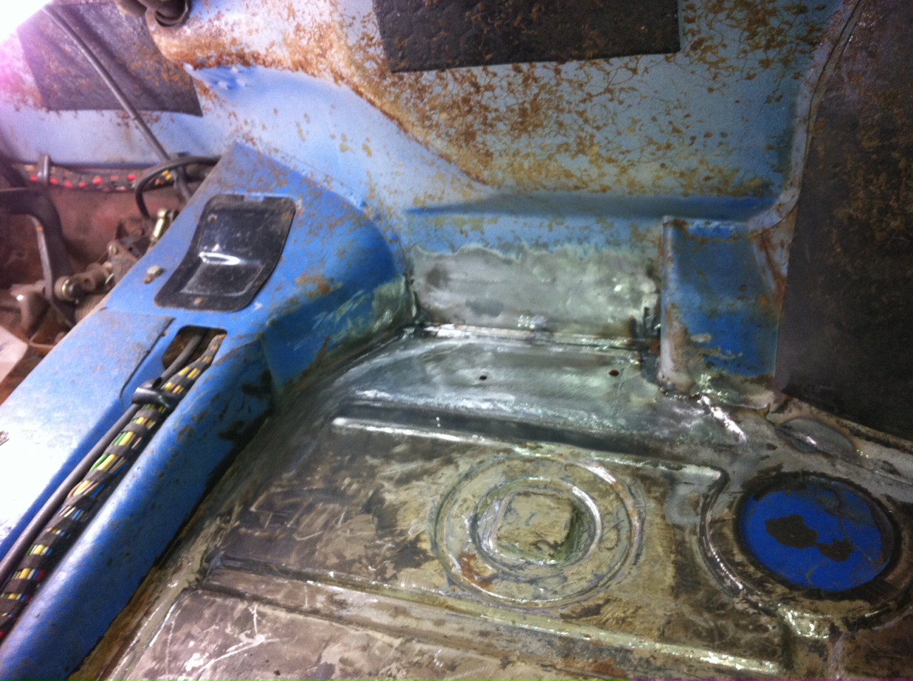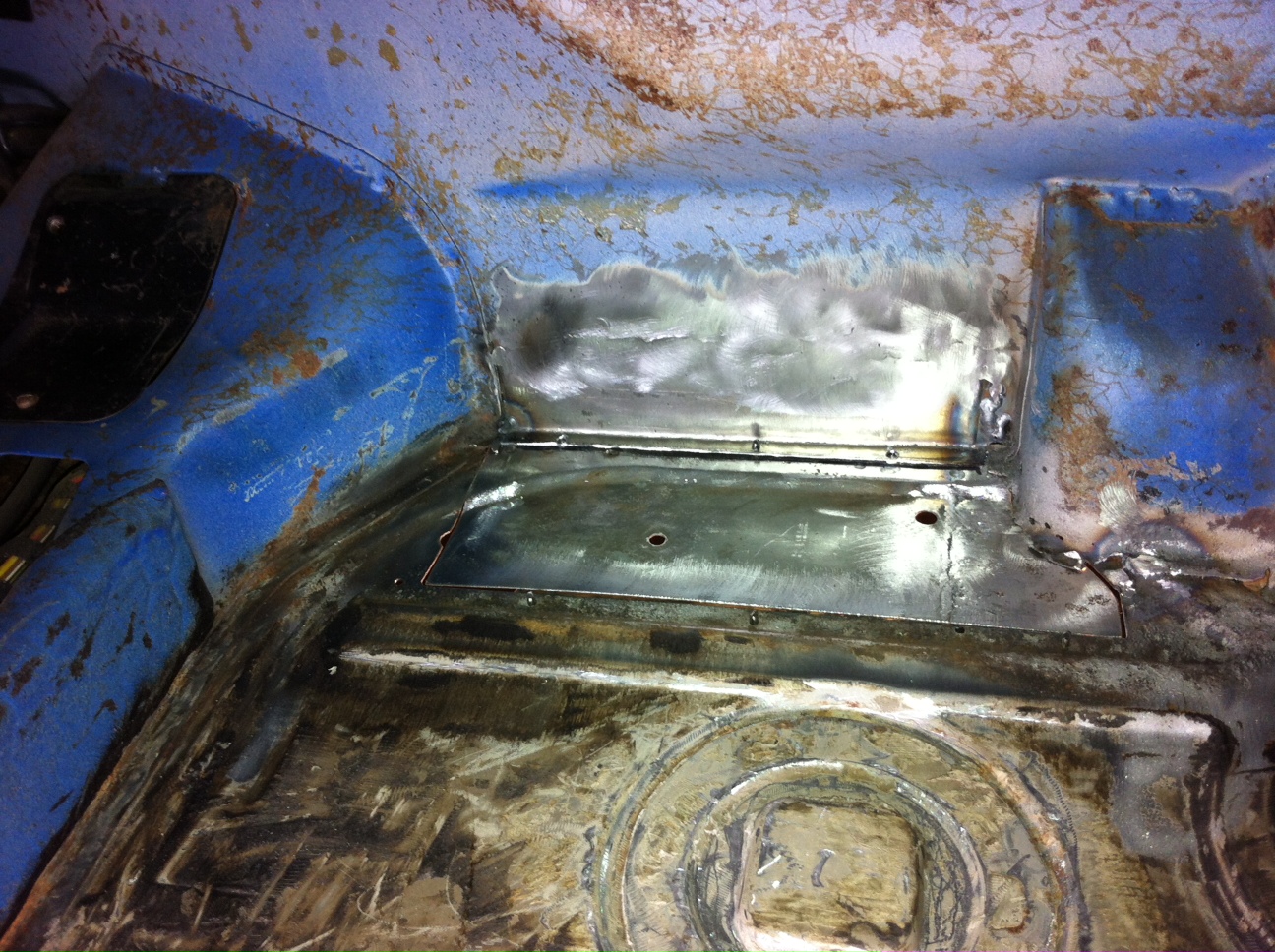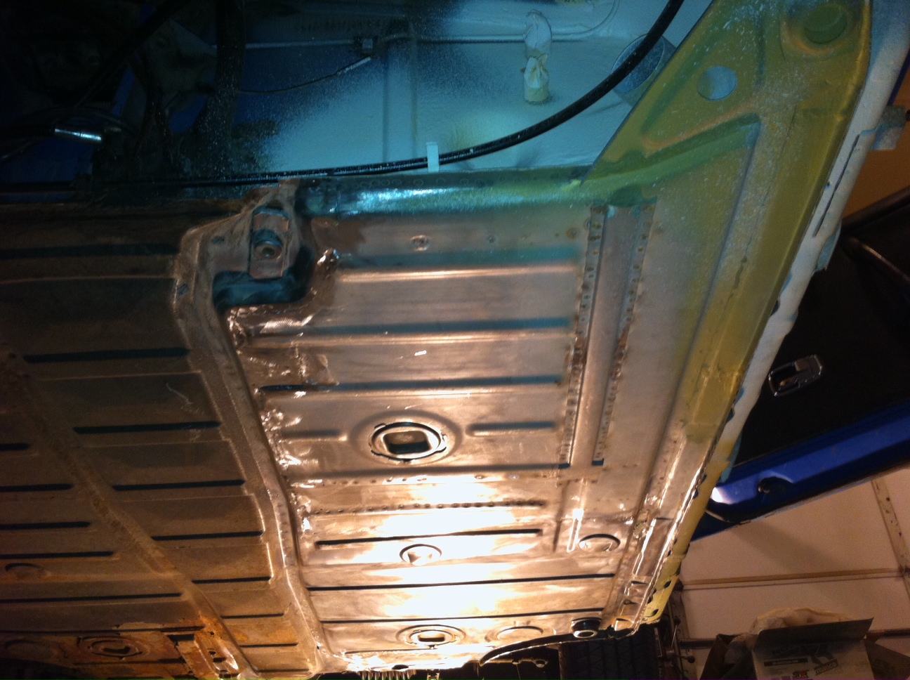 The welding is officially finished. The only real issue with the left floor pan was some holes through the reinforcements under the driver seat. I was going to try to plug weld the holes but changed my mind last minute.