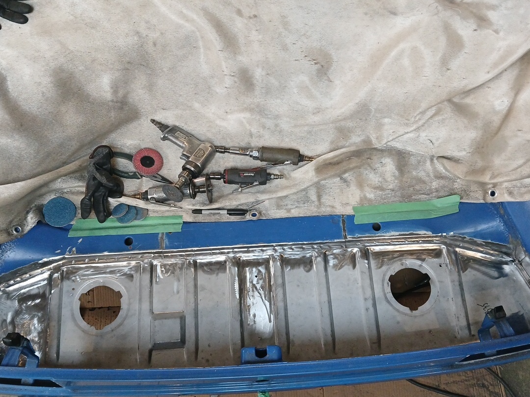 All the welding is finished. I used my Leno Spot Welder to face spot the floor flange tot he tail light panel. If there is any doubt the power this welder has you can see it smoked the paint on the outside of the panel. this is through the new flange and through the original flange I left in place. ![]() ![]() On to prepping for paint. I need to crawl under the car and clean and prep the back of the welds. (IMG:style_emoticons/default/dry.gif) The car was repainted once and the exterior color is lighter and I think a nicer shade of blue. I believe when I did the repairs back 2014 I matched the exterior color because I needed to blend the right door jamb to the exterior QP. I doubt I have paint left from the last time.. It's looking great, Rick. Can't wait to see your amazing workmanship up close next weekend. |