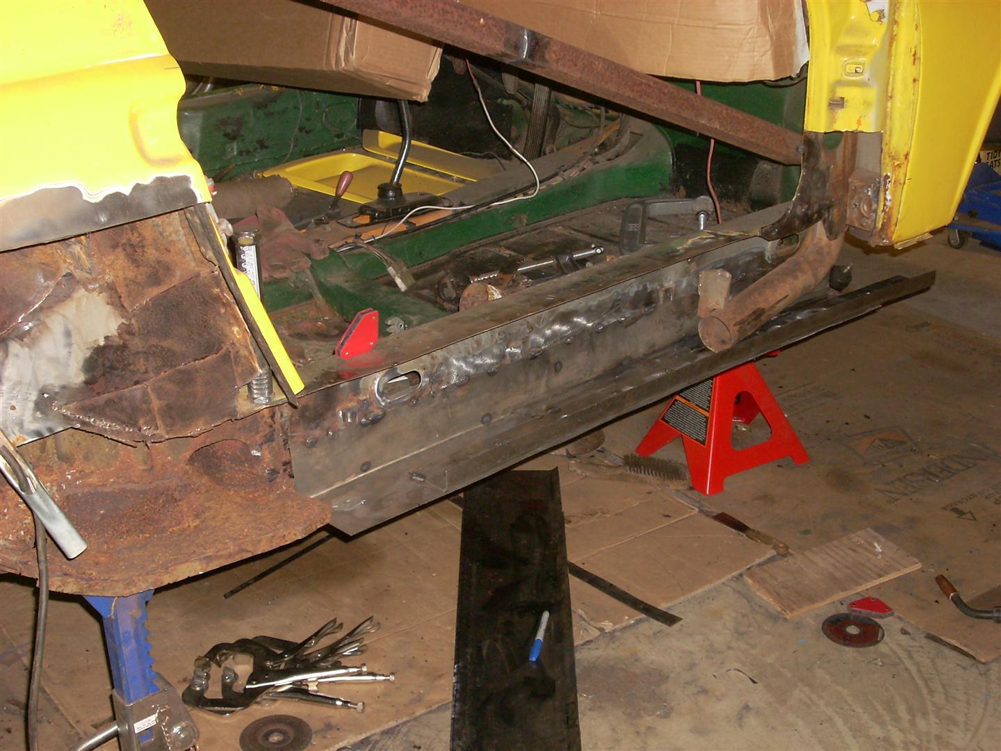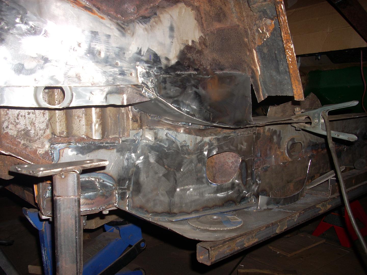 Terrific story and glad to see you are working towards your Ph.D - single biggest factor in being able to continue playing with our cars. I love seeing these cars go under the knife to repair their rusting bones. Best wishes and have fun restoring your lifetime friend. Thanks! (IMG:style_emoticons/default/smile.gif) The last pictures ended with about 60% of the right long pulled off and a whole bunch more metal cut out. Since the car was dimensionally-unstable at this point, the immediate need was to fix most of the structure. The next pictures show the first portion of the inner long fix. You'll notice that I'm not remaking the metal in exactly the same fashion as it was removed, it's actually about 12mm taller than the original cross-section and will have extra stiffening plates installed on the top and bottom faces. This modification increases stiffness more than an Engman kit (I'm tired now, but I'll write in the moment of inertial calculations later) without adding much additional weight (it's stiffness-to-weight efficiency is actually much better than Engman's and slightly better than the factory). It also has the added benefit of being essentially free since I'm making all of the pieces from sheet anyways. The oddly placed channel is for this buildup. When I get to posting the math details I'll also post a sketch of the new metal so everyone who wants can see how I'm adding it. The inner fender well repair panel needed to have a slightly odd end finish to match the frame rail end, but I think it came out pretty nicely. The rest of the pictures show some additional metal replacement at the engine mounts and hot air inlet duct section. Chances are these heater ducts will not come back in as originally intended and will instead become wire chase-ways for the ECU. The duct cutout in the new metal at duct inlet is funny looking (weird non-oval shape) since it has yet cut to the exact opening. The hell hole bottom wasn't too bad, but while in there seemed like a prudent replacement. That's all for now...so enjoy some pictures. (IMG:style_emoticons/default/smile.gif) |