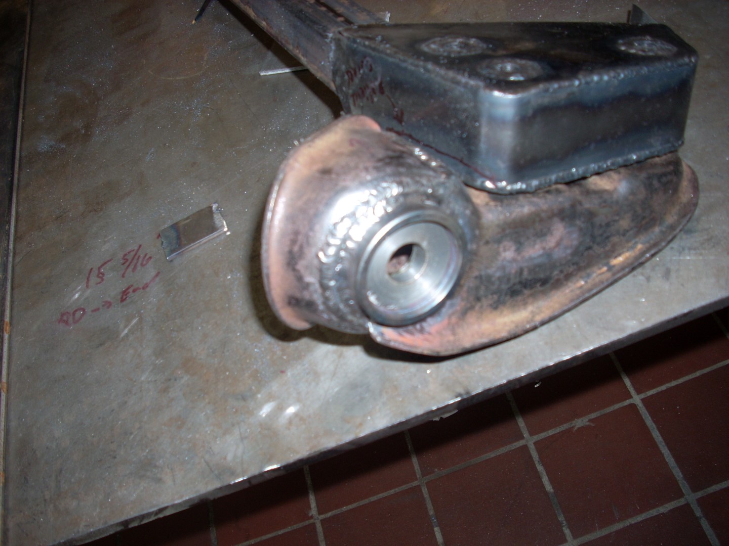 A few more pieces. I seam welded the trailing arm mounts and then machined 1.75" holes in them for my spherical bearing housings. I screwed up on the first one by not machining an insert to help it hold shape with all of the heat and warped it a bit which required a little honing. After making that mistake I turned an aluminum piece to pull heat out of the housing which seemed to work well. We'll see how the slightly out-of-round housing works out. The bearing pressed in OK, but I think I might make another one since we don't have a shortage of suspension mounts. (IMG:style_emoticons/default/laugh.gif)