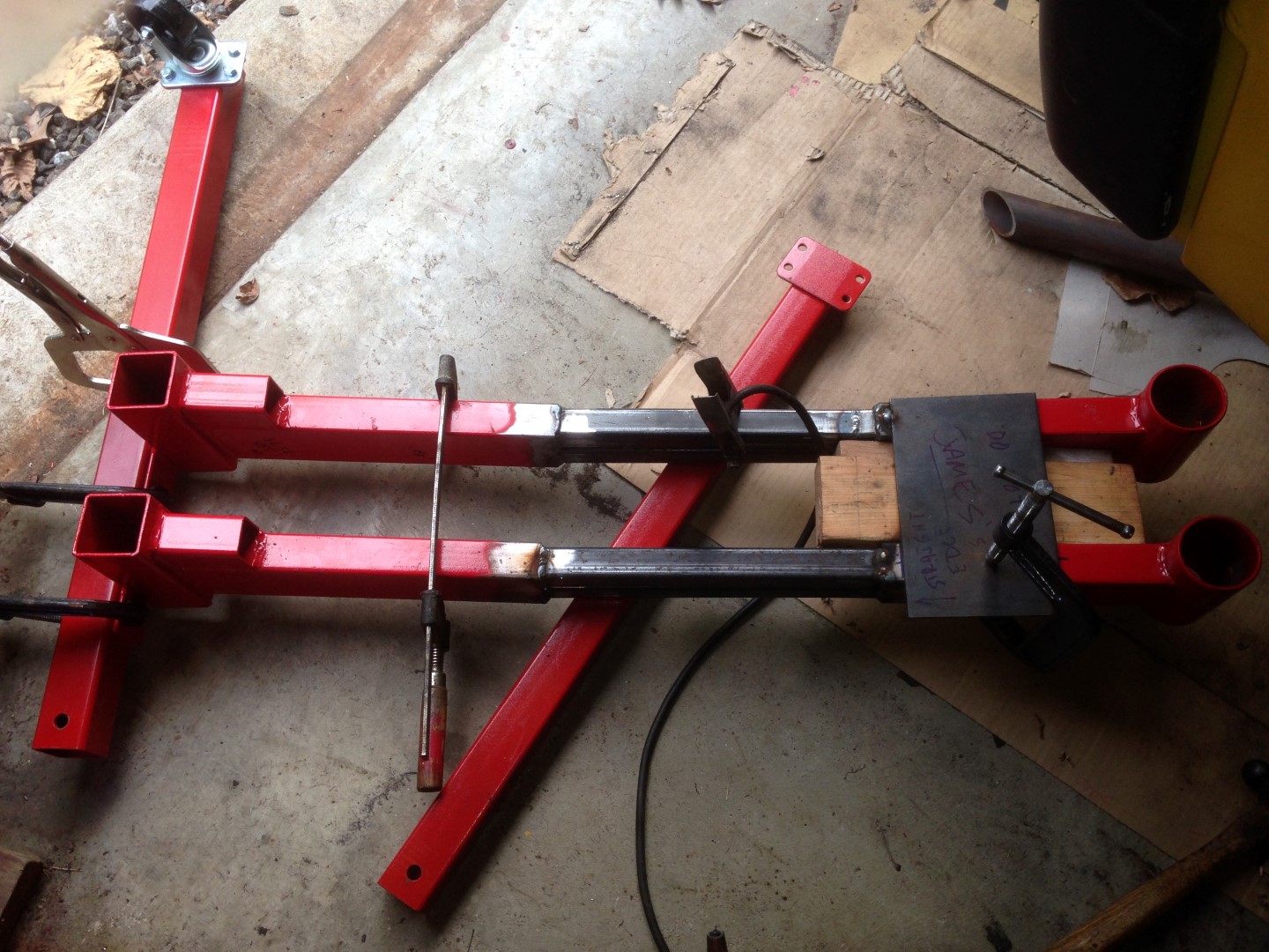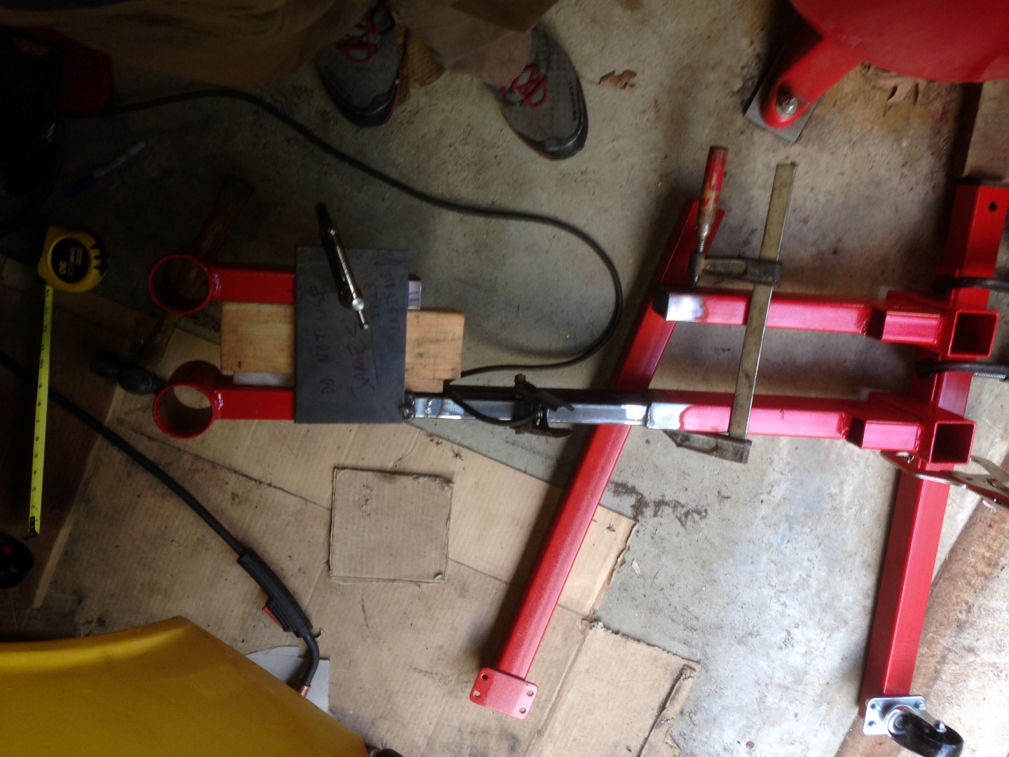 I've been spoiled by working on cars that don't require welding or painting upside down and decided to build a rotisserie to reduce the amount of overhead welding on all of the suspension mounts. This time around the whole bottom will be stripped, repainted, and undercoated which will also be nicer to do on a side. My goal is to make a quick and dirty one to not take much time away from the overall car build so I'm modifying 2 cheap engine stands to do the job. They don't have pivot bearings so hopefully the car won't be too hard to turn, but I guess I'll cross that bridge in a few weeks when loading it on. To try and avoid having the longest car build ever I'm trying to spend at least half a weekend day per week working just to make a little progress. (IMG:style_emoticons/default/laugh.gif) -------- First step was to cut apart the vertical leg, add about a foot of metal. This results in a pivot-to-bottom brace height of 38", giving about 3" of safety factor from the widest point of the car to brace. The pivot also needed to be made parallel to the bracing as the engine stand was tilted non-parallel. Next was to repeat the modifications on the second engine stand leg. After a whole bunch of hack fixture and a bit of welding the second stand was done too. Note that (2) pieces of 1.375" square x 0.1875 wall steel were used since I didn't have any of the correct 1.5x3x0.100" box beam. It should be plenty strong enough for a light car though. Next week's goal is to get metal to make the arms to attach to the bumper mounts, some cross bracing, and connect the 2 stands under the car. (IMG:style_emoticons/default/smile.gif) |