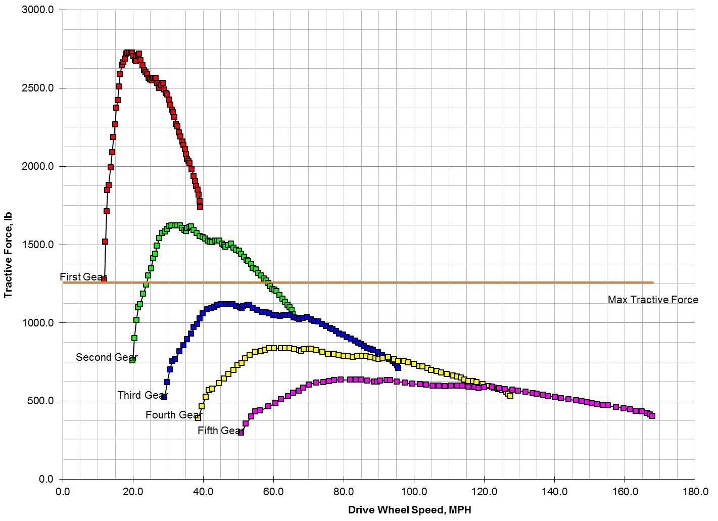 ![]() I've got feelers out now for a broken central diff in the local area so I don't have to ruin this one making a locker if it's in good shape. Good ones seem to go for $200-350 on NASIOC so selling this one would go pretty far in offset the overall transmission cost. Anyone here have a broken diff they'd be willing to let go for cheap? (IMG:style_emoticons/default/laugh.gif) (IMG:style_emoticons/default/biggrin.gif) The 2008-2014 WRX transmissions seem to be pretty stout units. Some threads on the Subie forums show their gear widths are greater than the early WRX transmissions and the case castings seem to be a little beefier too. Unfortunately, around here at least they are a bit more expensive than the older push-clutch Legacy, Impreza, etc. stuff. Right out of the box the gear ratios appear pretty well matched, though even with the 3.900 front diff first gear seems a little bit low. Ideal 1st gear is from an STi RA but those gears/main-shafts are super rare and priced accordingly. The plot below shows tractice force, or the actual power put through the tires into the ground, vs. vehicle speed for the 08-14 WRX transmission. It assumes a perfectly stock '05 Legacy GT power output (shown in the second plot). In terms of pure acceleration and drive efficiency, you want this curve to have a parabolic shape. The parabolic shape means that power to the ground is constant and at its maximum. As mentioned before, 1st is a little bit low, but it's going to stay that way forever probably. (IMG:style_emoticons/default/laugh.gif) The easiest way to make the in-gear traction numbers fit the overall traction parabola better is to shift the engine powerband up slightly and increase torque in the 4100-4600 rpm range. With some AVCS and boost tuning this shouldn't be too difficult. (IMG:style_emoticons/default/sunglasses.gif) One other thing to note is the red "max tractive force" line. This line is the most force the tires can handle and still retain traction. It's a pretty simplistic calculation just using CG, wheelbase, and an assumed single tire coefficient of friction which then calculates dynamic driving wheel weight and from that max sustainable tractive force. The number isn't correct since I'm just guessing CG, weight, etc. The tire friction coefficient is pretty questionable since I've never seen one for street tires (only slicks) and the fact that it's not taking into rotation speed or any lateral forces added by the suspension kinematics. It is useful to basically know first gear and the start of second are really just for burnouts! (IMG:style_emoticons/default/laugh.gif) The spreadsheet used for these calculations is attached is anyone wants to play with it. No guarantees on accuracy, though I believe everything is correct. The format was borrowed from something posted a long time ago on Pelican Parts by B. Smith (IIRC, unfortunately I never wrote down the source), but has been modified extensively. You can add different gear ratios in, I just only put in some common stuff. Check out the last page for some Subaru transmission information if you want to play around with different gears not listed in the list or personalize it to your transmission. Stock dyno plot (not mine, just from a local eddy current dyno) |