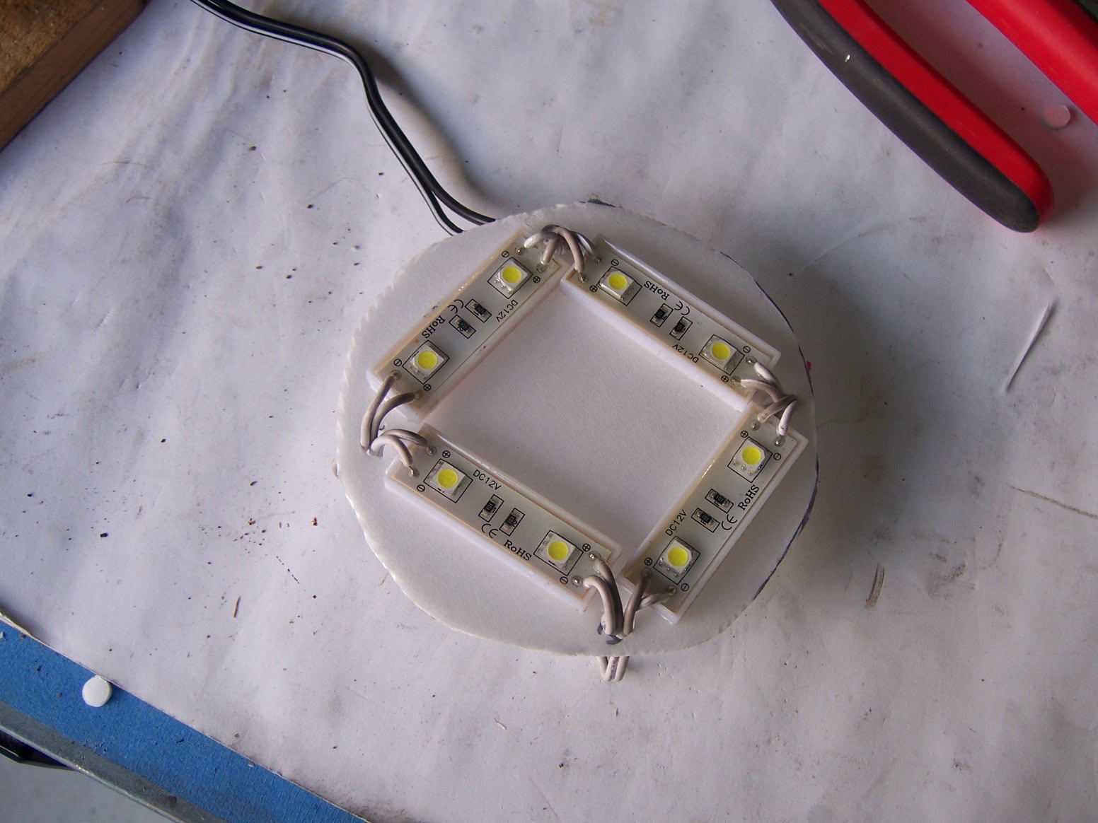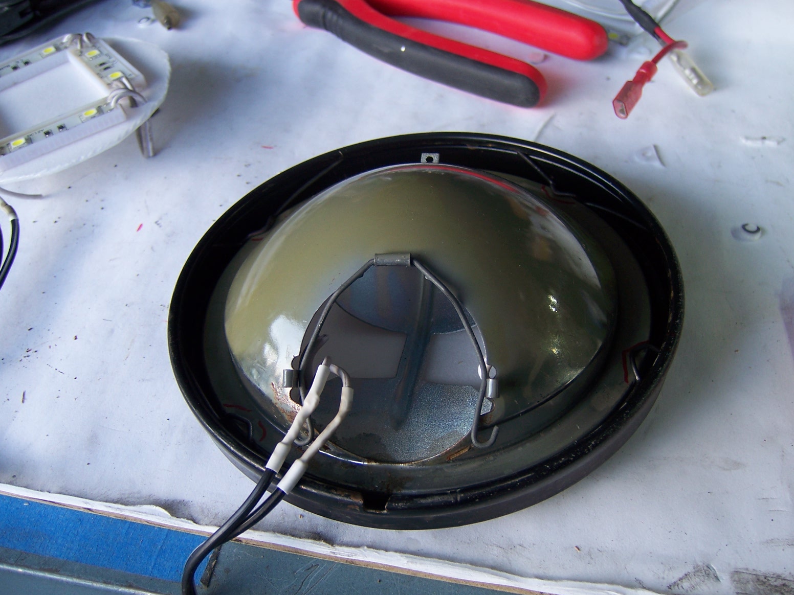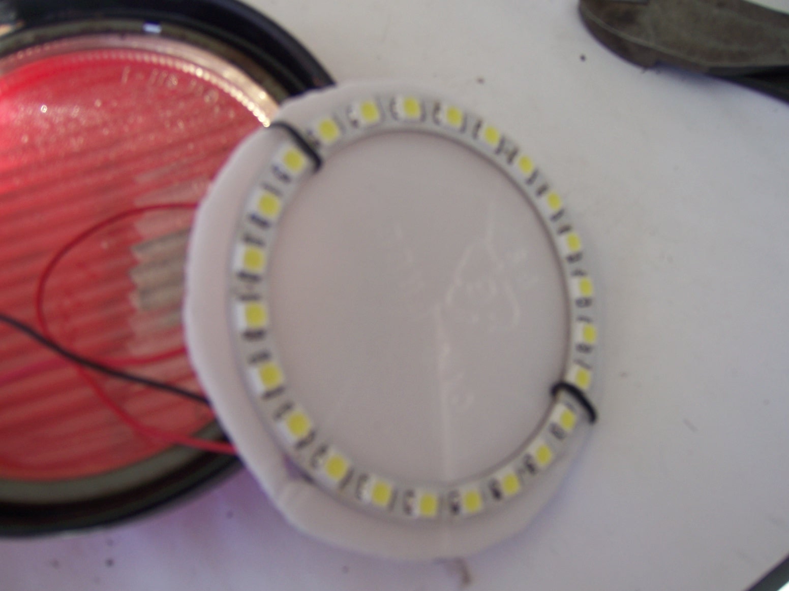 . I cut out some styrofoam discs (from a take out container) and placed the assembly into the fog light lenses, added some wiring, all WITHOUT cutting any of the OEM wiring. . check it out, one of the pics shows the driver's side bulb with the 35 watt incandescent, compared to the passenger side with the four SMDs. (IMG:style_emoticons/default/smile.gif) the pics are misleading. I had the camera flash off and it looks like a blaze, but in person, you see eight bright dots, of the same color as DRLs that you see on current Audis. I will try to add a better pic later. Attached thumbnail(s) |