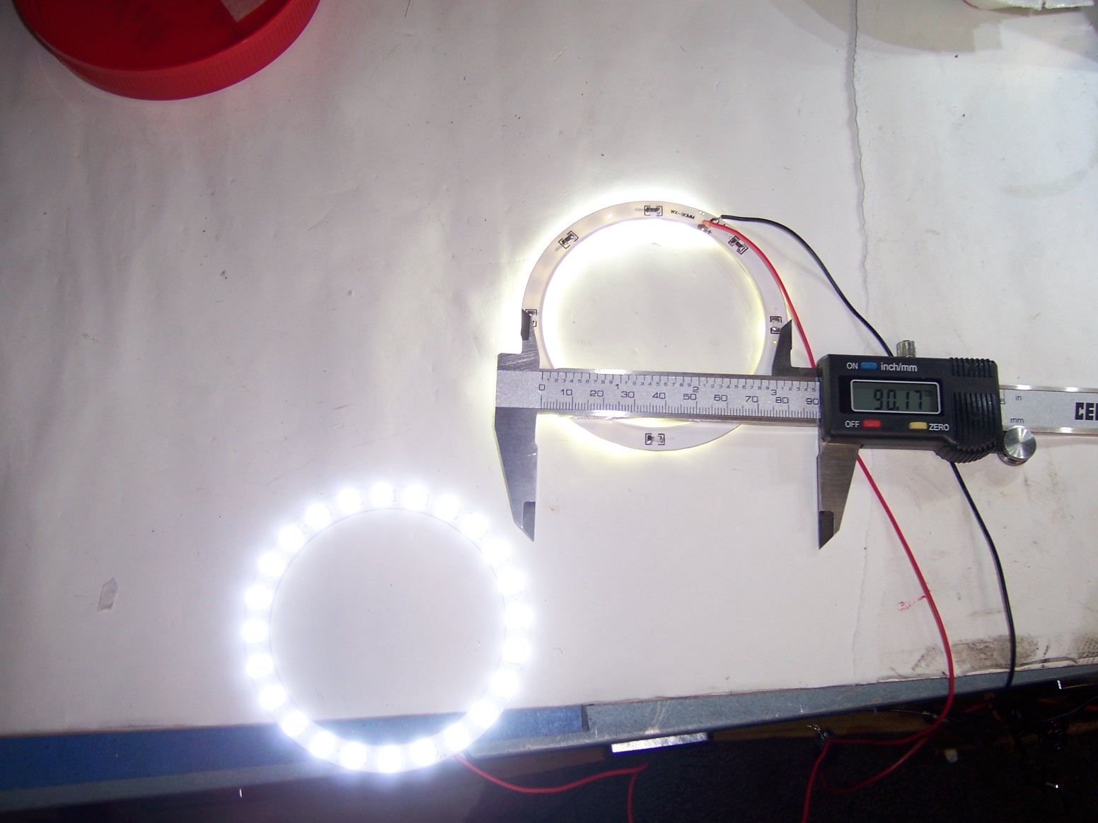 so I got this 90mm set of SMD 5050, that has 24 lites for $14 for the pair from eBay I installed them using that same piece of styrofoam that I used to mount eight of the SMD lites. I just did a swap out and now I really have a set of angel eyes. No I am not trying to be poser to look like a BMW. I just wanted to create a set of lites that will alert motorists of my presence when I come up behind them. I don't think they are annoying. Attached thumbnail(s) |
