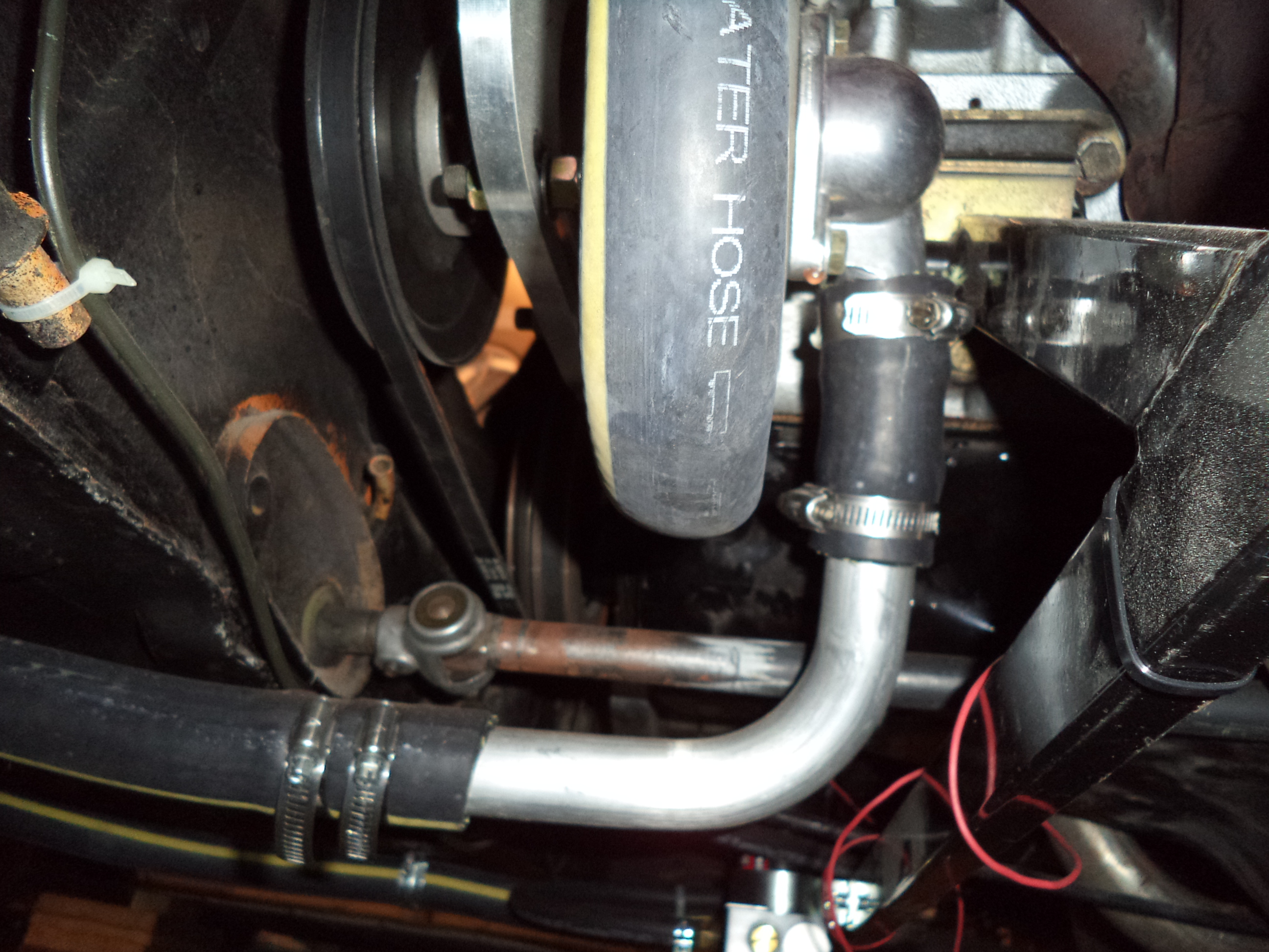 Ever since I did my SBC conversion, I've never been happy with the sharp turn the 1 1/4 gate hose had to take from the water pump to follow the bottom of the car. When the hose is cold the turn actually causes the hose to kink, but once the pump pressurizes the system the hose fills out and unkinks.