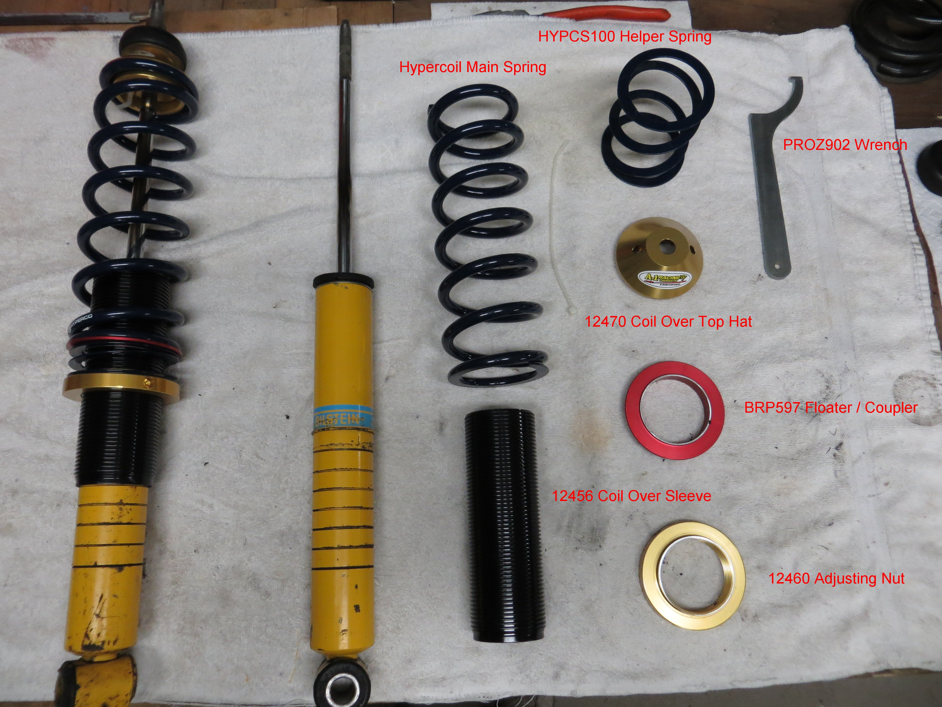 Zero rate helper spring keep the main spring pressed against its perches when jacking up the vehicle or any time the suspension is fully extended. These helpers are usually needed when running a spring rate higher than 150 pounds (in a 914), otherwise the back end of the car will be too high. Below is a parts list, visual parts list, and video of how it all goes together. The part numbers listed are specific to A-1 Racing's website. This is one of many ways to get to an easily adjustable suspension setup. Main spring rate will depend on your driving style and intentions for your car. Note that part numbers BRP597 and 12460 have been modified slightly to allow for full compression of the helper spring. If not modified, the floater will contact the adjusting nut before the helper spring is fully compressed causing all of the force from the main spring to press against the thin aluminum coupler. The coupler will fail. The floater / coupler does go on the bottom. Otherwise, the helper and main spring will have no lateral support. As with any modification, proceed with caution. If you don't know what you're doing, STOP and find someone who does. (IMG:style_emoticons/default/bye1.gif) Parts List: 12456 - Threaded Coil Over Sleeve 7" (qty 2) 12460 - 2-1/2" Coil Over Adjusting Nut (qty 2) 12470 - 2-1/2" Non-Slotted Coil Over Top Hat (qty 2) BRP597 - Coil Over Spring Floater / Coupler (qty 2) PROZ902 - Coil Over Adjustment Wrench (qty 1) HYPCS100 - Hypercoil Zero Rate Helper Spring (qty 2) HYP1810B - Hypercoil Main Spring (qty 2) - you must select the spring load https://www.youtube.com/watch?v=SGIrZ1sJVdc |