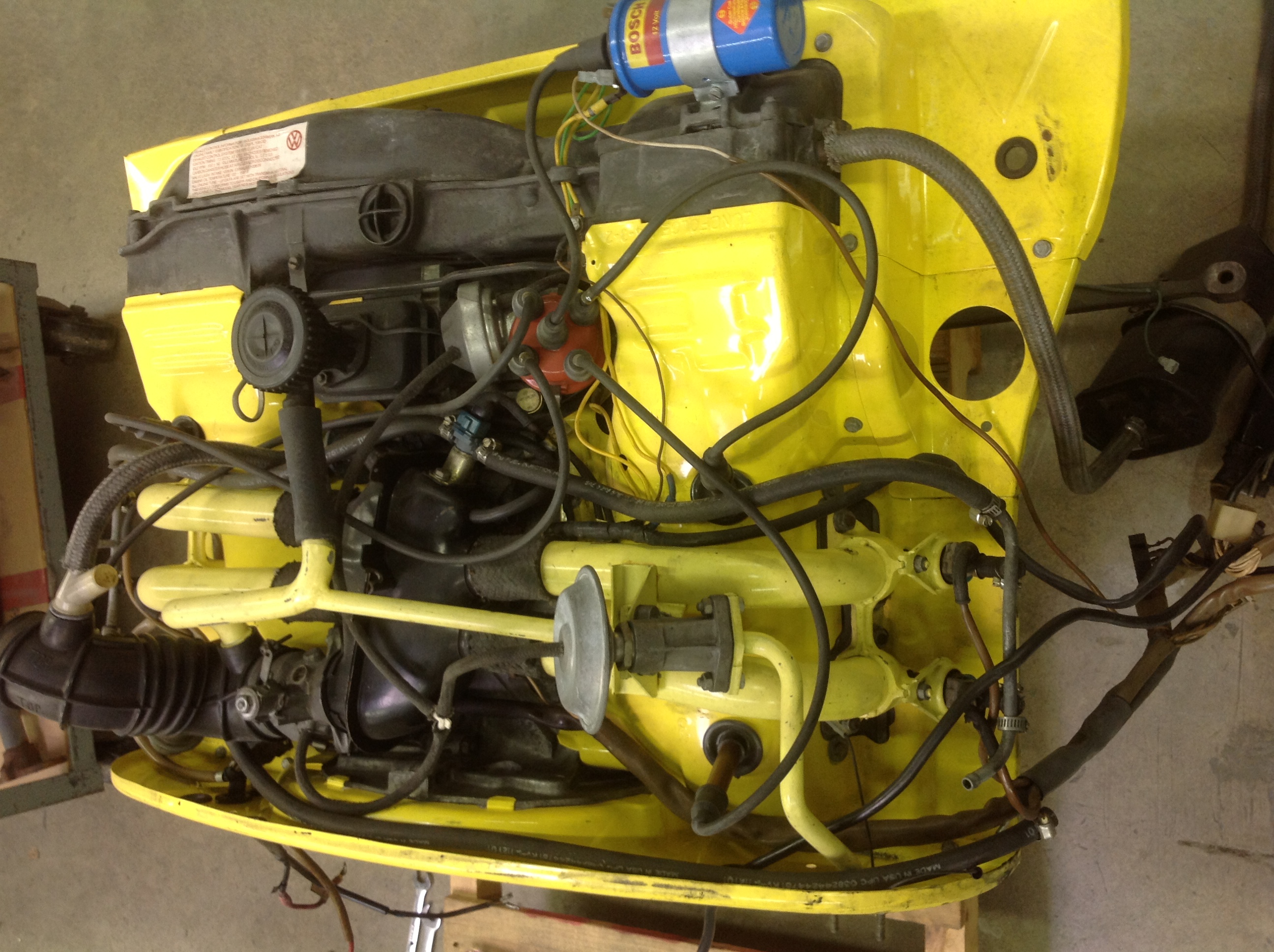 Rebuilt in 2000 or so due to a stripped spark plug thread, put less than 5000 miles then put car into storage, has been sitting in climate controlled warehouse since. Engine fired and ran approx. 1x per month, then removed from car about 5 years ago, hand turned every few months thereafter. Ran great when stored, reason for sale is that my car is undergoing a very slow 6 conversion. I'm calling this a core because it's been sitting for so long, it should be gone through and dusted off. It comes with everything as pictured, no exhaust and no engine mount cross bar. Fan has at least one blade missing due to a bonehead maneuver by me while hand turning engine. No compression or leak down numbers as it's been sitting a while. Just about all the parts were purchased from GPR and Pelican. Some specs that I found from receipts: 94mm Euro Mahle pistons and cylinders 8:1 compression Used crank and rods: inspected good and matched at GPR, new bearings and bolts were used for rebuild New solid lifters New (mild) camshaft GPR p/n: 021109021F (as recommended by GPR) All new bearings, seals/gaskets, pushrod tubes Heads were rebuilt by Tuttle's Parts Exchange in Baldwin Park, CA (he rebuilt my 1.8L heads at my request vs an exchange). Spark plug hole welded and repaired, checked for cracks and repaired. New valve guides, checked reground valves an necessary/springs checked mating surfaces and decked as necessary. Tins are powder coated yellow, in great shape, no rust, cracks/tears in metal (that I know of) Resurfaced flywheel with new ring gear, rebuilt injectors, new starter, rebuilt alternator, new thermostat (spring type) all have less than 7k miles. I'd rather sell as a whole unit, but if I don’t' get any activity I'll start disassembly for part out. Let me know if you have any additional picture requests, but it might take a few days as it's not at my house. I'll be happy to ship, but buyer needs to arrange details as I really don't know where to start with that. |
