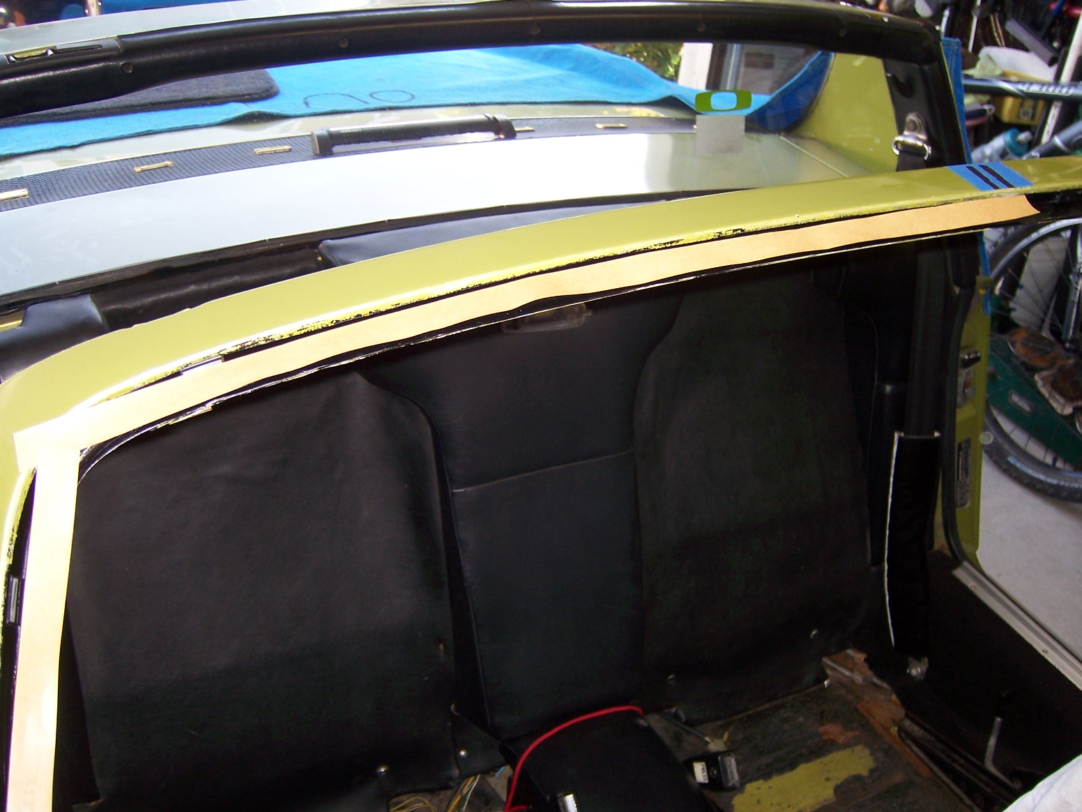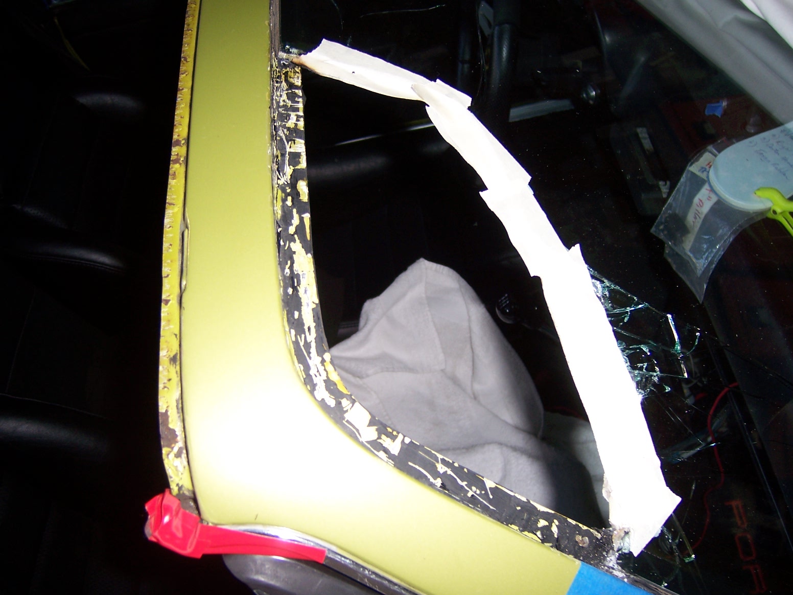 Safety first, since I tried to artfully get a cutting tool under the sealant, the glass broke and had to purposely fracture and pull foot sized planks of glass with channel locks and needle nose pliers. Safety glasses, heavy leather gloves, and the wet dry vac were constantly at my side. Those fragments and shards of crystal fly all over the place when they are tugged out. I also removed the entire carpets, seats, and all targa rubber seeing how the glass like to fracture and pop bits everywhere. Prior to starting, I documented the position of the rear view mirror mount.