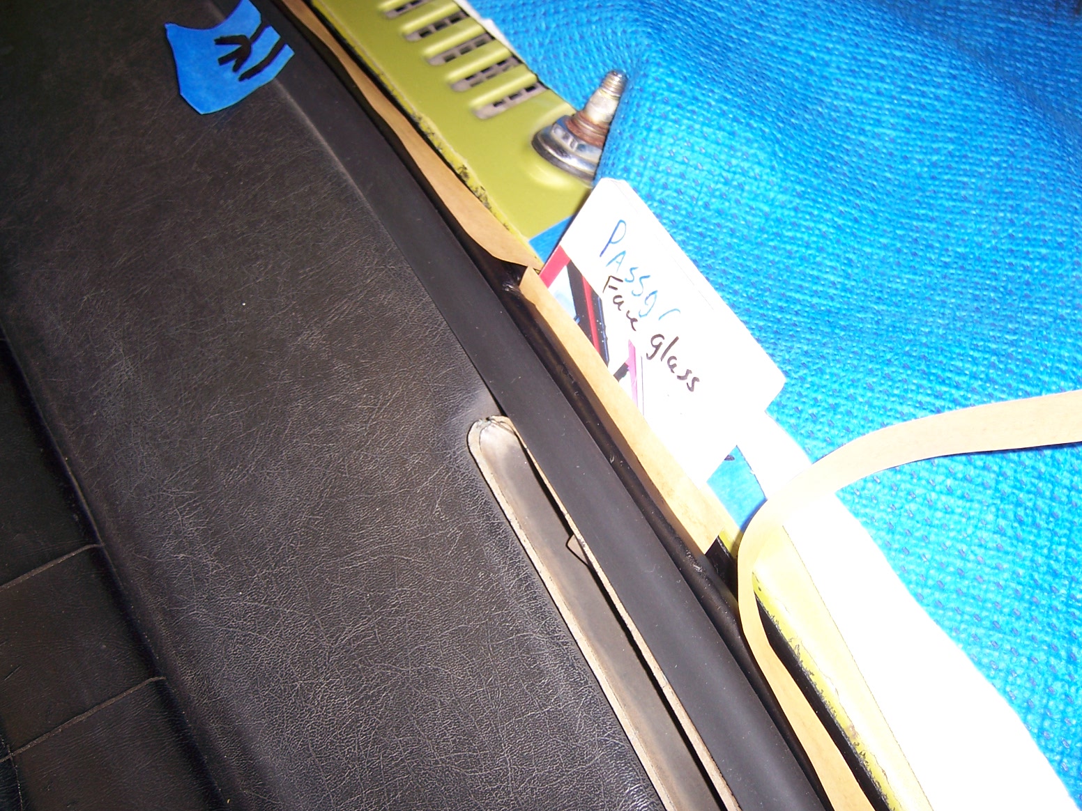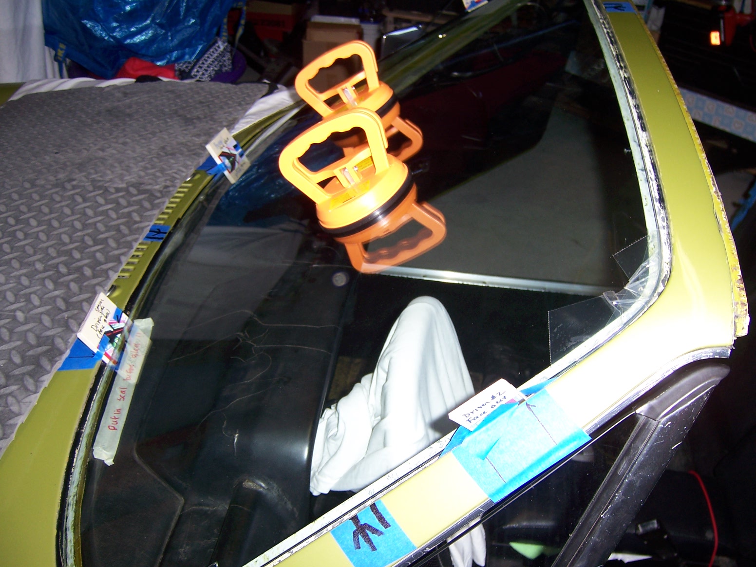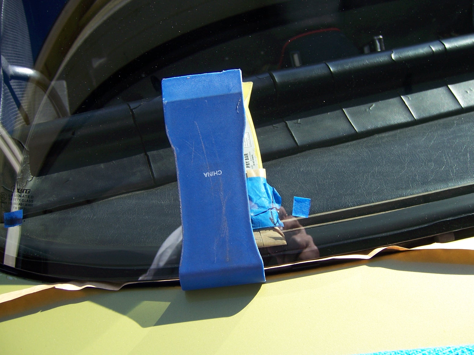 all told, it took me a little less than 30 days to change a windshield, but that was my plan, to be methodical. And this was a one-man installation, designed to be completed by one person, besides, so we can say we did it all solo. Phase 1. Get some tools, remove the trim and take the glass out. In this thread, most if not all the tools came from Harbor Freight (HF). First I bought that "L" shaped tool, the one that comes with two cylindrical aluminum bars and the "L" shaped blade. I also got and the HF pack of metal trim removal tools to remove the trim. After I removed the trim, I used a 16" channel lock to bend the clipping points back to be nice and square. I artfully tried taking the glass out for resale, but not luck there. So you see I broke a corner to try to get the "L" tool in there. No luck. I learned that the glass was previously installed with urethane and hence it was caulked in very tight. I did not want to spend $20 for the windshield wire cutting kit from HF, so I bought six feet of 1/32" stainless wire from Orchard supply for less than $3. All six feet of that wire was consumed. Add a pair of vise grips and using the pull technique, I was able to cut the urethane and free the glass in one or two foot squares, if you could call it that. That process of glass removal took about three or four sessions lasting about an hour each. After cutting the urethane, I leveraged out the glass to free. The old bed of urethane was not slicing out easily with a utility or Xacto knife, so I got a HF kit of sanding disks and attached those tiny grinding discs and power drill to grind off the urethane to bare metal. All the old plastic clips were replaced. LEARNING POINT: Trim tool unnecessary, CUT the clips off using utility blade. . Phase 2. I picked up the new glass from ProSource Glass International for the out the door price of $195. I bought a pair of the orange suction cups from HF and used these to aid me in the dry fitting of the glass. I weighed the glass on a postal scale and it weighs 328 ounces, i.e. 20.5 pounds. The circumference of the glass is 145 inches. (The box of 3M butyl tape is 180 inches) Prior to dry fitting the glass, I made stacked decks of plastic cards as spacers, two on the bottom and a pair of spacers two thirds of the way up on the sides. These were taped in place. There is basically no play, so the glass can not be positioned incorrectly on final fitment as long as the spaces stay firmly in place, not in the way of the butyl. Whenever I carried the glass to the frame, I always carried it by the glass edges, even though the suction cups were locked on. The caveat is that these $4 suction cups are only trustworthy for positioning, NOT CARRYING. Admittedly, I did suspend the glass over the workbench solely to see if they could do the job; they can. So in a pinch, you really could trust them, but I did not want to gamble with the $200 new glass. Also, I learned that when you use the suction cups, you must be certain the two handles are tightly clamped against one another with NO space between the handles in the carry position. By using the four engineered plastic spaces on the periphery of the pinchweld frame, the new glass is forced to fall into place, centered top to bottom and left to right. After being satisfied with fitment using the four spacers, I removed the glass and laid it on the workbench on two chunks of foam. Phase 3. I taped off the pinchweld with regular masking tape and used a "dauber" to paint on the pinchweld primer. After masking the pinchweld off, it takes about 3 minutes to daub the entire pinchweld with the primer. After the primer dried, I installed the 19 new trim clips. I took a socket and used the female end of a 1/4" extension to bed the clip flush to the pinchweld frame. I then used a plastic drift and drove in the the retaining pin on each of the 19 clips. In the pics, you will see the tape with arrows, and these are redundant since the four plastic spacers already guides the glass into the correct position. Phase 4. I laid the 3M brand 5/16" butyl bead down. The front dash to window seal is installed prior to the butyl. I snipped off the first inch or so of the butyl to get a consistent round bead of butyl. I got the butyl from Rich Bontempi at HPH and he said to start the bead at top center. I unfurled the bead in a counterclockwise direction. When I made a turn, I cut the paper, then continued on. I tried to lay the slightly flattened surface of the butyl and make turns, but found that it was best just to let to unfurl and follow the pinchweld contour however the rope unfurled, hence, avoiding to have to lift up and repositioning, risking a thinning of the bead. I then used strips of the paper liner to make an modify some wedging tools. After the bead was completely laid, I used some of the butyl paper liner as an insulator for the lower spacer blocks. I introduced the lower blocks using a bit of the paper to prevent the butyl from touching the spacer block surfaces. Phase 5. Glass mounted. I presented the glass onto the butyl from a standing position inside the compartment. The plastic spacers did their job, but the paper on the bottom spacers kind of almost got inbedded on the mating surface. I got a pair of plastic tweezers and pulled out the slips of liner paper, then I gently pressed all around the edges of the new glass using the my open palm hands initially, then using the suction cups as "press pads" all around. There was a 100 % "contact bead" all around, but in some places the bead seemed to be only about 1/4" wide. In those places, I coated the chisel edges of the HF upholstery/body tools I had and used them as a spudgers. On the outside, I would keep the spudger in place and from the inside I would push on the butyl bead to smush the butyl, pushing on the bead from both sides at once. I was able to make the butyl squish up and make a wider contact patch by this technique. Phase 6. Aluminum trim installed. No secret he