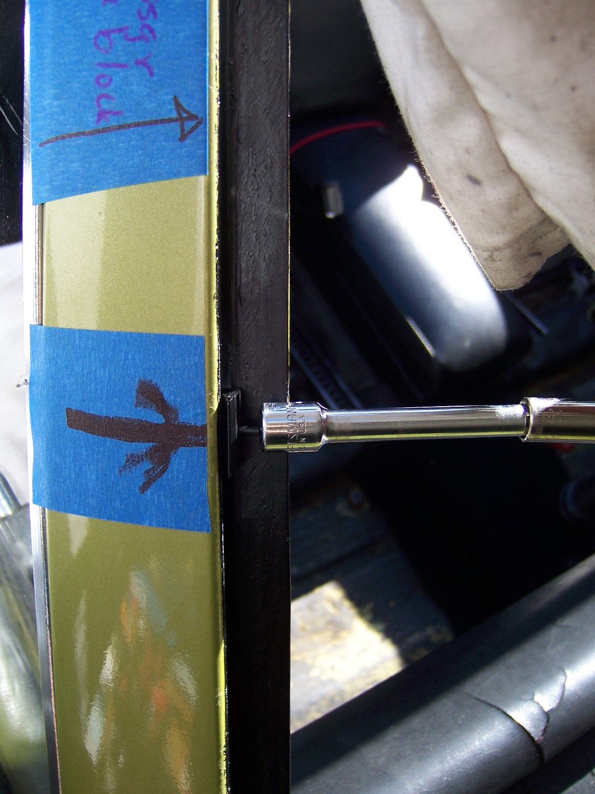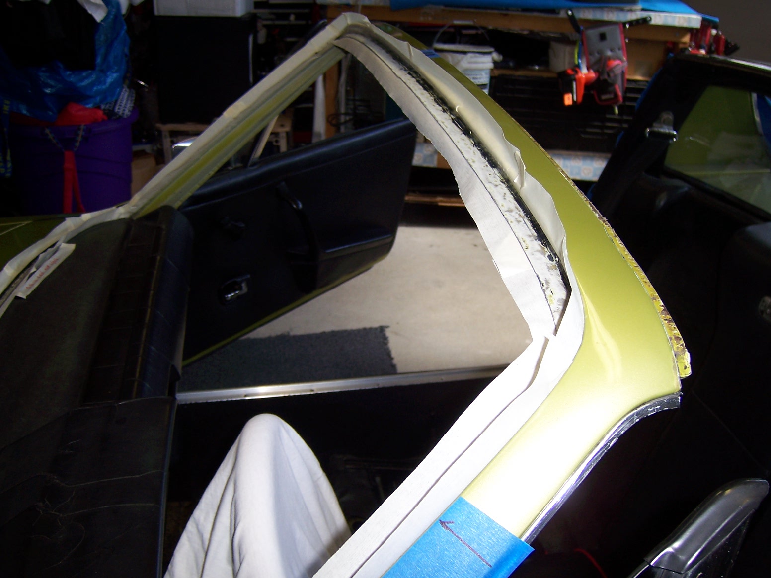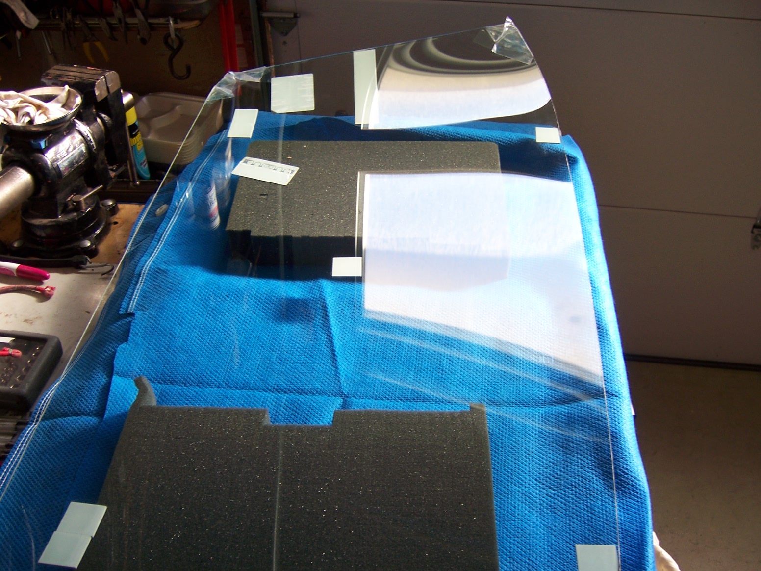 all told, it took me a little less than 30 days to change a windshield, but that was my plan, to be methodical. And this was a one-man installation, designed to be completed by one person, besides, so we can say we did it all solo. Phase 1. Get some tools, remove the trim and take the glass out. In this thread, most if not all the tools came from Harbor Freight (HF). First I bought that "L" shaped tool, the one that comes with two cylindrical aluminum bars and the "L" shaped blade. I also got and the HF pack of metal trim removal tools to remove the trim. After I removed the trim, I used a 16" channel lock to bend the clipping points back to be nice and square. I artfully tried taking the glass out for resale, but not luck there. So you see I broke a corner to try to get the "L" tool in there. No luck. I learned that the glass was previously installed with urethane and hence it was caulked in very tight. I did not want to spend $20 for the windshield wire cutting kit from HF, so I bought six feet of 1/32" stainless wire from Orchard supply for less than $3. All six feet of that wire was consumed. Add a pair of vise grips and using the pull technique, I was able to cut the urethane and free the glass in one or two foot squares, if you could call it that. That process of glass removal took about three or four sessions lasting about an hour each. After cutting the urethane, I leveraged out the glass to free. The old bed of urethane was not slicing out easily with a utility or Xacto knife, so I got a HF kit of sanding disks and attached those tiny grinding discs and power drill to grind off the urethane to bare metal. All the old plastic clips were replaced. LEARNING POINT: Trim tool unnecessary, CUT the clips off using utility blade. . Phase 2. I picked up the new glass from ProSource Glass International for the out the door price of $195. I bought a pair of the orange suction cups from HF and used these to aid me in the dry fitting of the glass. I weighed the glass on a postal scale and it weighs 328 ounces, i.e. 20.5 pounds. The circumference of the glass is 145 inches. (The box of 3M butyl tape is 180 inches) Prior to dry fitting the glass, I made stacked decks of plastic cards as spacers, two on the bottom and a pair of spacers two thirds of the way up on the sides. These were taped in place. There is basically no play, so the glass can not be positioned incorrectly on final fitment as long as the spaces stay firmly in place, not in the way of the butyl. Whenever I carried the glass to the frame, I always carried it by the glass edges, even though the suction cups were locked on. The caveat is that these $4 suction cups are only trustworthy for positioning, NOT CARRYING. Admittedly, I did suspend the glass over the workbench solely to see if they could do the job; they can. So in a pinch, you really could trust them, but I did not want to gamble with the $200 new glass. Also, I learned that when you use the suction cups, you must be certain the two handles are tightly clamped against one another with NO space between the handles in the carry position. By using the four engineered plastic spaces on the periphery of the pinchweld frame, the new glass is forced to fall into place, centered top to bottom and left to right. After being satisfied with fitment using the four spacers, I removed the glass and laid it on the workbench on two chunks of foam. Phase 3. I taped off the pinchweld with regular masking tape and used a "dauber" to paint on the pinchweld primer. After masking the pinchweld off, it takes about 3 minutes to daub the entire pinchweld with the primer. After the primer dried, I installed the 19 new trim clips. I took a socket and used the female end of a 1/4" extension to bed the clip flush to the pinchweld frame. I then used a plastic drift and drove in the the retaining pin on each of the 19 clips. In the pics, you will see the tape with arrows, and these are redundant since the four plastic spacers already guides the glass into the correct position. Phase 4. I laid the 3M brand 5/16" butyl bead down. The front dash to window seal is installed prior to the butyl. I snipped off the first inch or so of the butyl to get a consistent round bead of butyl. I got the butyl from Rich Bontempi at HPH and he said to start the bead at top center. I unfurled the bead in a counterclockwise direction. When I made a turn, I cut the paper, then continued on. I tried to lay the slightly flattened surface of the butyl and make turns, but found that it was best just to let to unfurl and follow the pinchweld contour however the rope unfurled, hence, avoiding to have to lift up and repositioning, risking a thinning of the bead. I then used strips of the paper liner to make an modify some wedging tools. After the bead was completely laid, I used some of the butyl paper liner as an insulator for the lower spacer blocks. I introduced the lower blocks using a bit of the paper to prevent the butyl from touching the spacer block surfaces. Phase 5. Glass mounted. I presented the glass onto the butyl from a standing position inside the compartment. The plastic spacers did their job, but the paper on the bottom spacers kind of almost got inbedded on the mating surface. I got a pair of plastic tweezers and pulled out the slips of liner paper, then I gently pressed all around the edges of the new glass using the my open palm hands initially, then using the suction cups as "press pads" all around. There was a 100 % "contact bead" all around, but in some places the bead seemed to be only about 1/4" wide. In those places, I coated the chisel edges of the HF upholstery/body tools I had and used them as a spudgers. On the outside, I would keep the spudger in place and from the inside I would push on the butyl bead to smush the butyl, pushing on the bead from both sides at once. I was able to make the butyl squish up and make a wider contact patch by this technique. Phase 6. Aluminum trim installed. No secret he