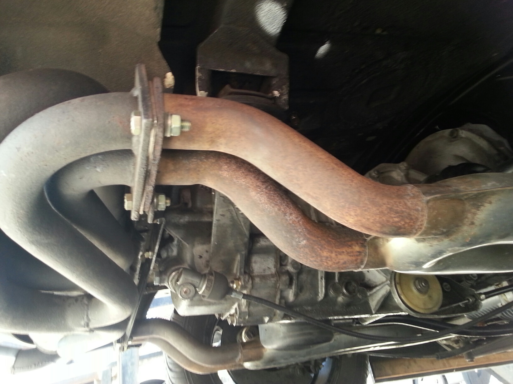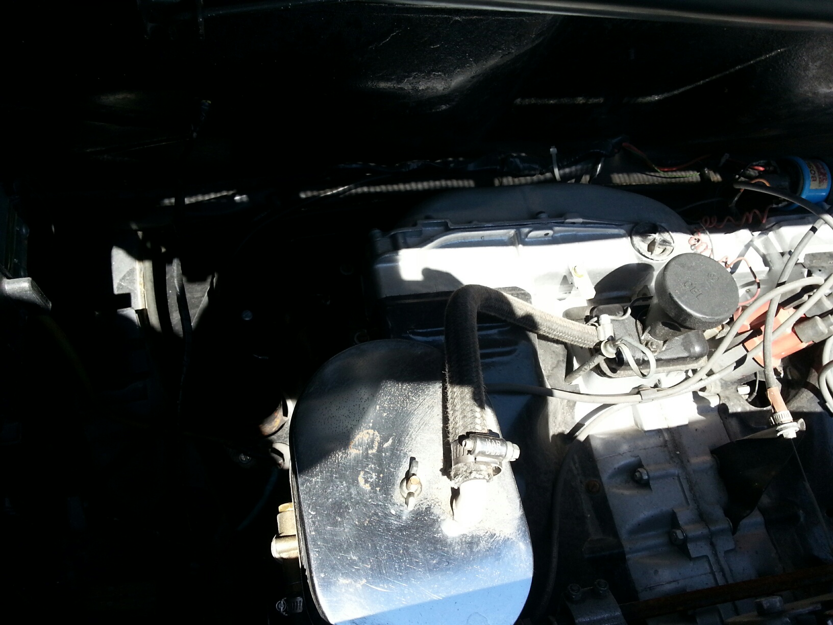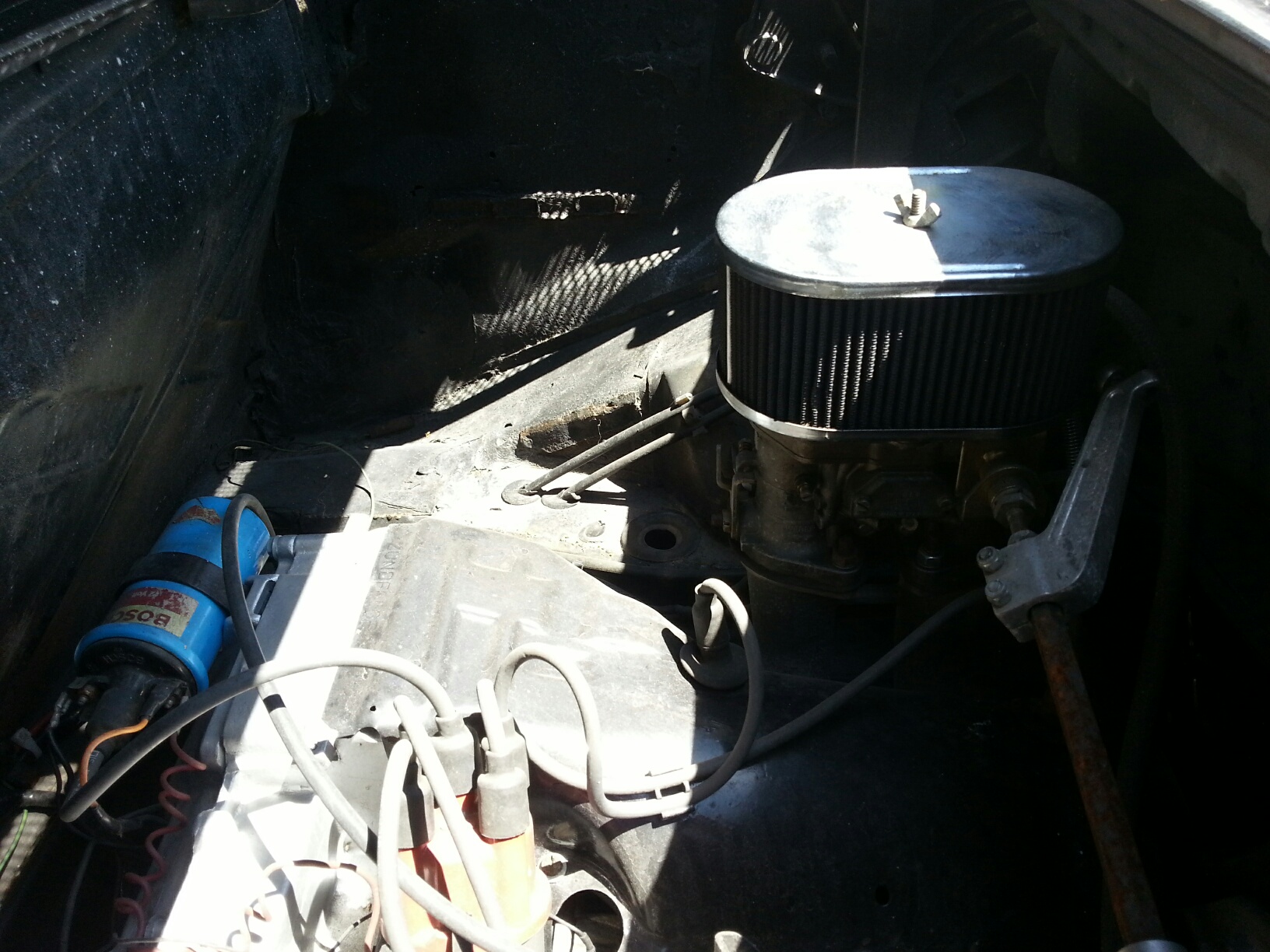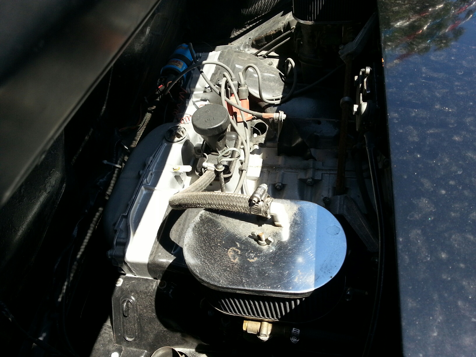 #1-SSI ht xchngrz....1.7/1.8 #2-exhaust either newer or repainted #3-Cheapo rear shocks.. #4-new/replaced carpet.. #5-the sail vinyl is missing... #6-a Cali car would have the 'bumperett's..... Sooooo all n all...points to a once attempted resto.... some observations though.. the tranny is wayyyy to clean.. possible rebuild..(check for oil under car).. same with the motor...heads are really clean.. I guess some doc's on stuff would be grand... And get it up in the air.... get the VIN off the car and the engine #... Is all of the injection stuff still avail?? AND drive it for Giggles!! Have fun...my take would be 4 to 5 G...... yeah would need to see it in person... but quite a bit has been done to it.. |
