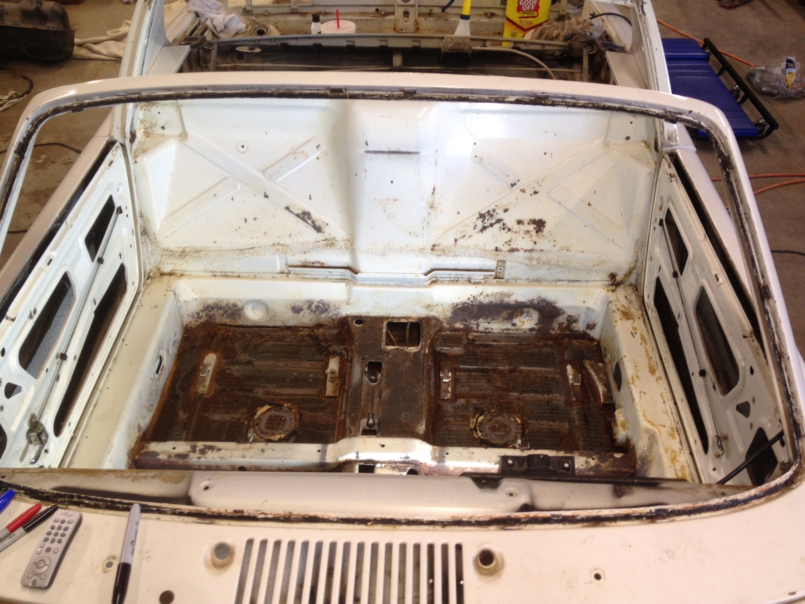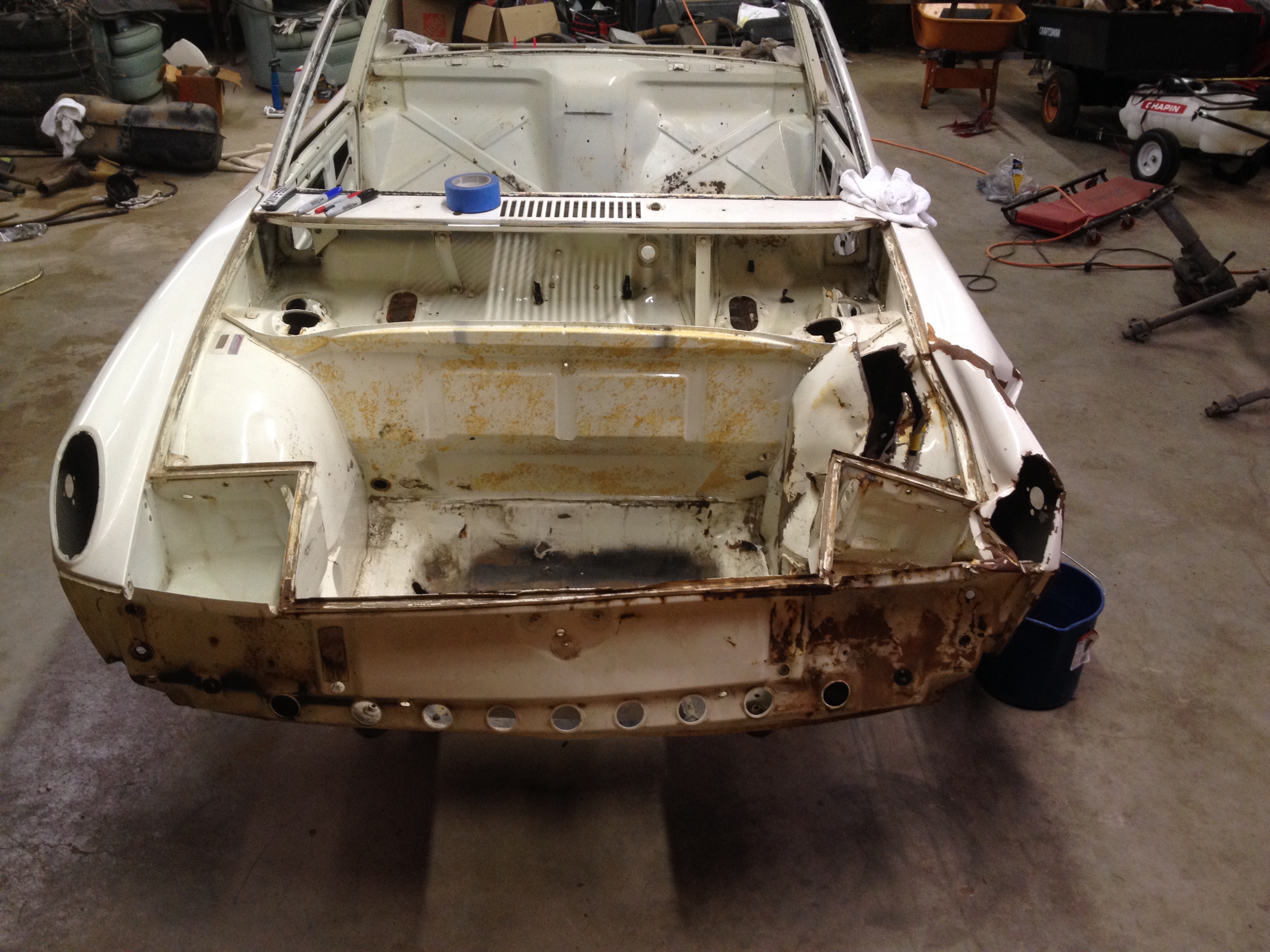 Now, since I promised I wouldn't spend any money on this restoration until I knew what I was in for, I've spent the last two weeks doing free things. I got the car down to just the body shell: And completed what I hope is the WORST job about restoring a 914 - removing the tar mats and trim adhesive from the interior: Had the opportunity to pick up the parts car this afternoon: She's pretty rough, and was originally Marathon Blue Metallic: One nice surprise was finding these in the trunk: It's a '74, and I think a 1.7. The intake setup is a kind of goofy custom job, but the heat exchangers look relatively new. Will 1.7 heat exchangers work on a 2.0? My goal is to have this project complete by 22 Aug of next year, so I'd like to thank you all in advance for the upcoming help and advice. |