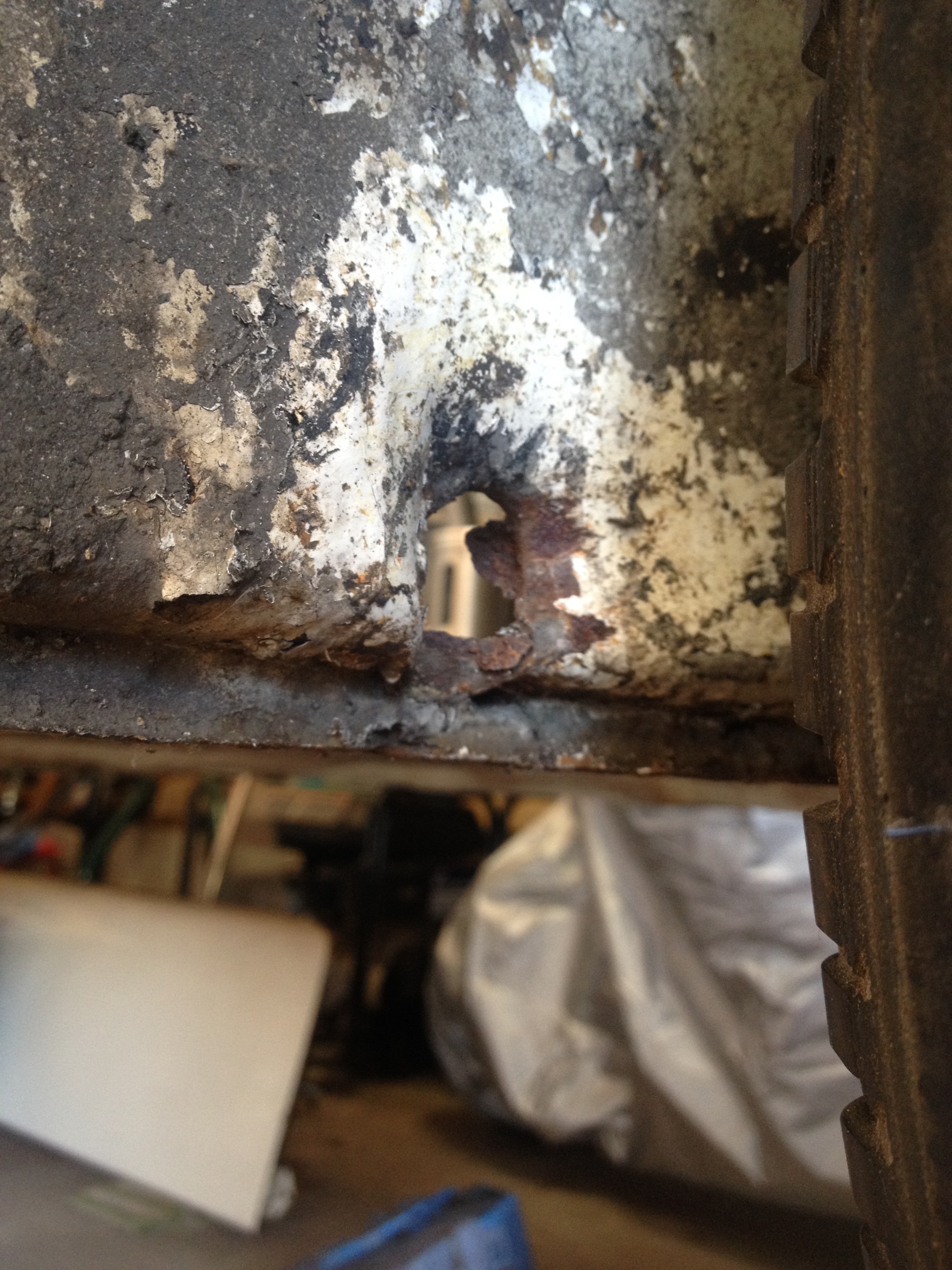 Today I discovered what looks like old damage induced by a spike or other sharp object. This is inside the front right fender. The hole goes clear through to the passenger foot well.