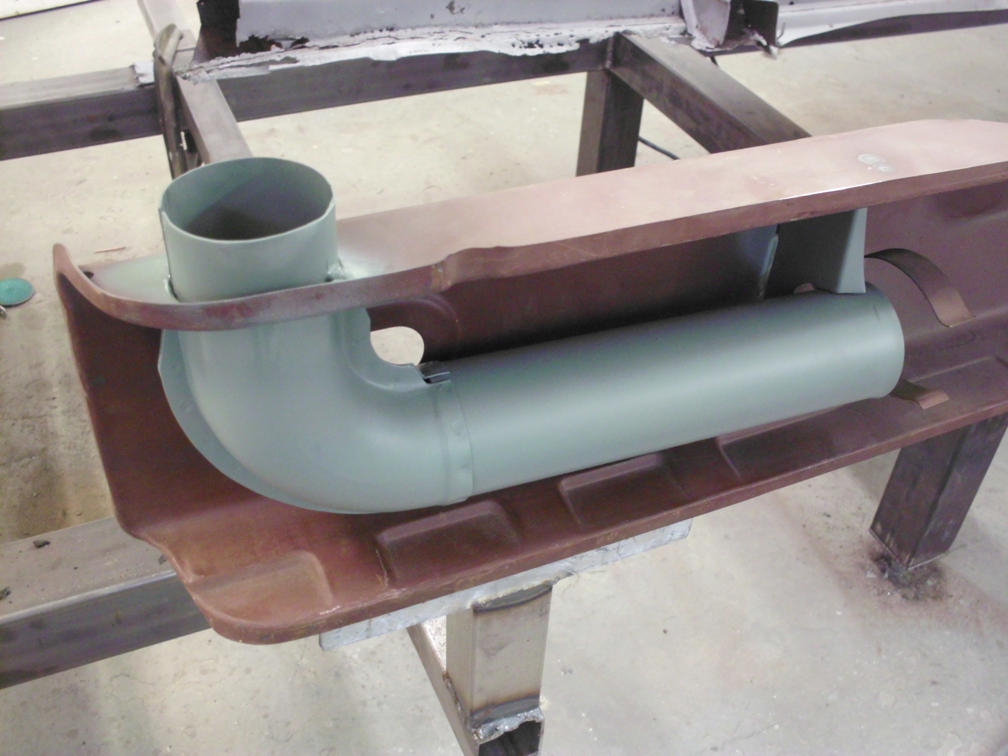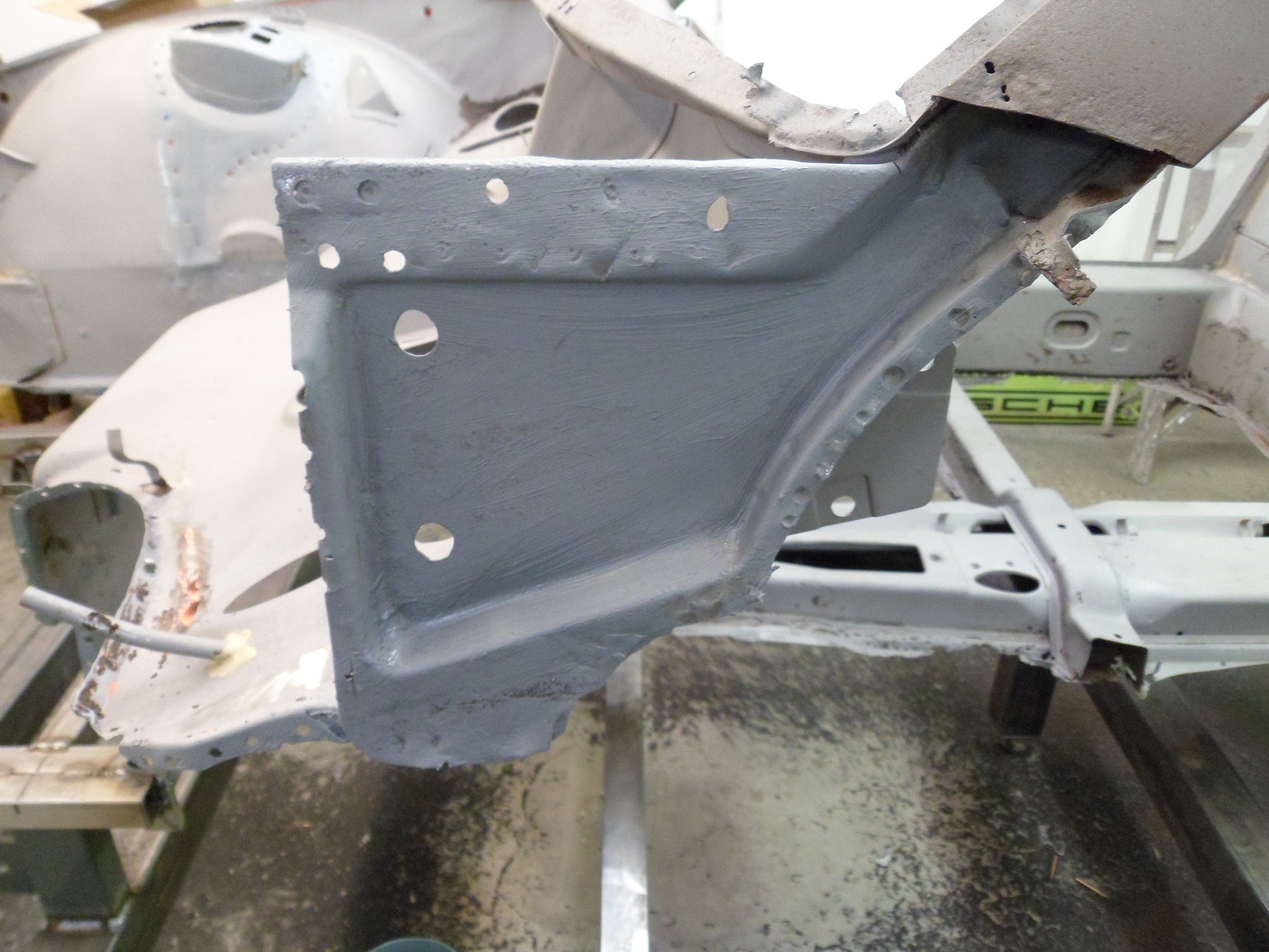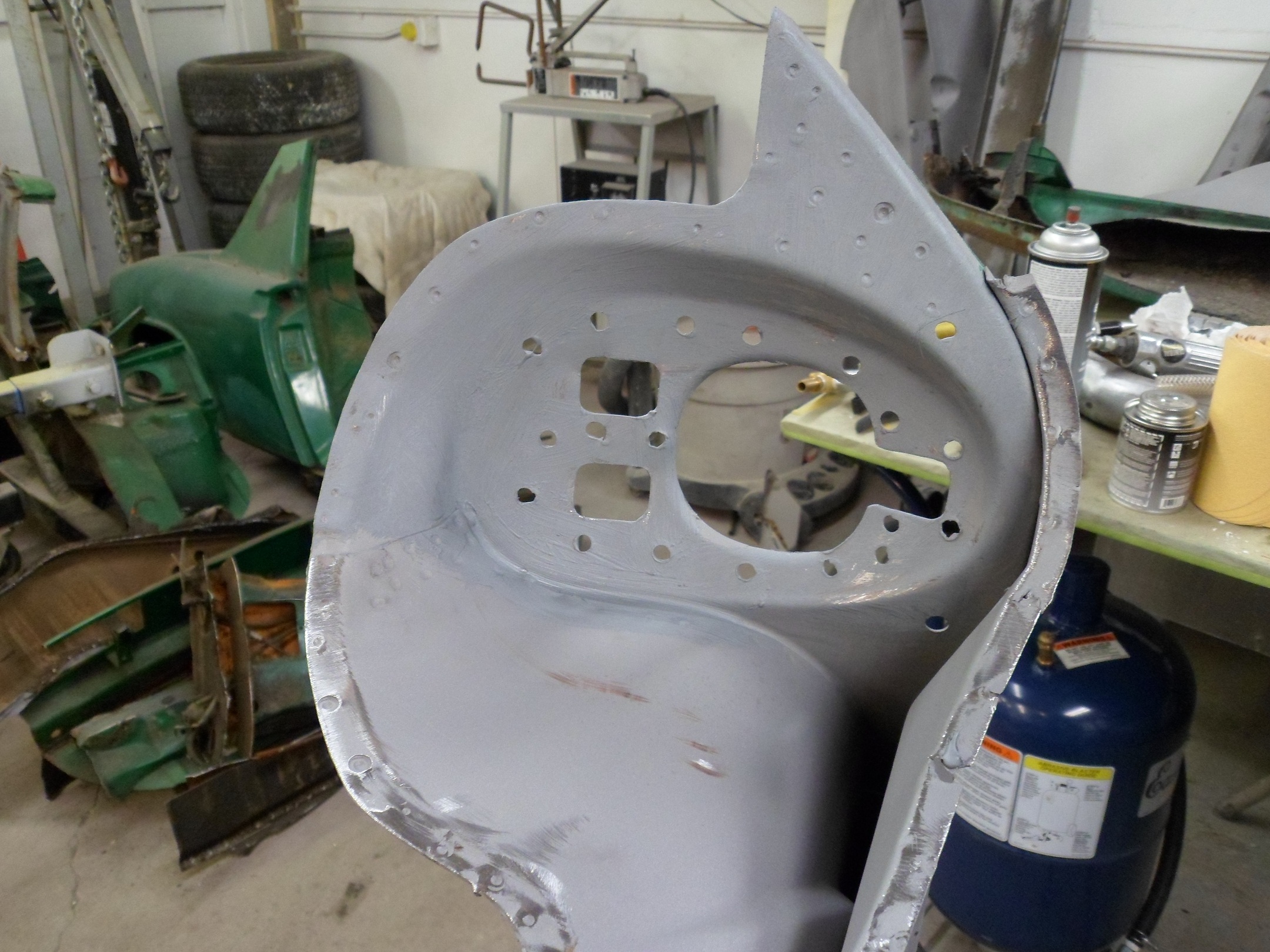 Got the front corner clip and inner long tacked in place. I blasted then coated the areas with brush on weld through primer. As it is heated when welding, it melts and coats the weld area to protect it. All these areas will also be sprayed with a primer once the car is completed using internal frame coating spray.