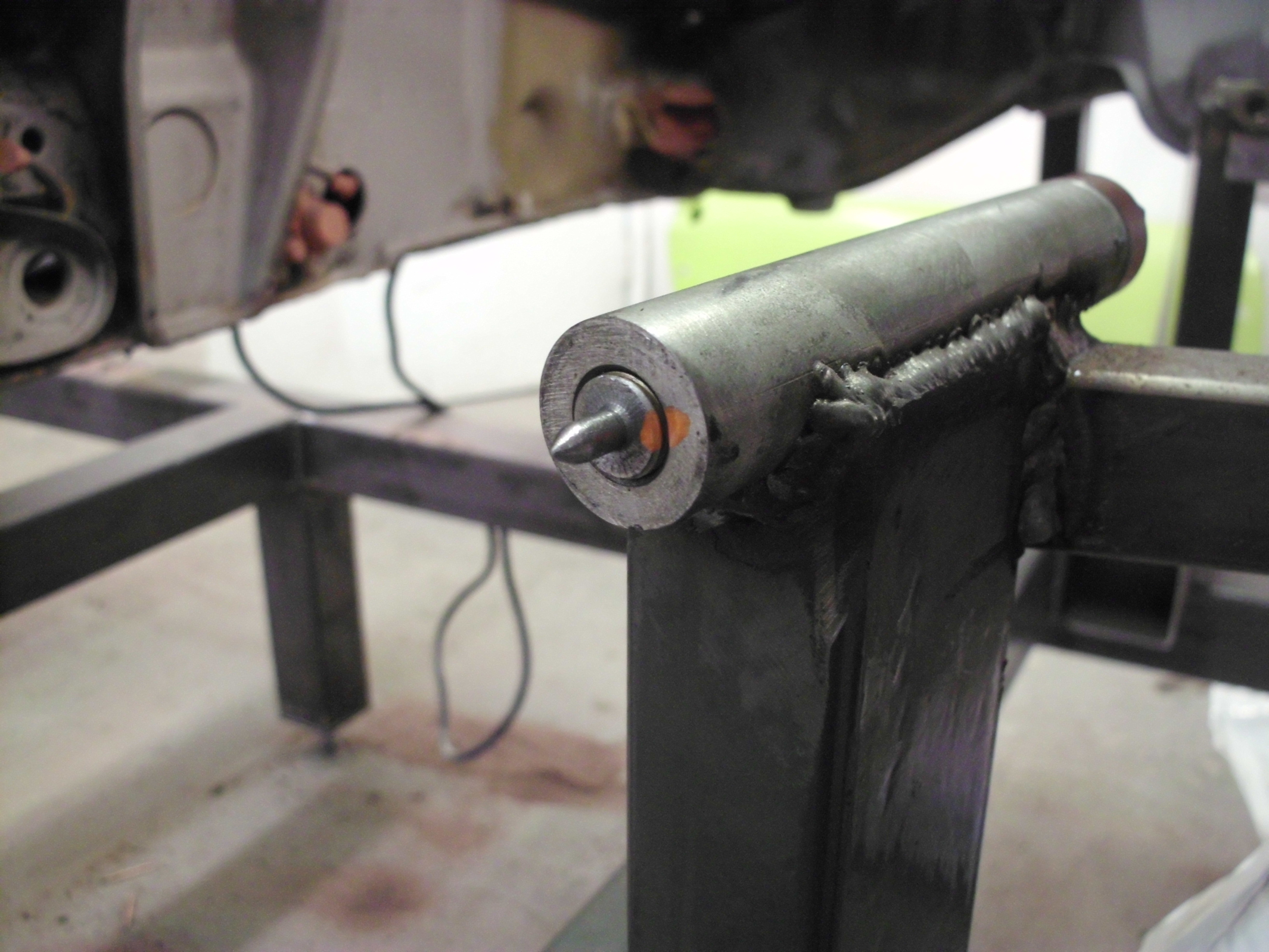 I made this punch that screws into the Jig. Once the long is welded in place, with a lite tap on the suspension consol, It will leave a dimple and I will have perfect center for boring the hole that the suspension arm mounts to. I'll drill the hole once the car is on the rotisory.