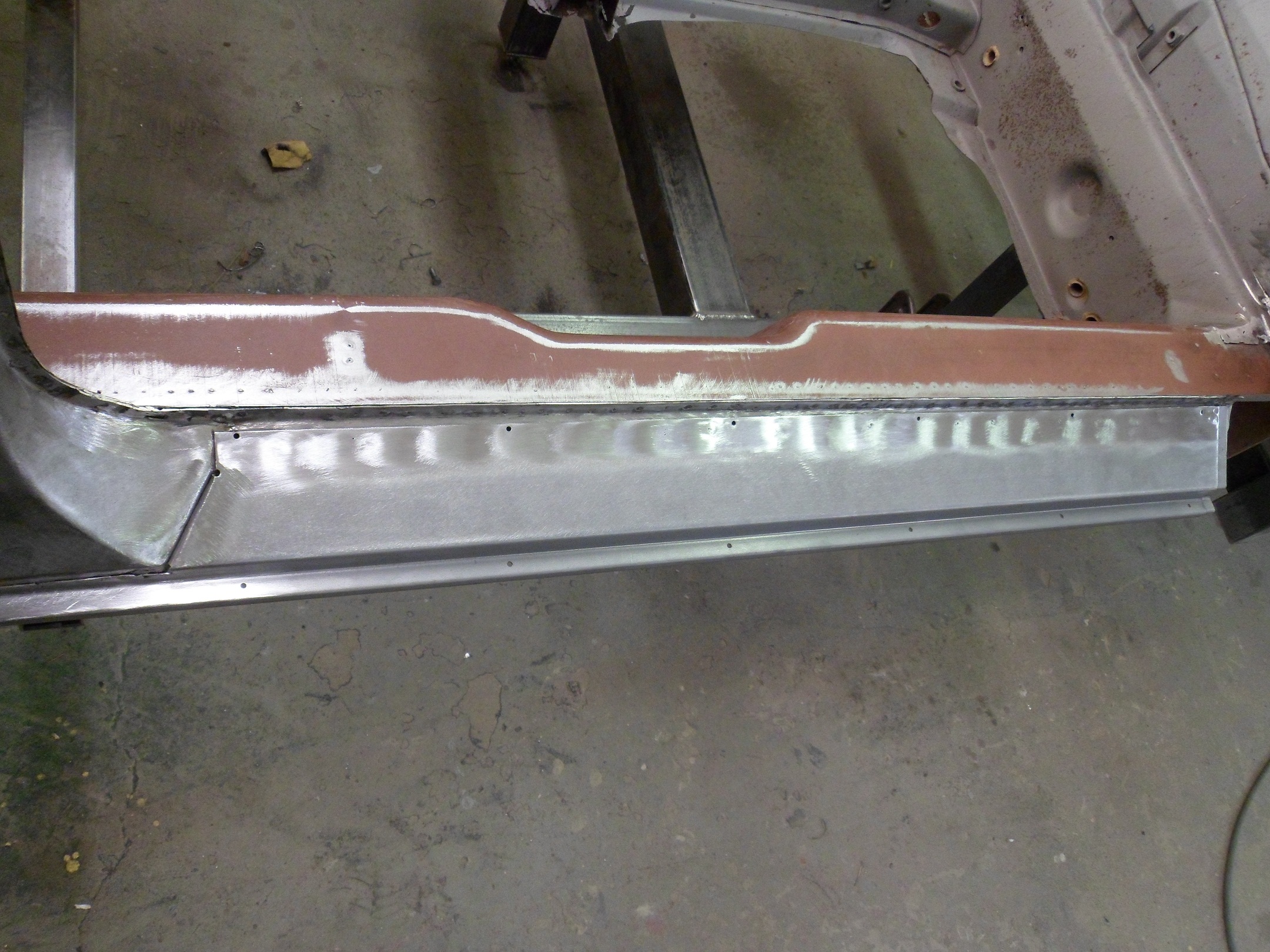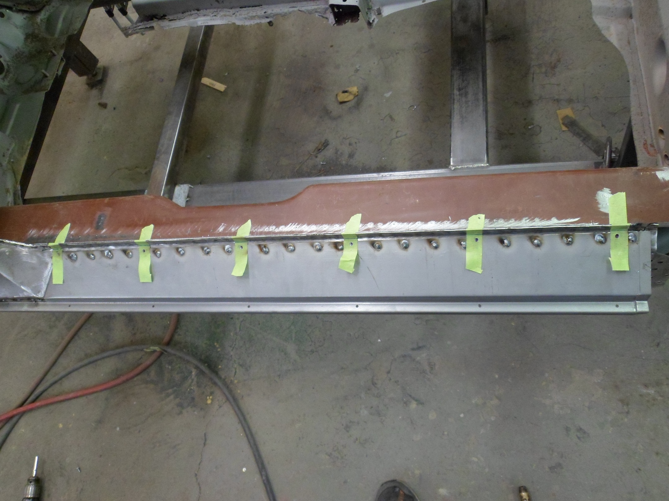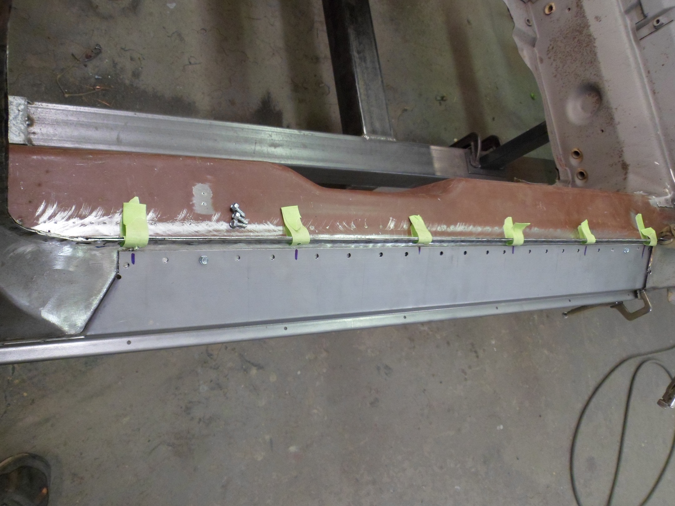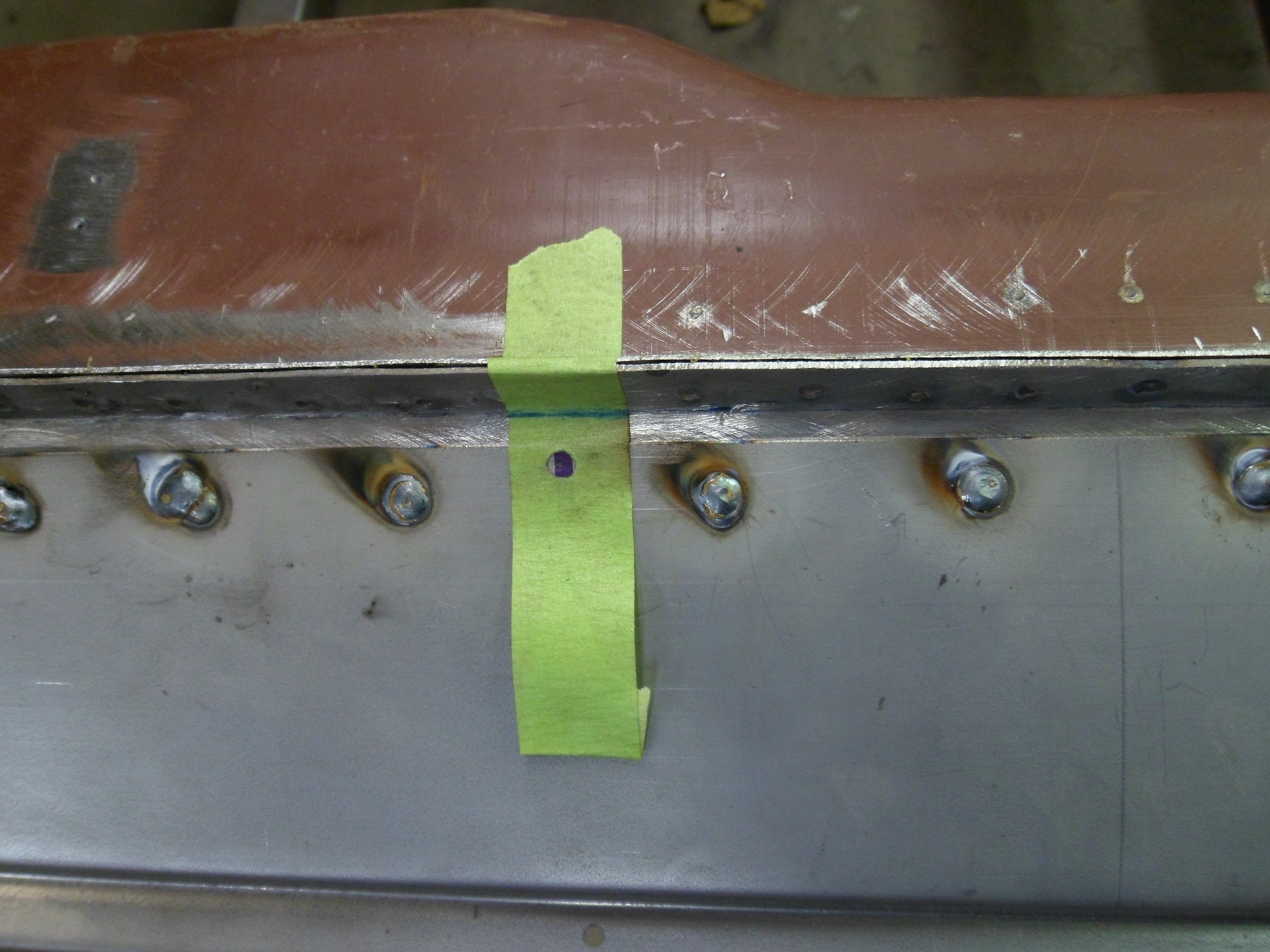 This is pretty self-explanatory but this was an easy way to use tape to locate and transfer the holes into the new piece. The holes were in the outer long but covered with the sill plate (once sill plate was placed) so I used tape to map their location and pulled it back, welded then laid the tape back over to give me the location to drill the hole in the new piece.