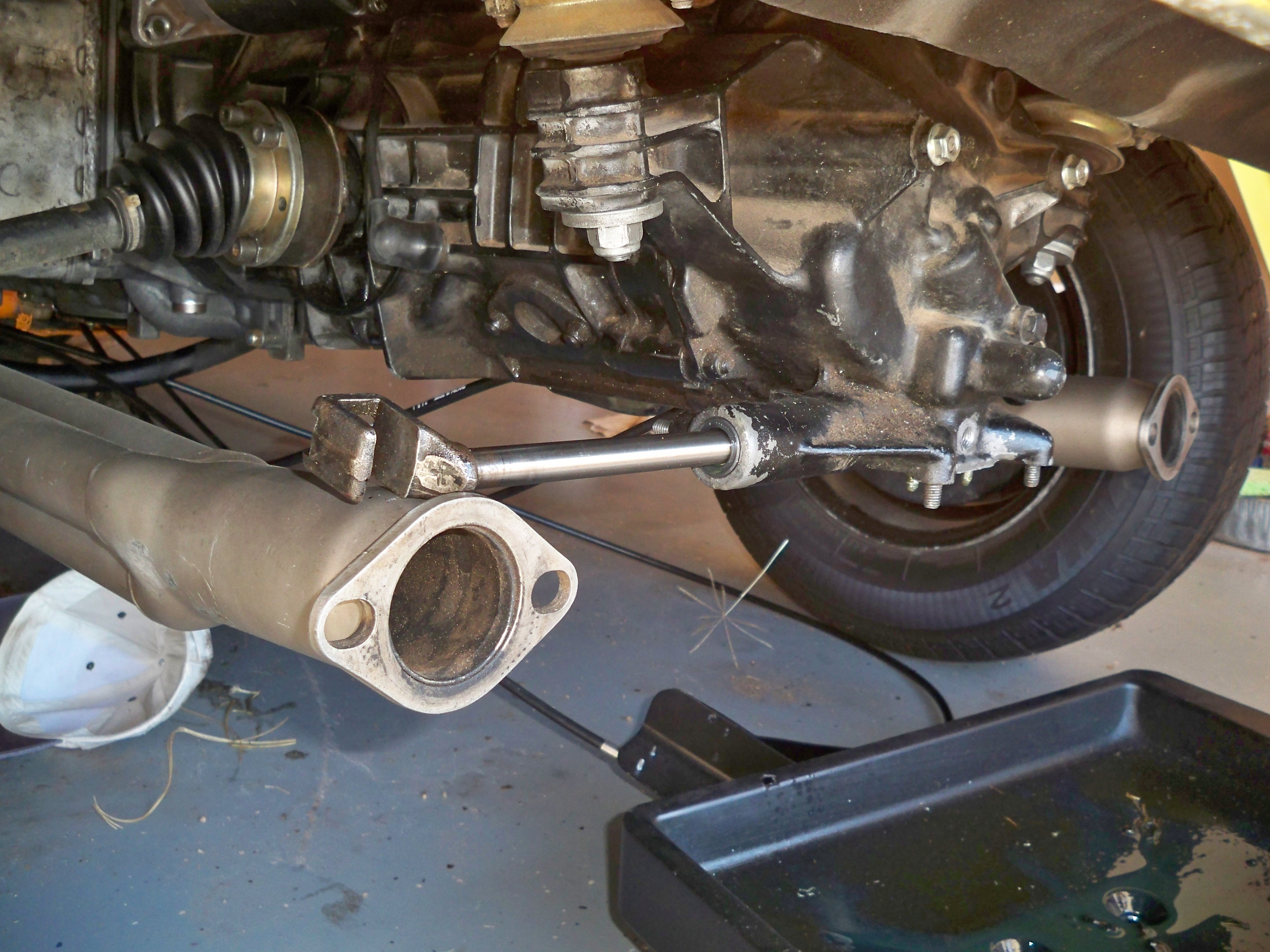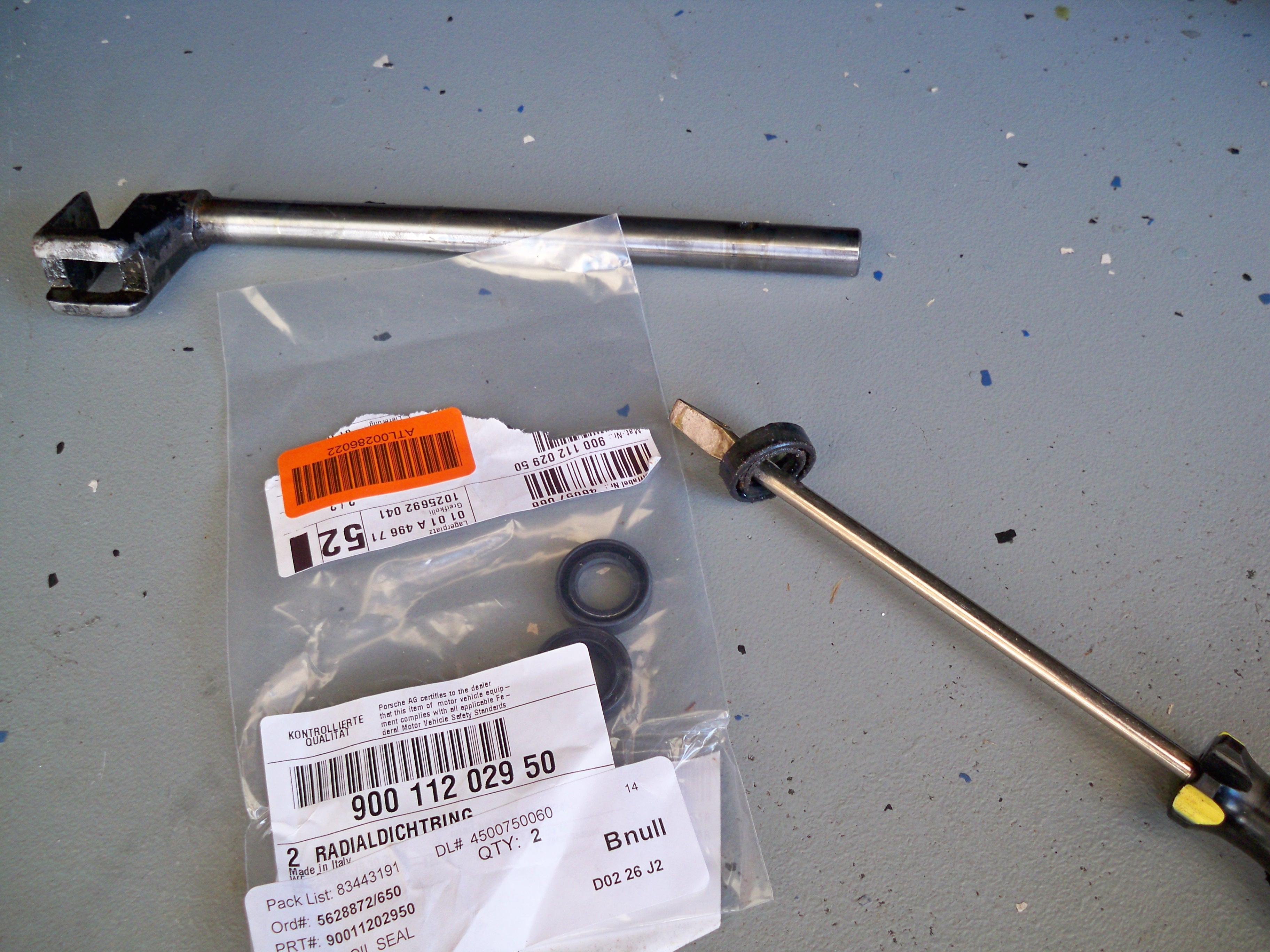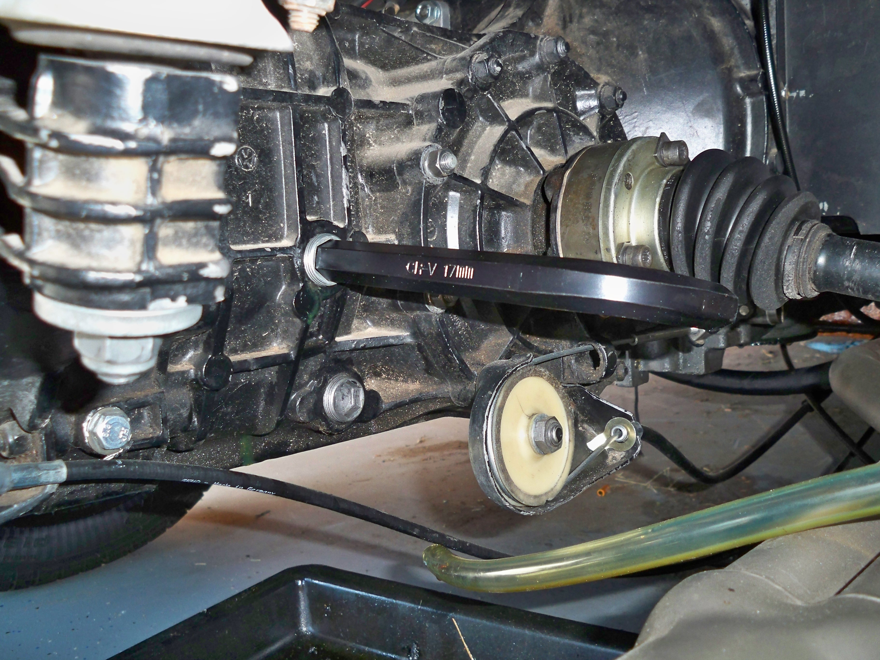 I bought this -6 conversion project on Ebay too many years ago. It finally got off jackstands and I filled the transmission with GL-5. The next morning I found a good sized puddle under the shift rod. It wasn't the first "au krappe" moment for this project.