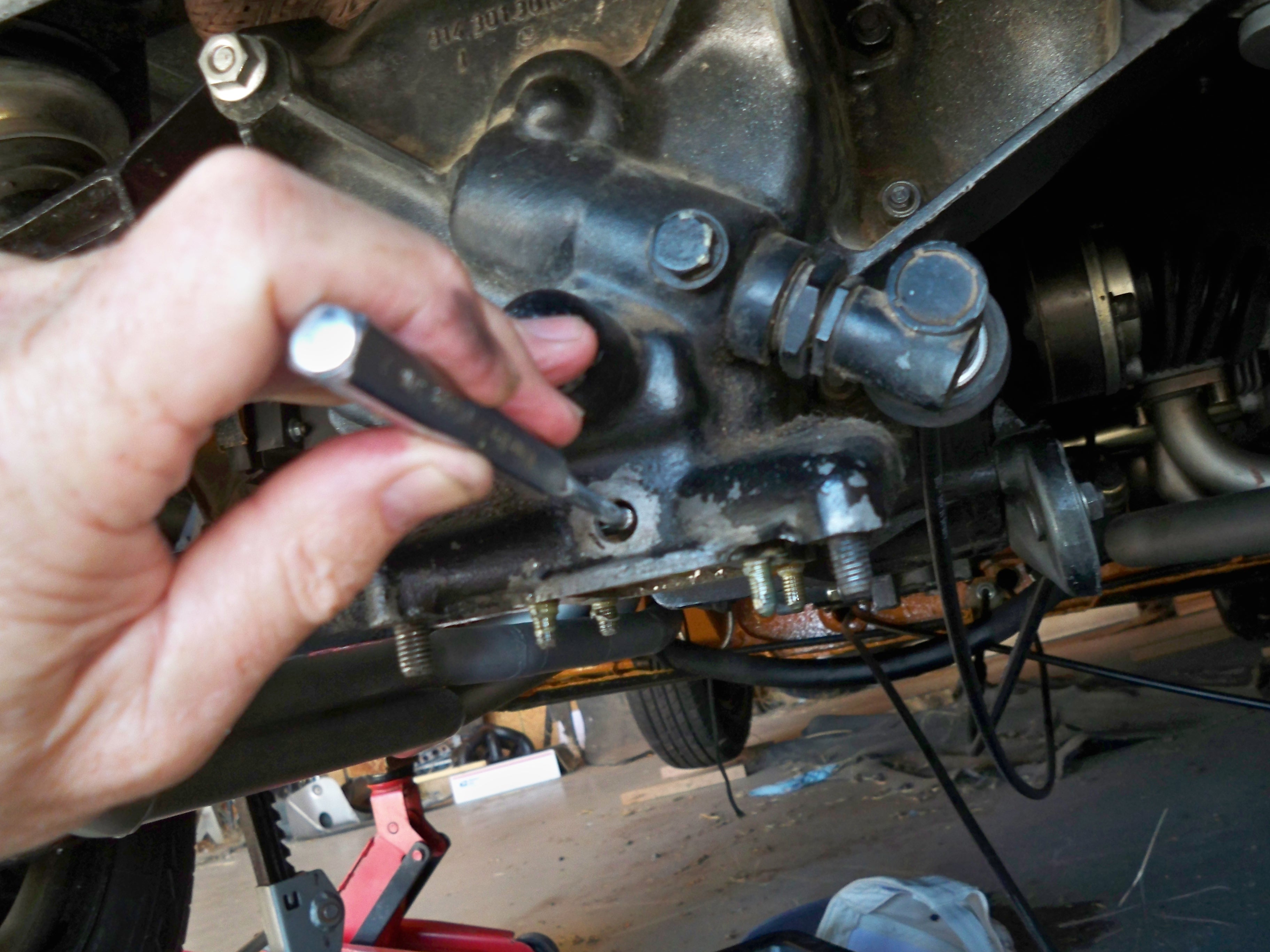 Wish I had seen this before I did mine.........I didn't know about or see that bolt to access the roll pin. Would have made it so much easier. Hmmm, that sounded intriguing so today I uncovered my '72 and looked at the shifter rod housing. It is leaking also and ...NO BOLT! I was a little suspicious the other day because the bolt had been shortened with a hack saw. Sooo, some DAPO, wisely perhaps, had drilled and tapped this roll pin access hole just to make my job easier, do you s'pose? Anyway, I figured it would be leaking which is why I bought two seals and gaskets, but this job will be a bit of a chore getting the roll pin out. Dr. Evil or any others, have you seen this roll pin hole before? Seems like a good idea.... |