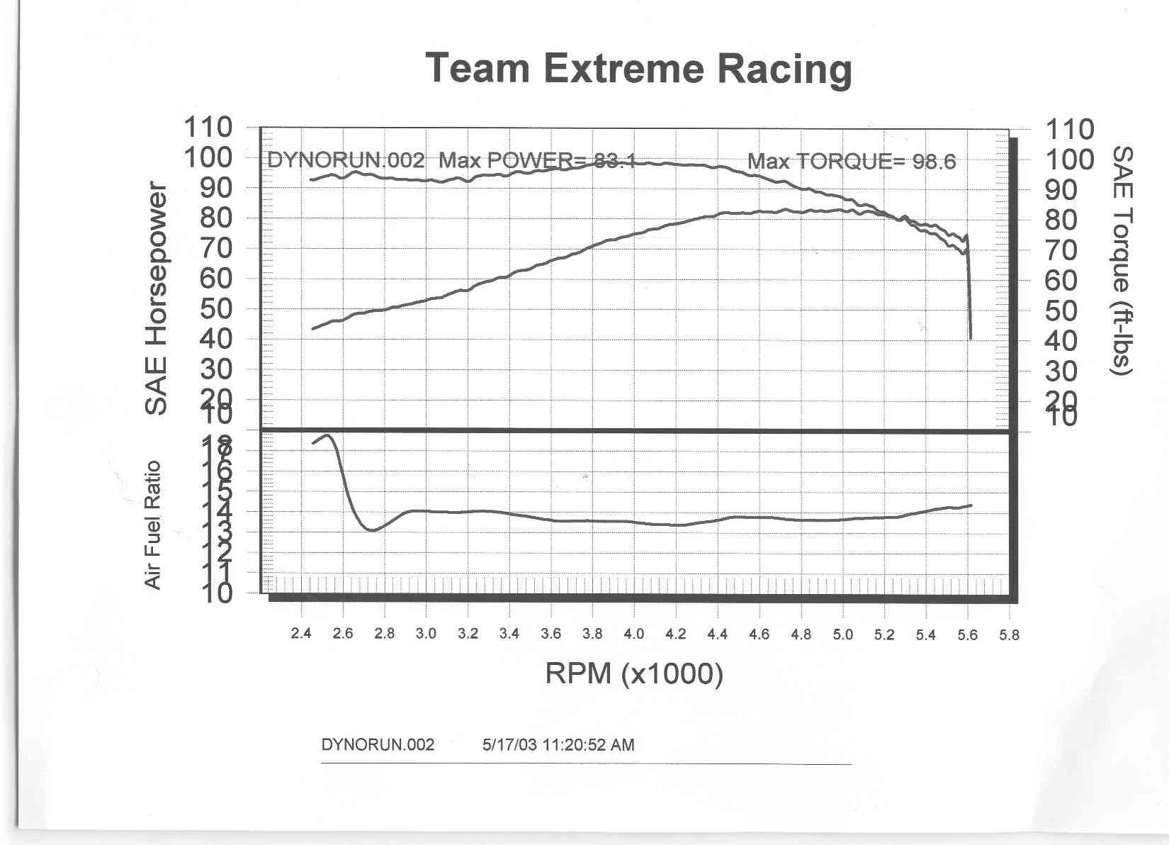 Hi guys, If we are under what you think it should be, do you have any suggestions? Is there a way to easily improve air intake? Thanks for your time! M.i.M. Mike, Some dynos yield higher #s than other dynos, for instance; the Dynojet 248c usually shows higher #s compared to the Mustang (brand) Dyno. Then there are uncorrected #s (higher) and corrected #s (lower). The location / altitude of the Dyno is important, like Denver vs. Long Beach. Your 2.0L with light mods seems just a tad low. Our 2.0 efi club racer makes less than 100hp, with limited mods, no headers. We do use a (allowed in class) high flow cone air filter .It does not make big hp but keeps the revs up between shifts and helps all around throttle response. Watch + hear it run at Willow short track, on the home page at Www.msdsinc.com Marty |
