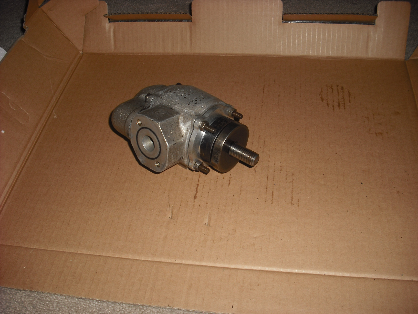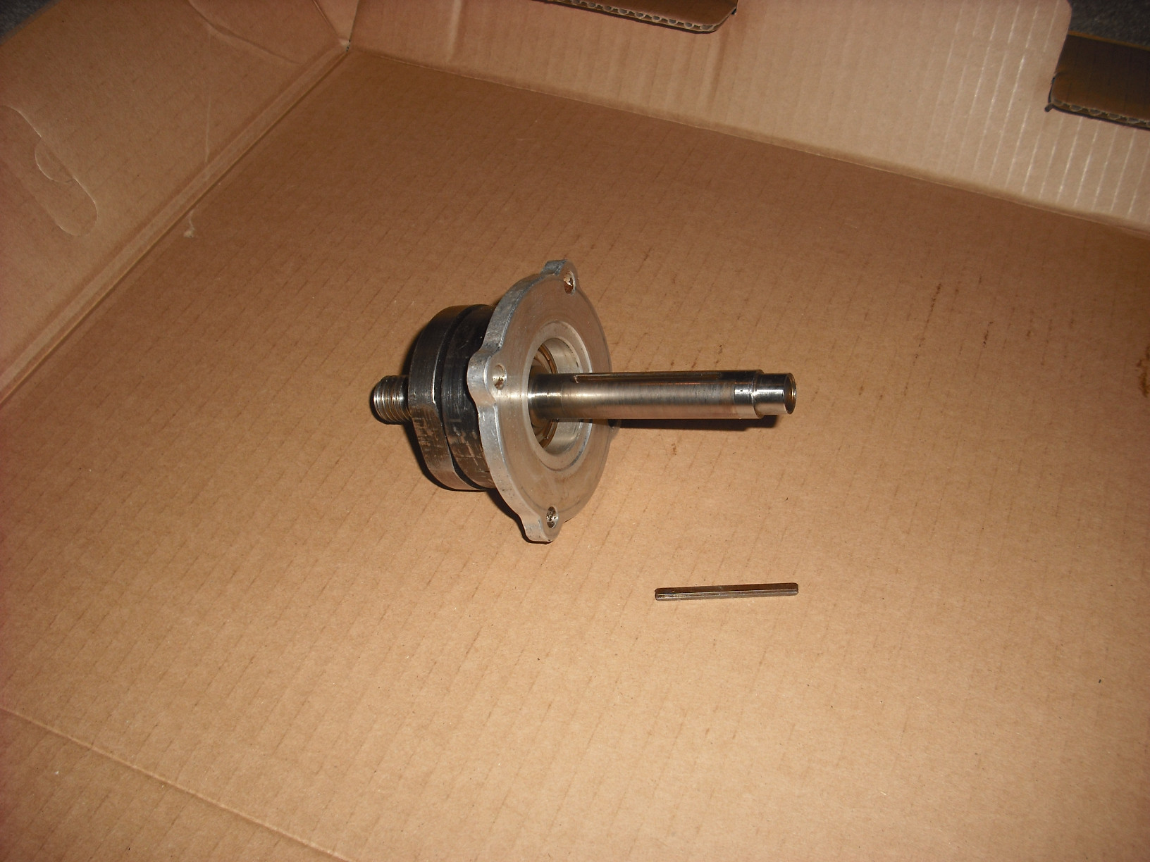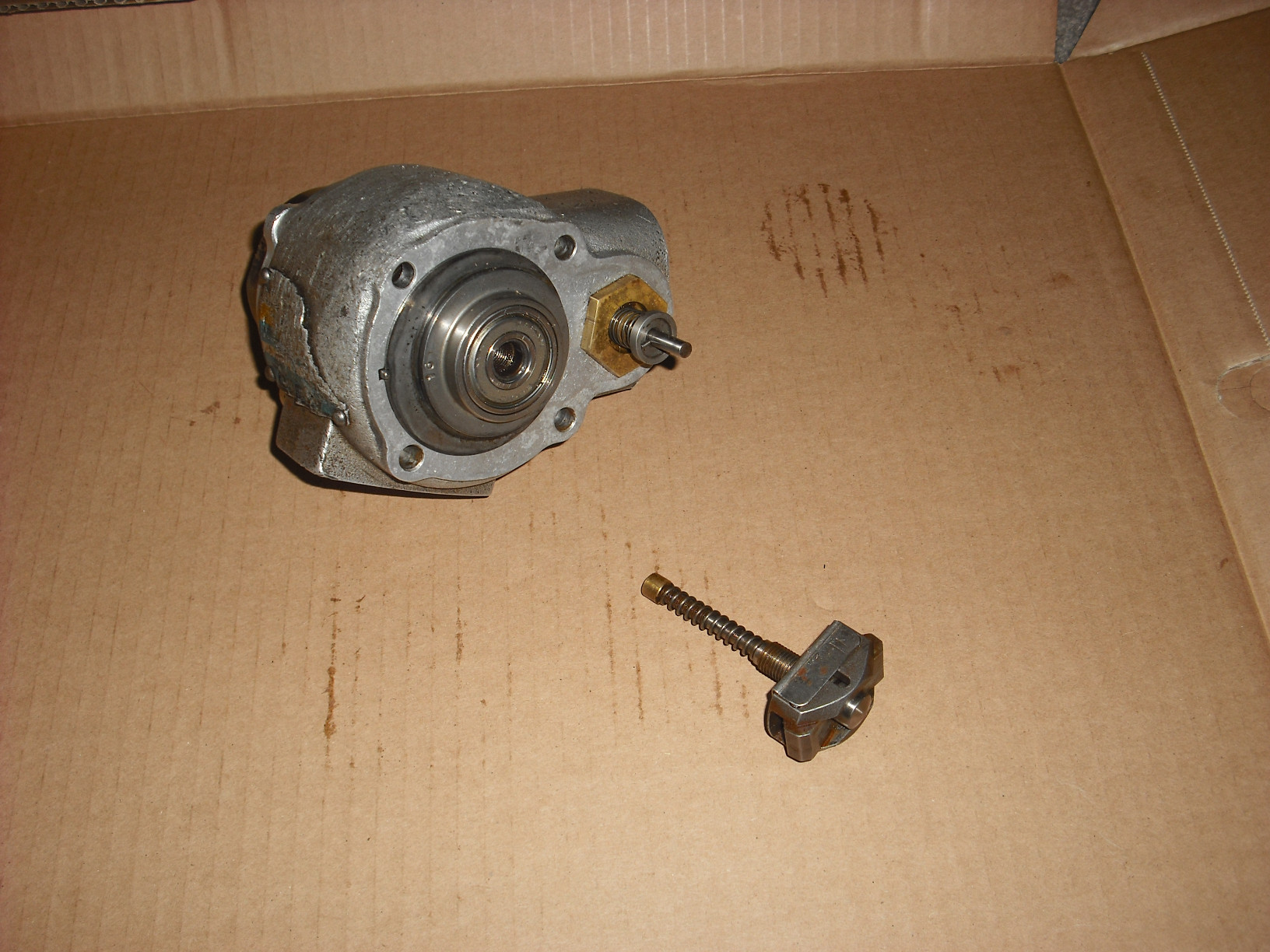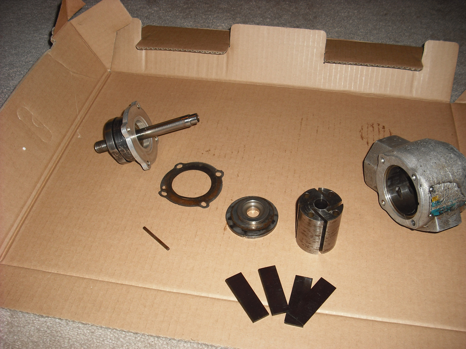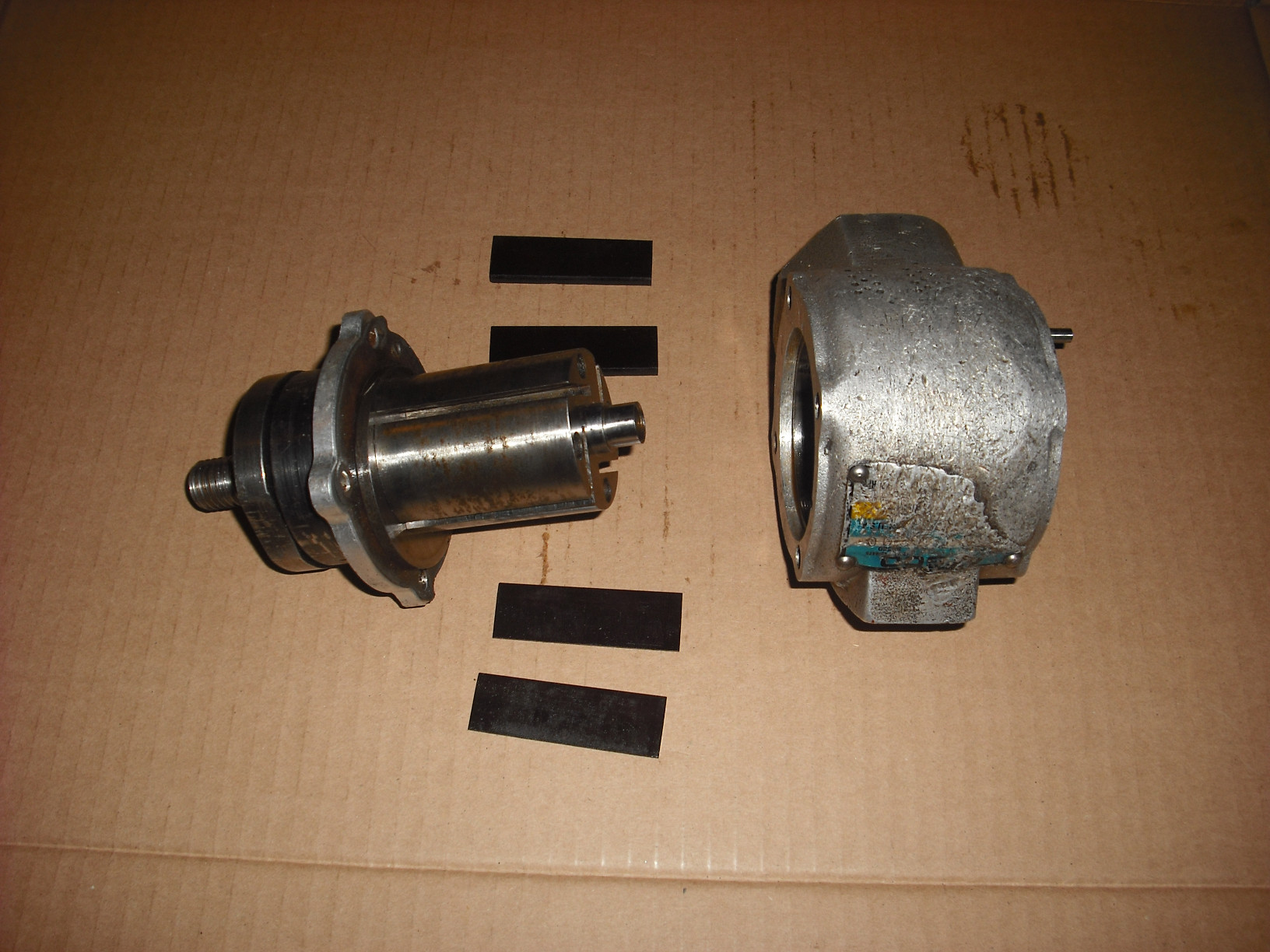 Here's one end off, showing the rotor: And the other end popped out with the shaft attached. If everything is clean, the vanes will just fall out. Vanes are a replacement item: The cap and the bearing cup on this end are separate pieces. There's the shaft key for the rotor lying there and the other gasket to be replaced: |