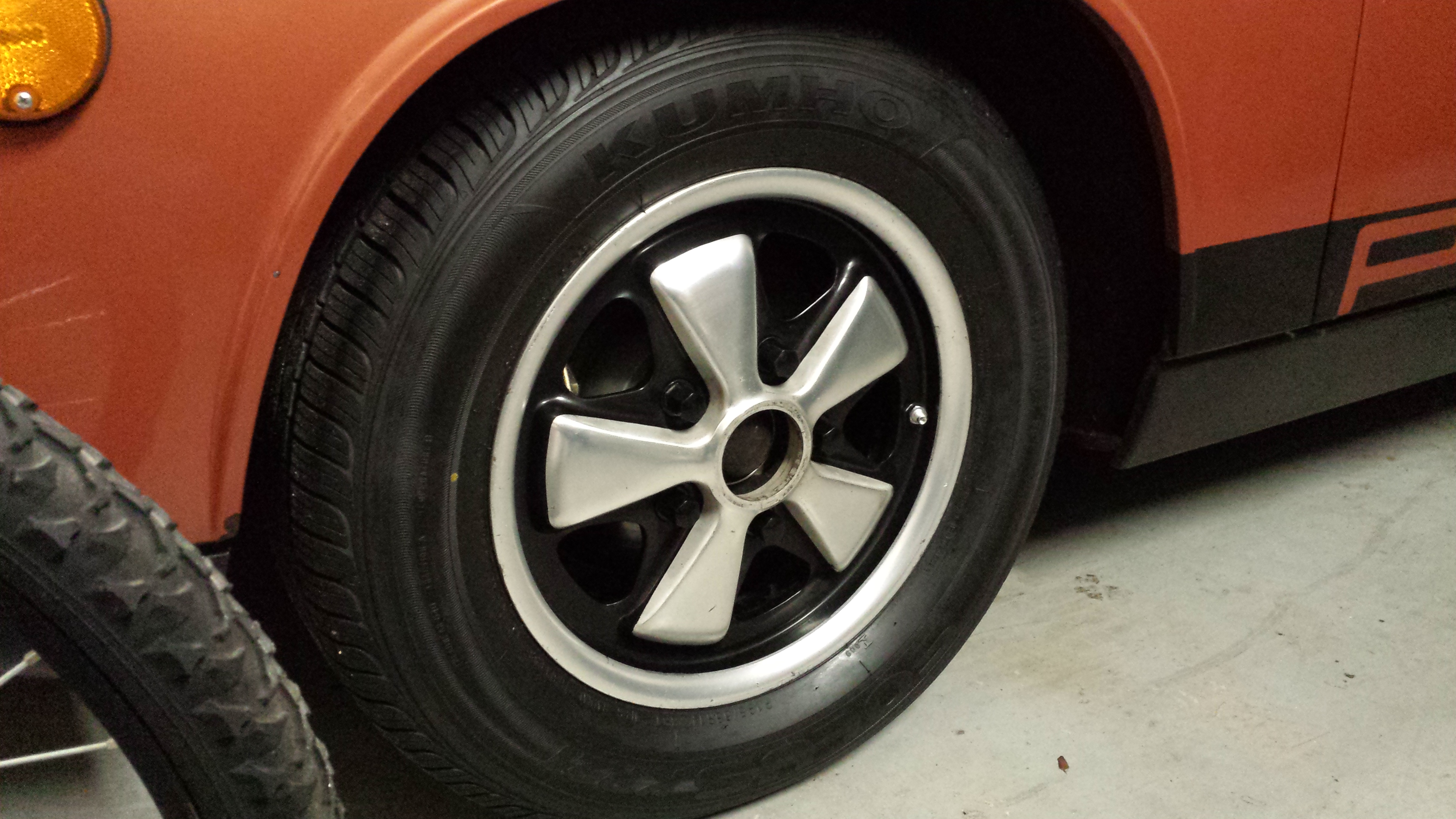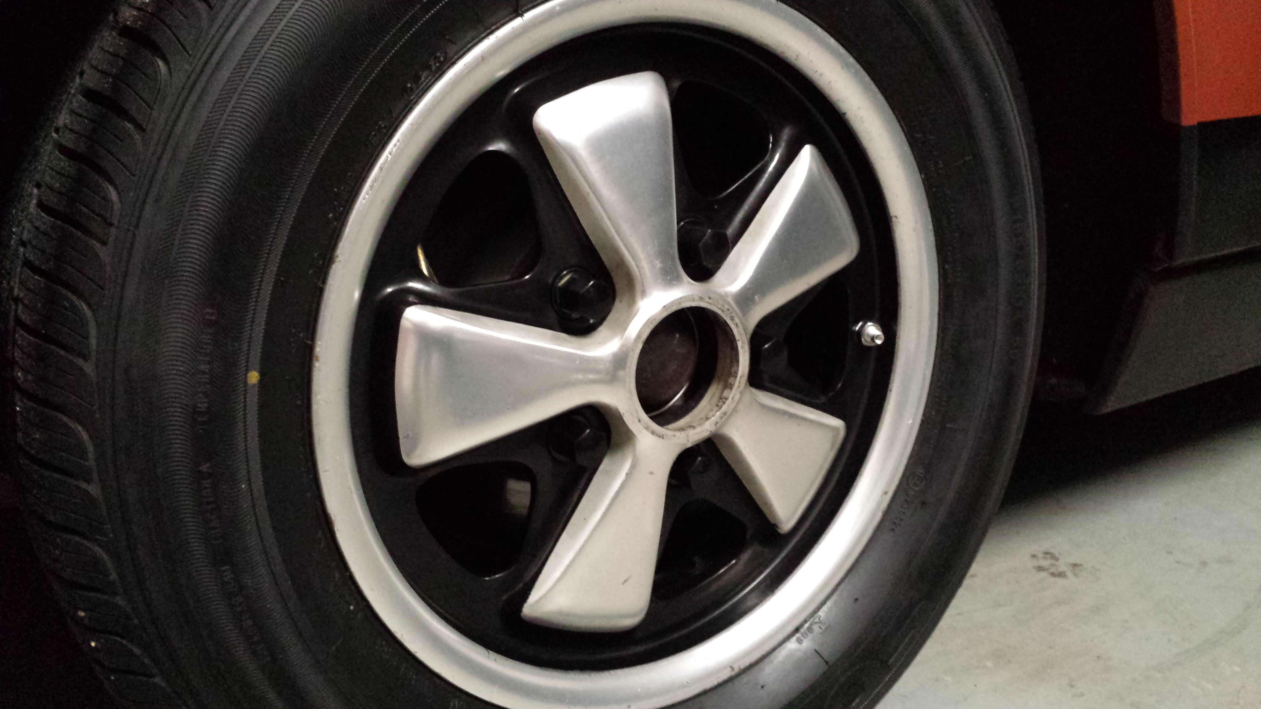 I have 5 matching 14" 914/6 fuchs that i bought last year from LukeM for my 75 2.0 and did the 5 lug conversion last year. About 6 months ago i experimented with the pour method of painting them rather than taping them off. It worked great! -level the wheel, tape off the back and pour the paint until it comes up to the level you want, then poke out the back thru the holes betweent he pedals and it drains out. let dry and cure. - problems i found: if you use and enamel, and i used a rustoleum gloss black enamel, it needs to be thinned out or it will take for ever to cure. also i found that i should use a hardening agent like japan dryer, which will cause a faster chemical cure not a slow drying . What i am wodering is this: is there a better type of paint that would cure fast and be durable? one that can be poured? my spare is done and looks great but #2 wheel will use same paint and thinned down, and curing agent used -- unless anyone has a better idea? |