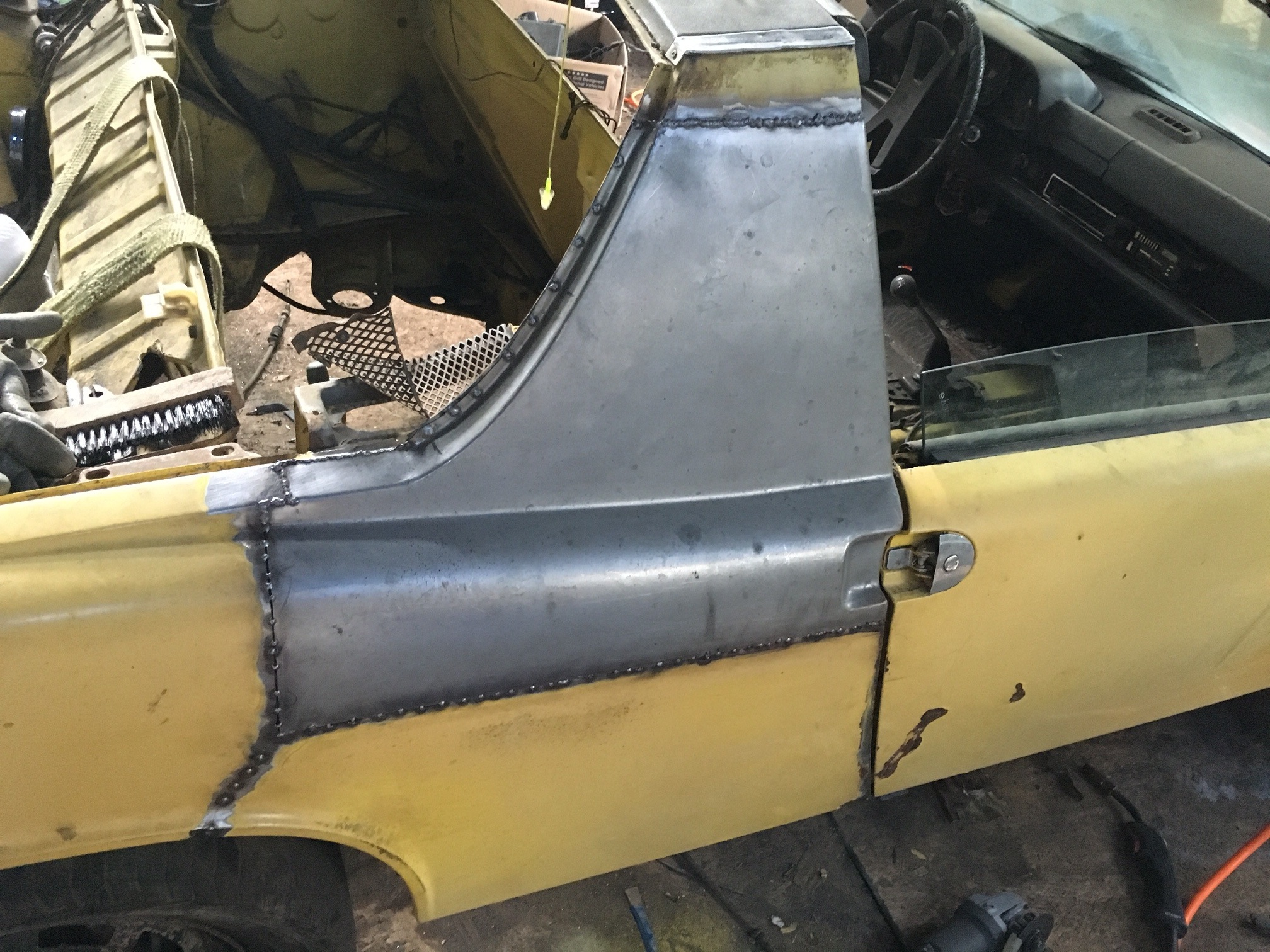 Got the passenger side sail panel, door jamb, and fender all lined up and started to weld up. (IMG:style_emoticons/default/welder.gif)