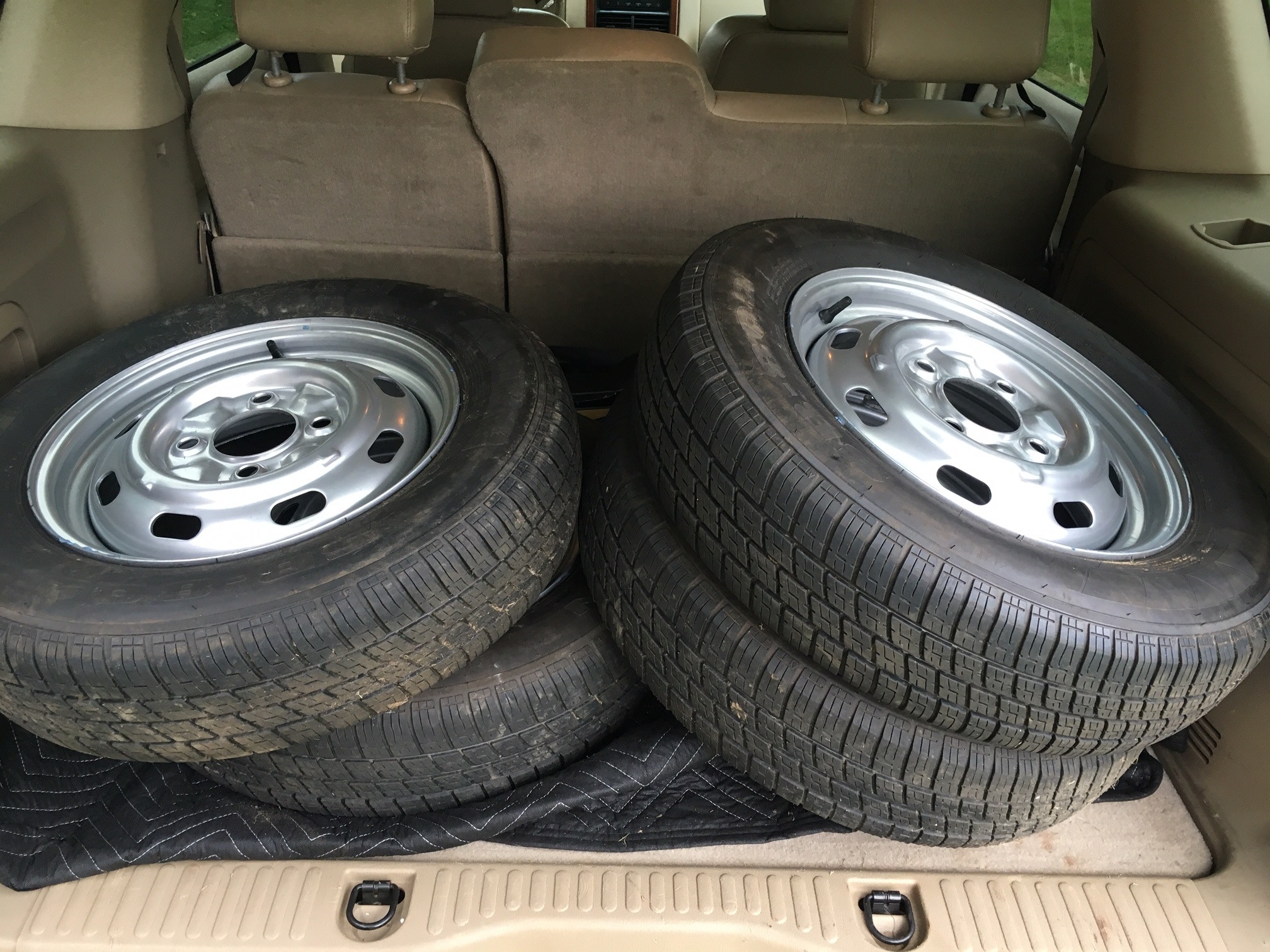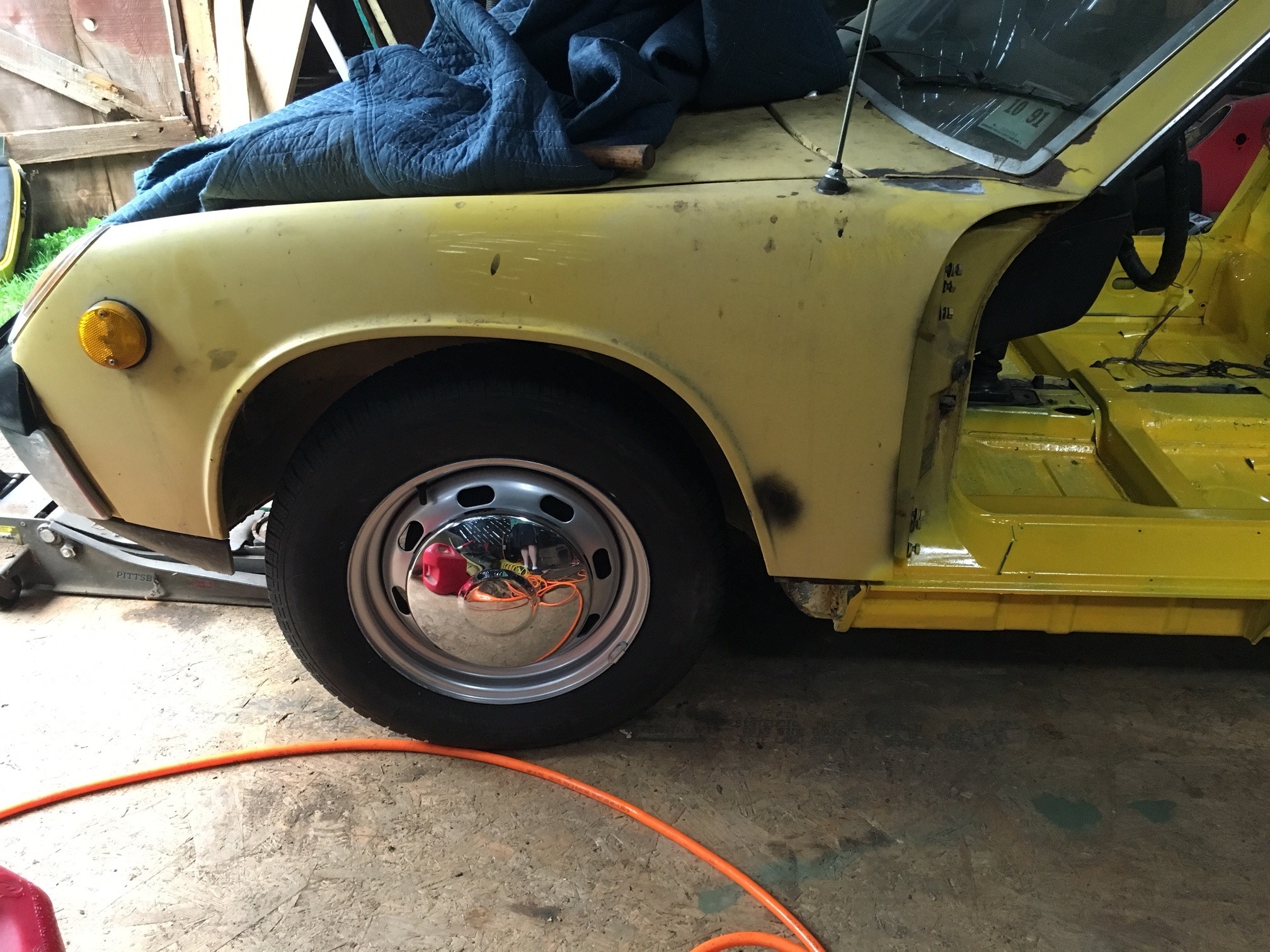 I got a special delivery today. I went ahead and bought a new set of wheels. 4.5x15 steelies. I also had some 165/85 tires that I went ahead and got them mounted. Early Steelies are probably my favorite wheel for the 914 so I'm excited to be using these on my car.