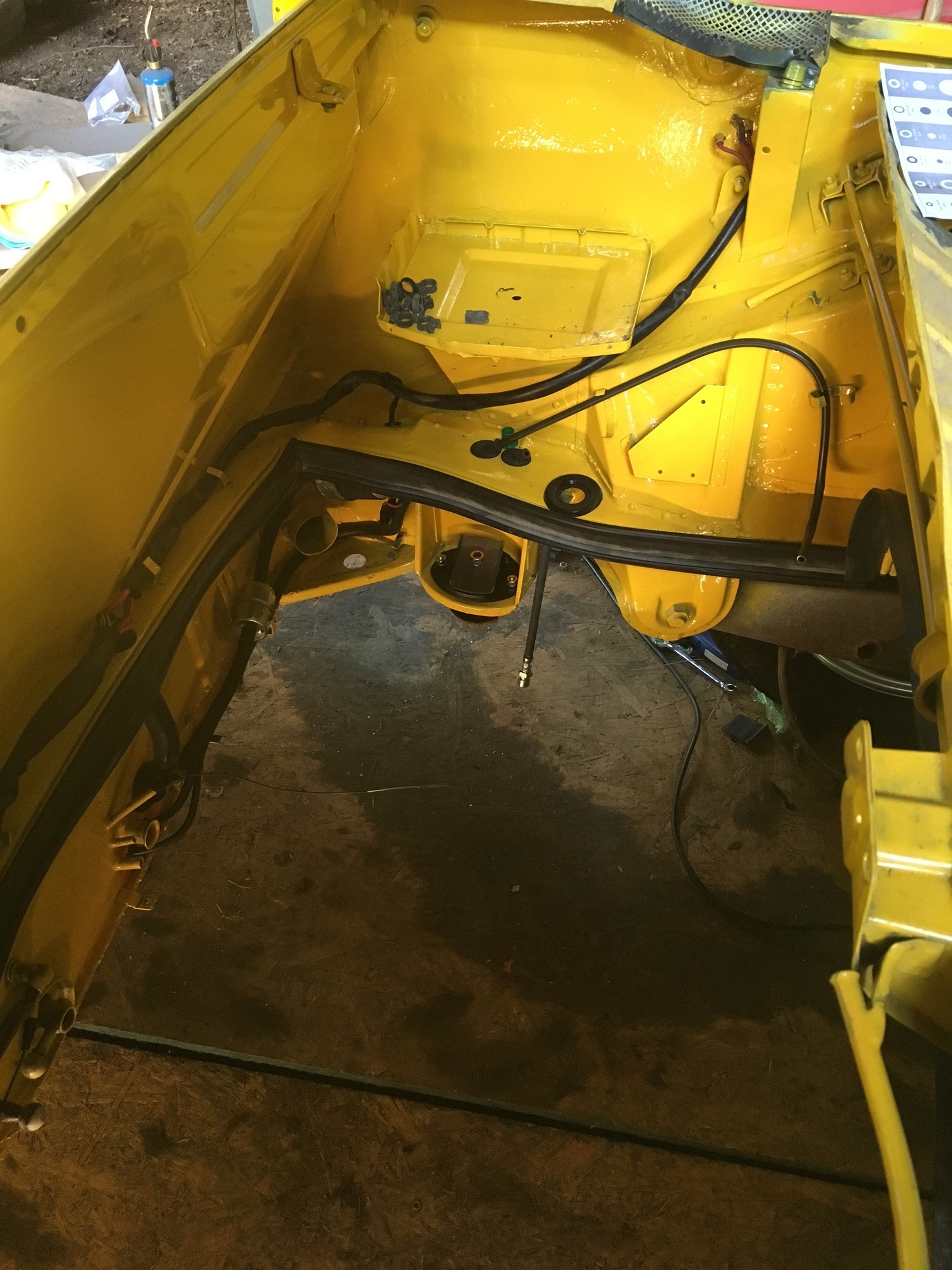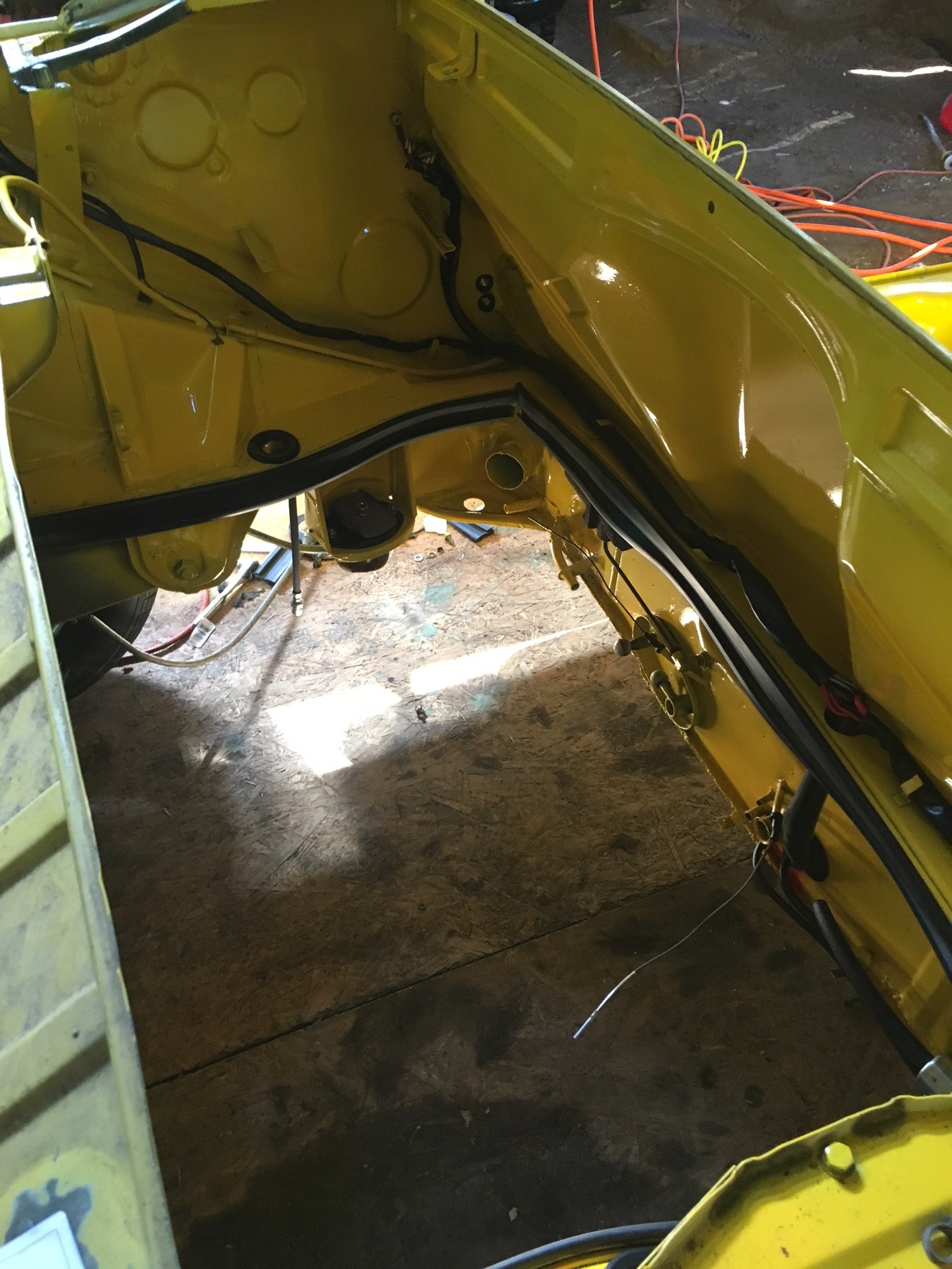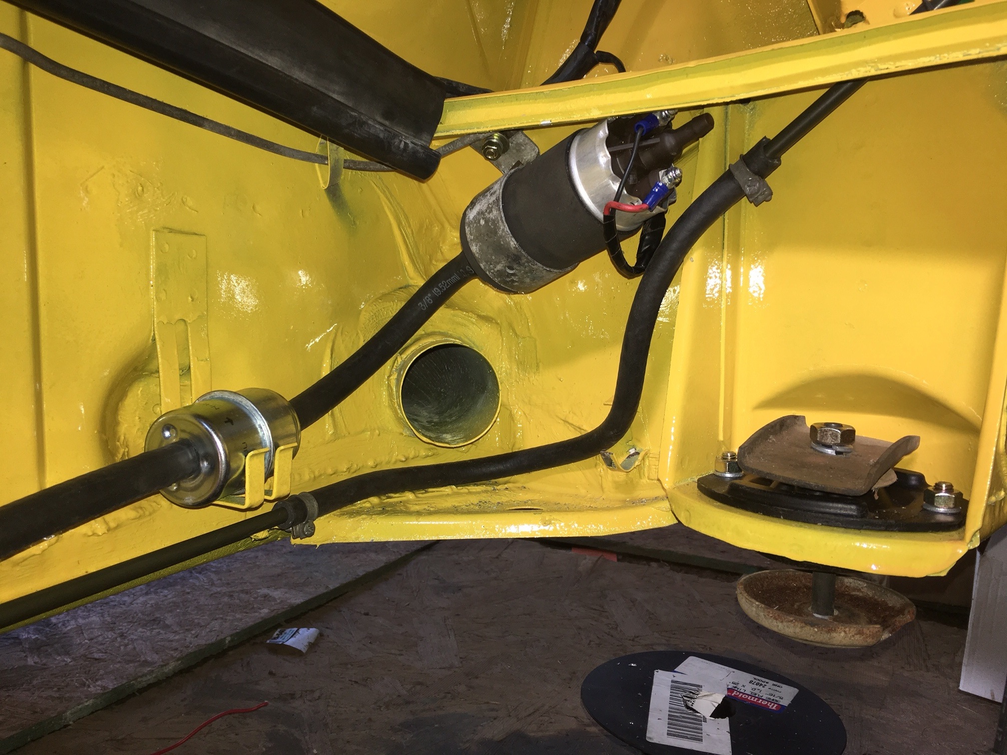 Spent the day today assembling the engine bay. Mounted steel lines in the tunnel. Figured out fuel pump mounting and routing. Mounted the fuel pump on new isolators and had to drill a few holes in the replacement engine shelf for the mount and wiring. I also installed a new wiring snorkel and cleaned up the harness. Installed new outboard engine mounts. New engine bay seals. New brakes lines. Installed new heater cable and nipples and some other small rubber pieces. Proud supporter of 914Rubber.