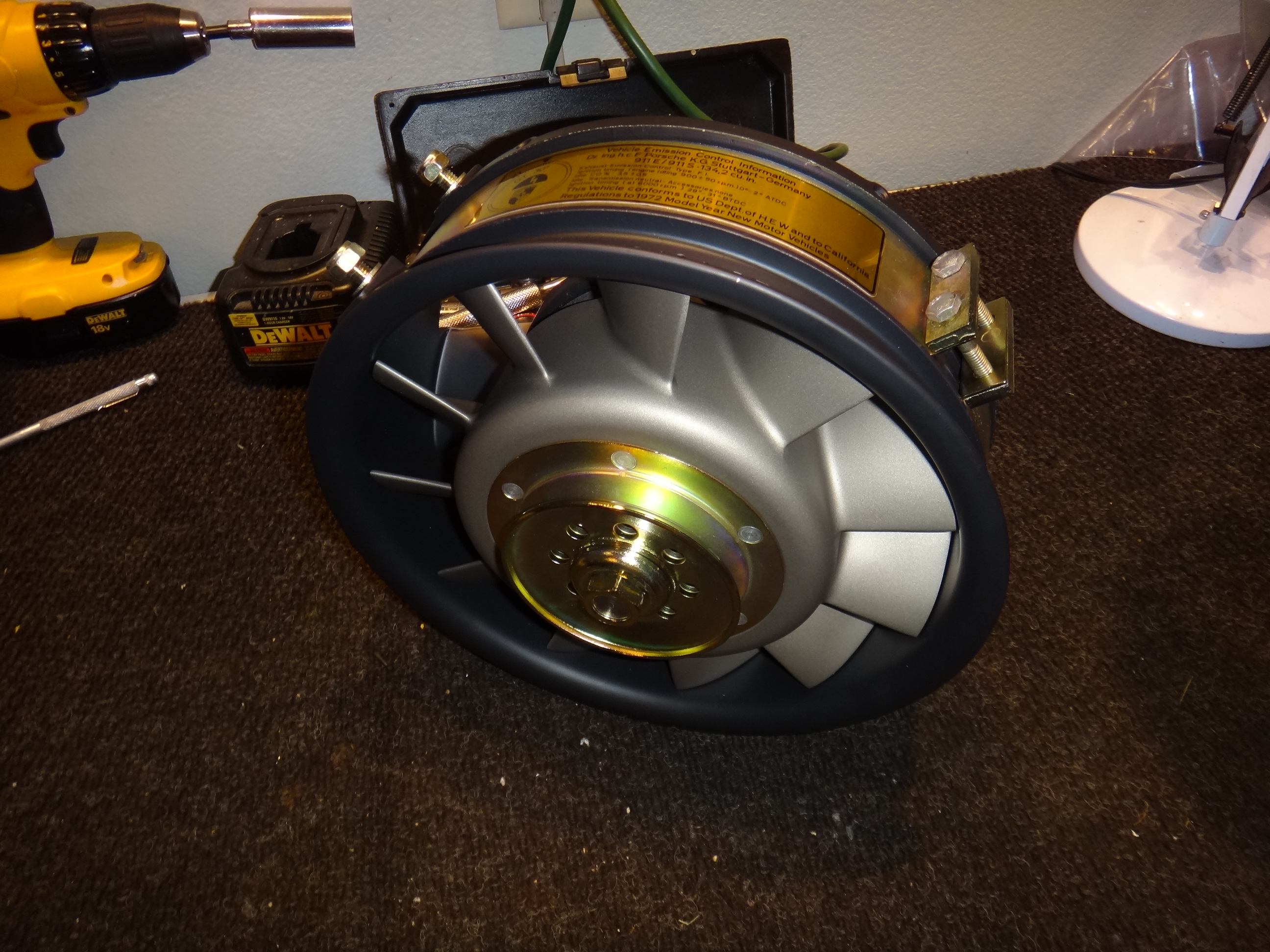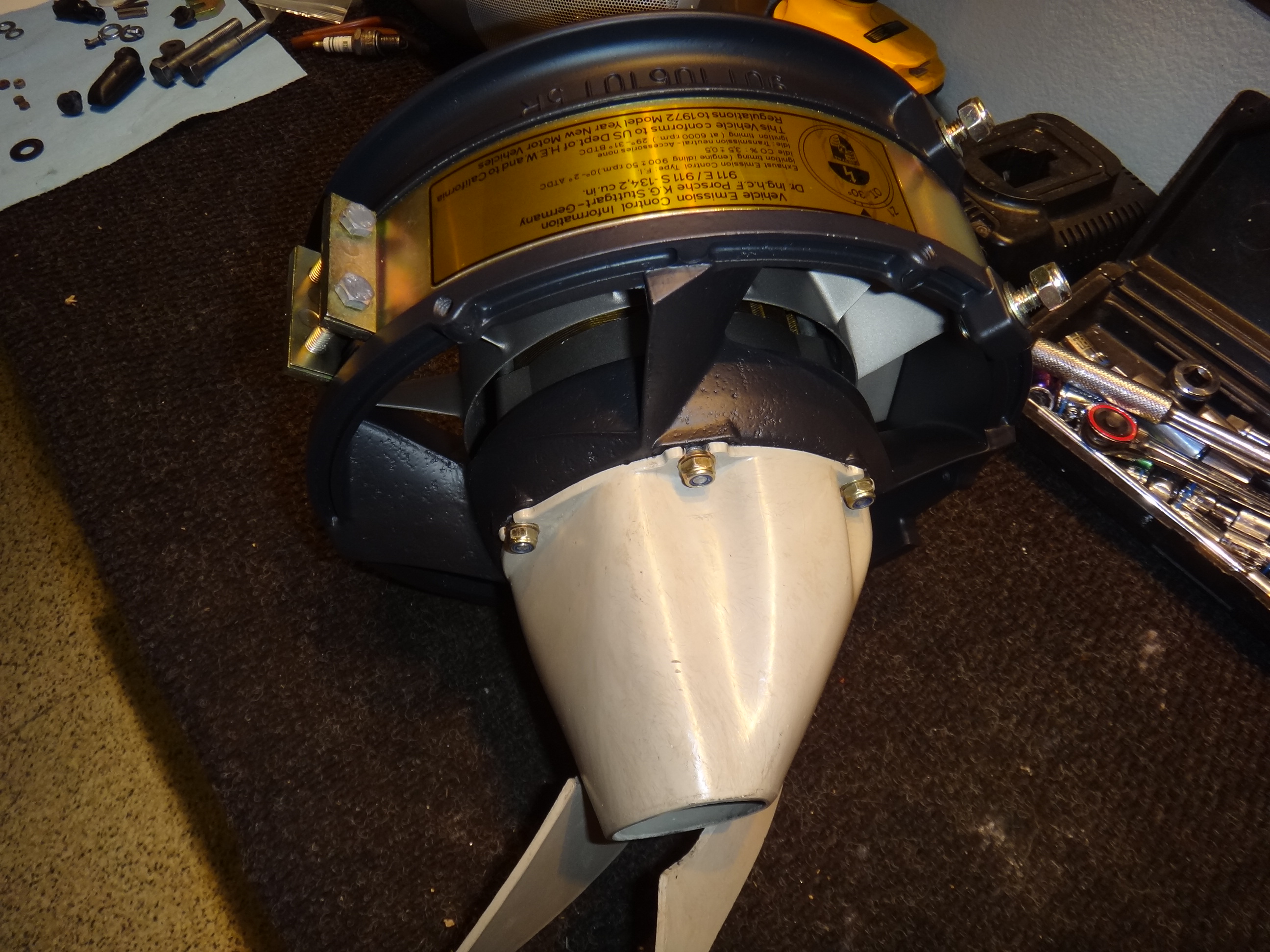 Getting the fan "dialed in" a bit more.... Newly plated strap with new foil decal (which is NOS and has the wrong displacement on it...who knew?....and inconsequential in the end). The displacement on the foil decal for the 1973 engine is a 2.2 which is obviously wrong; should be 2.4-ish. The downside with our cars is the pretty parts are hidden compared to a 911. Nice job though putting together the pieces. |