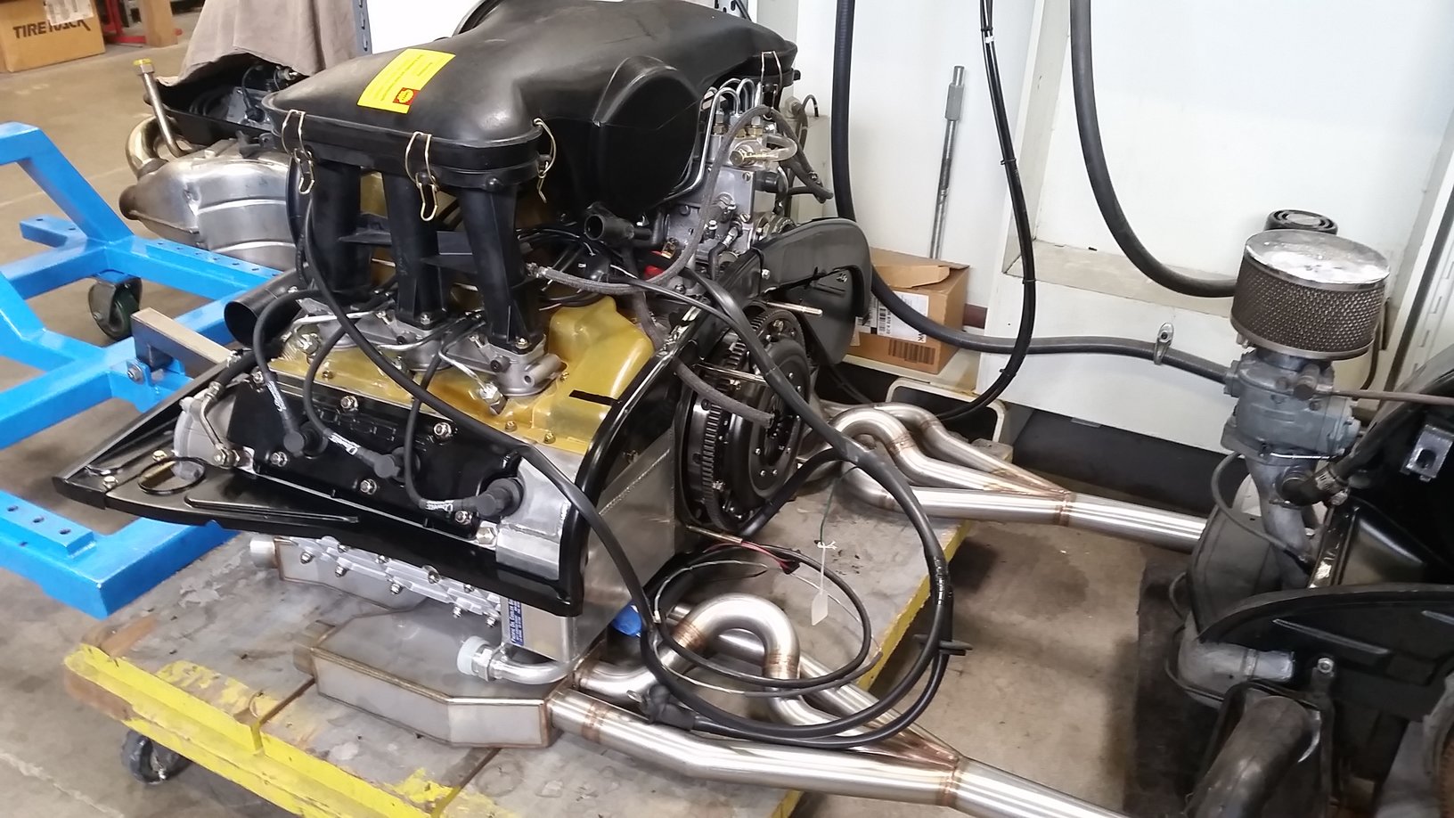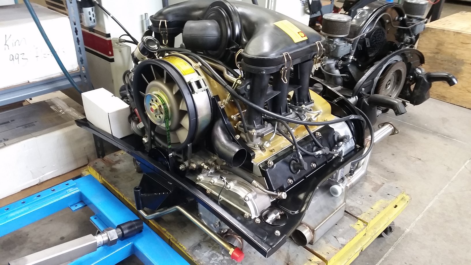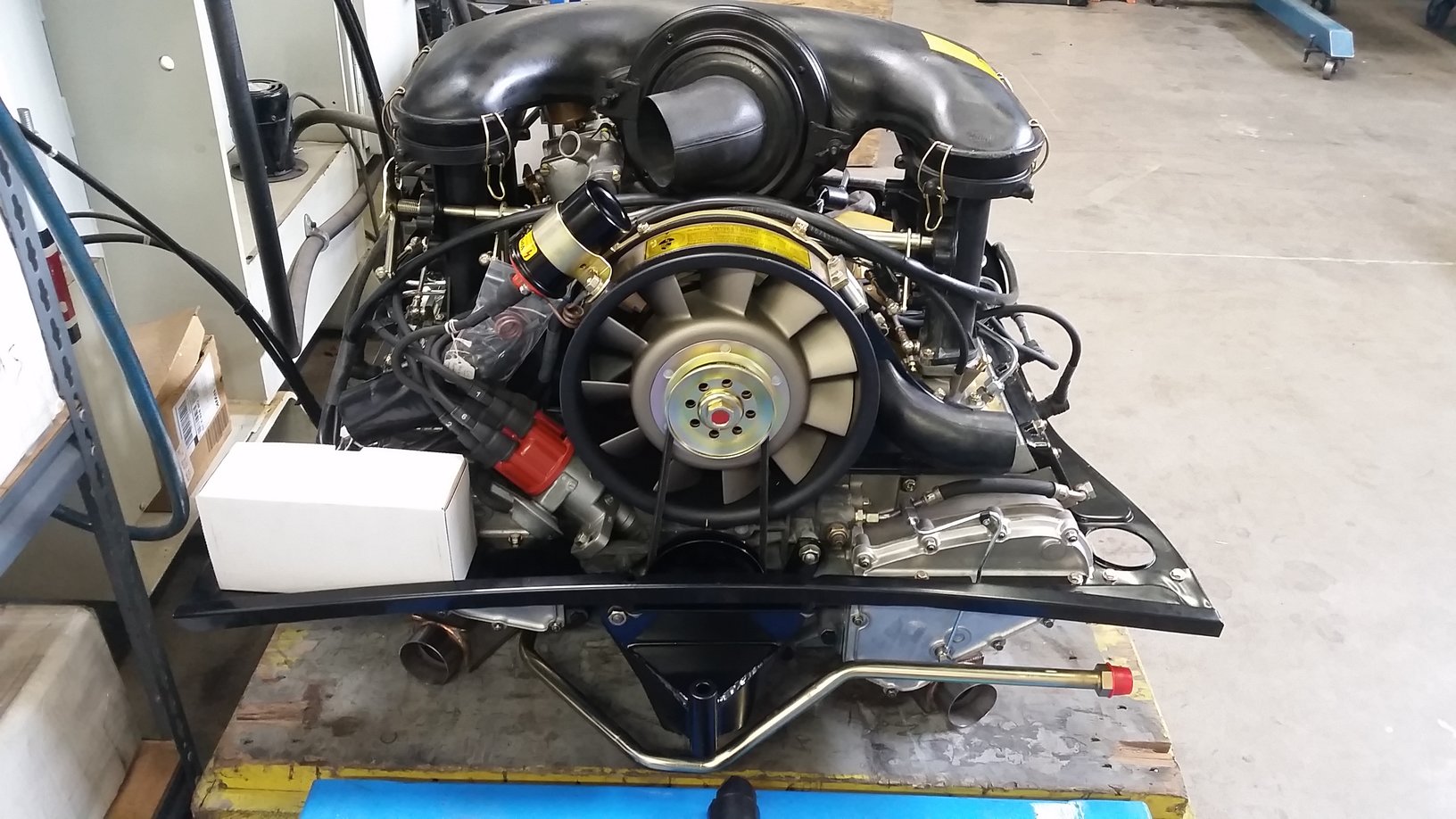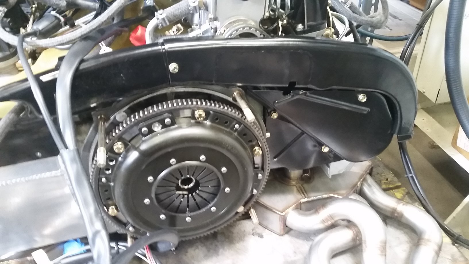 Engine is complete now. Final power figures are 228 horses at less than redline....so likely more is still available. This is with the Dansk single outlet sport exhaust. To me these are exceptional power numbers for an 8.5:1 stock Carrera RS engine. Factory rated them at 210hp. When using the factory stock Leistritz single outlet, peak hp was 221 and trailed the Dansk across the entire rpm band by at least 5hp. I'll be using the sport exhaust I'm sure! You'll see some good views of the amber fan shroud that Damon Series 900 fabs. Also the restored fan and fan housing that Mark Motshagen so beautifully does. Factory 914-6 engine tin with mods for the MFI pump belt. Ben's beautiful 1-5/8" HE's. 1-5/8" size was the right call with this 2.7 MFI engine vs. factory 1-1/2" primaries. The "special" Sachs sport clutch pack that according to the engine builder is super light but very robust. Last to install are the heater hoses and the hot air hose that feeds heated air from the HE to the MFI pump thermostat. I'm very happy with this part of the build. But then....Rothsport never fails to get it right....down to the very small details. |