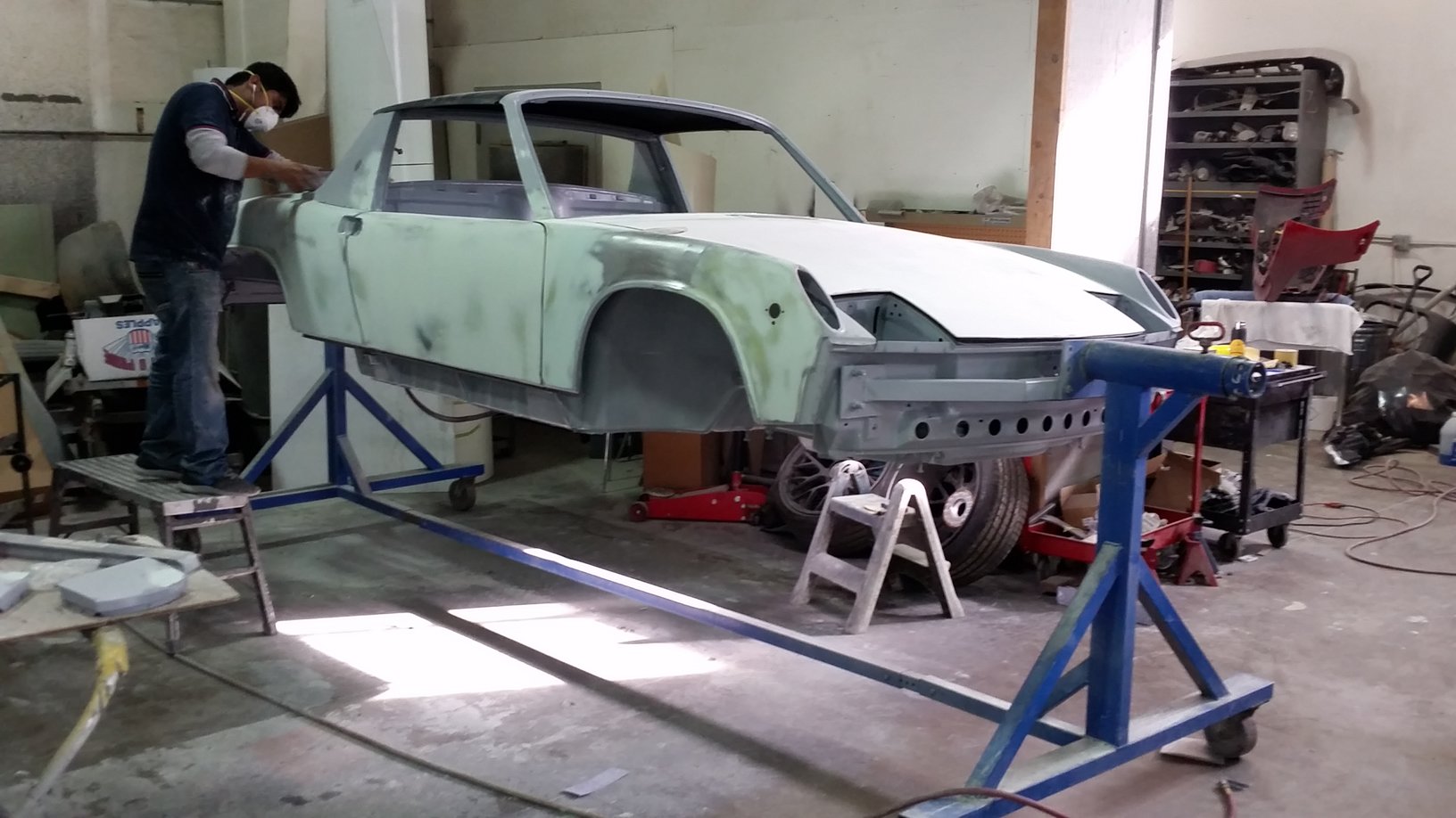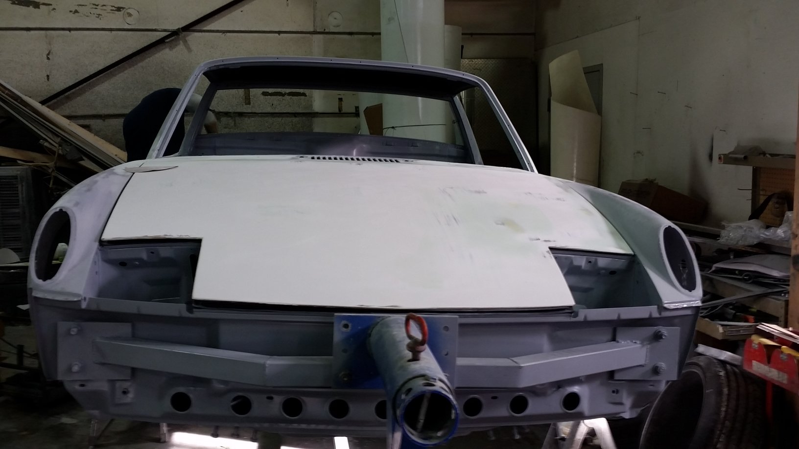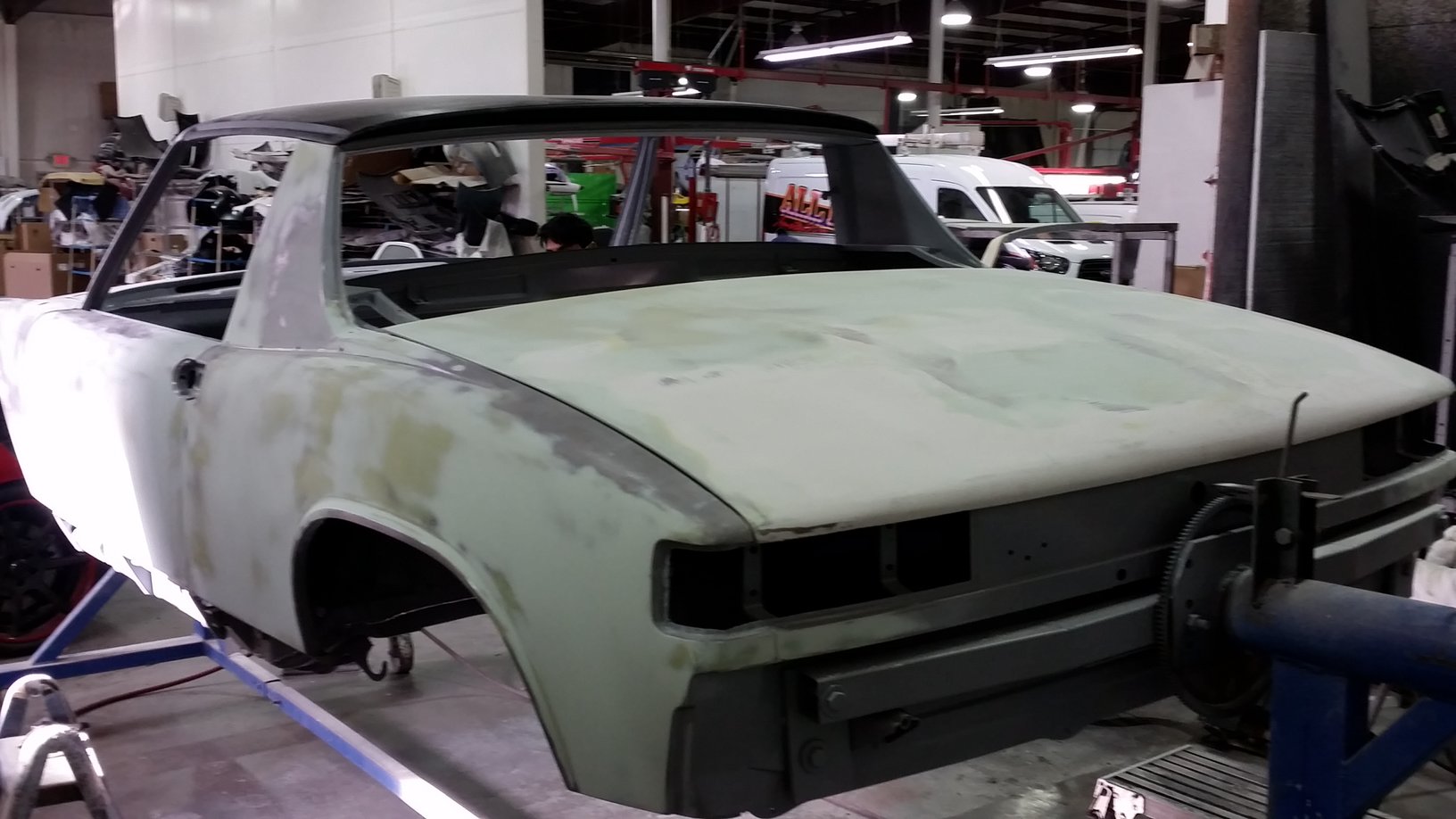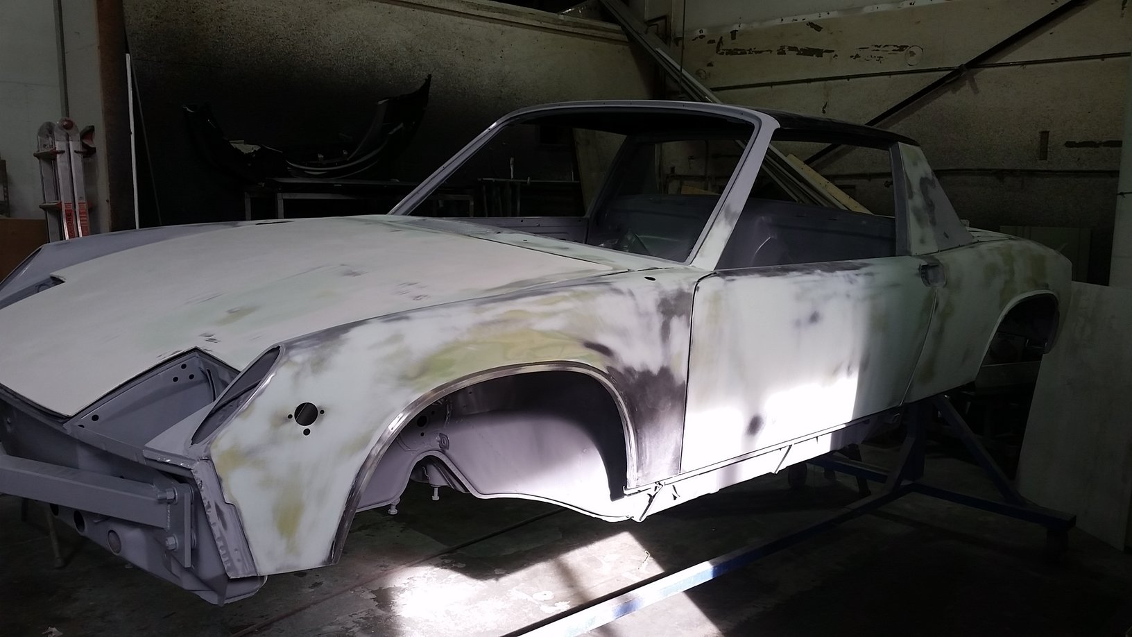 Superior Auto Body out of Gresham, OR has been hard at it for about 2 weeks now. Starting to make some good progress. To be honest, I did not start with the best of chassis's but decided to just "go for it" in the end. Let's just say I've saved another 914 from the crusher. Very few straight panels at all on this car. So you'll see a "fair" degree of body filler....hahaha. For real. This is all skim coat so there will be no thick sections of body filler anywhere. Even the top of the targa panel had been walked on it appeared. In general, the main part of the chassis was in pretty good shape. The driver door needed to be opened up with their monster porta power to get the door gaps correct. Like I said the top of the targa had to be addressed. Big suction cups pulled most of the dents out with body filler making it perfect. The biggest issue were the "so called" greatest GT hoods ever made known to man. Yeah right. I'll keep the vendor anonymous at this point, but the hoods were grossly over lauded. Fit was extremely poor, but that's typical of fiberglass. What was really disappointing was the construction techniques were just simply abysmal. The gel coat was not nicely applied to the mold as were the subsequent layers of fiberglass. The actual shape of the hoods especially the rear one were very substandard. The shop has done a lot of work to get them looking drastically better using Corvette panel materials. There were voids or pores everywhere that needed attending to such that the later paint job wouldn't be adversely affected. Next time I'll try Getty....that's all I'll say at this point. Very, very expensive (~$2800) GT "replica" hoods that just weren't worth the money. This shop will get them usable but at what cost? Live and learn. One of the many expensive lessons learned on this build. |