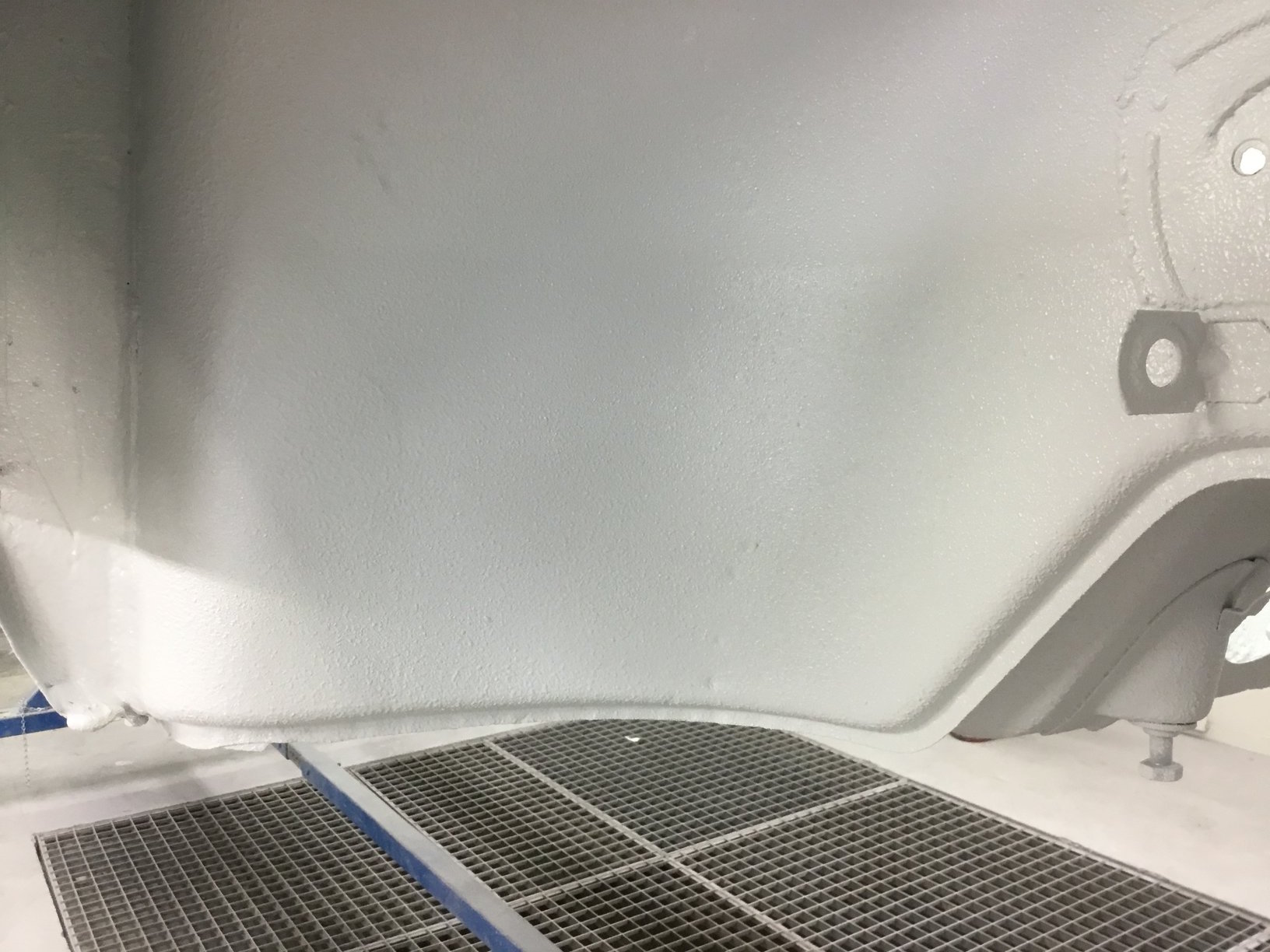 Took awhile to get the right color match of the Carrara Weisse on the Raptor tintable Urethane bedliner/undercoationg, but eventually we got there. The last pic shows the texture that we achieved. Not quite concours Wurth pebbly, but will be work fine with this hotrod. Stuff should be bulletproof. I was considering going with a different color on the bottom like beige or some light gray, but in the end the same color of what will be applied to the rest of the car "won the day." |