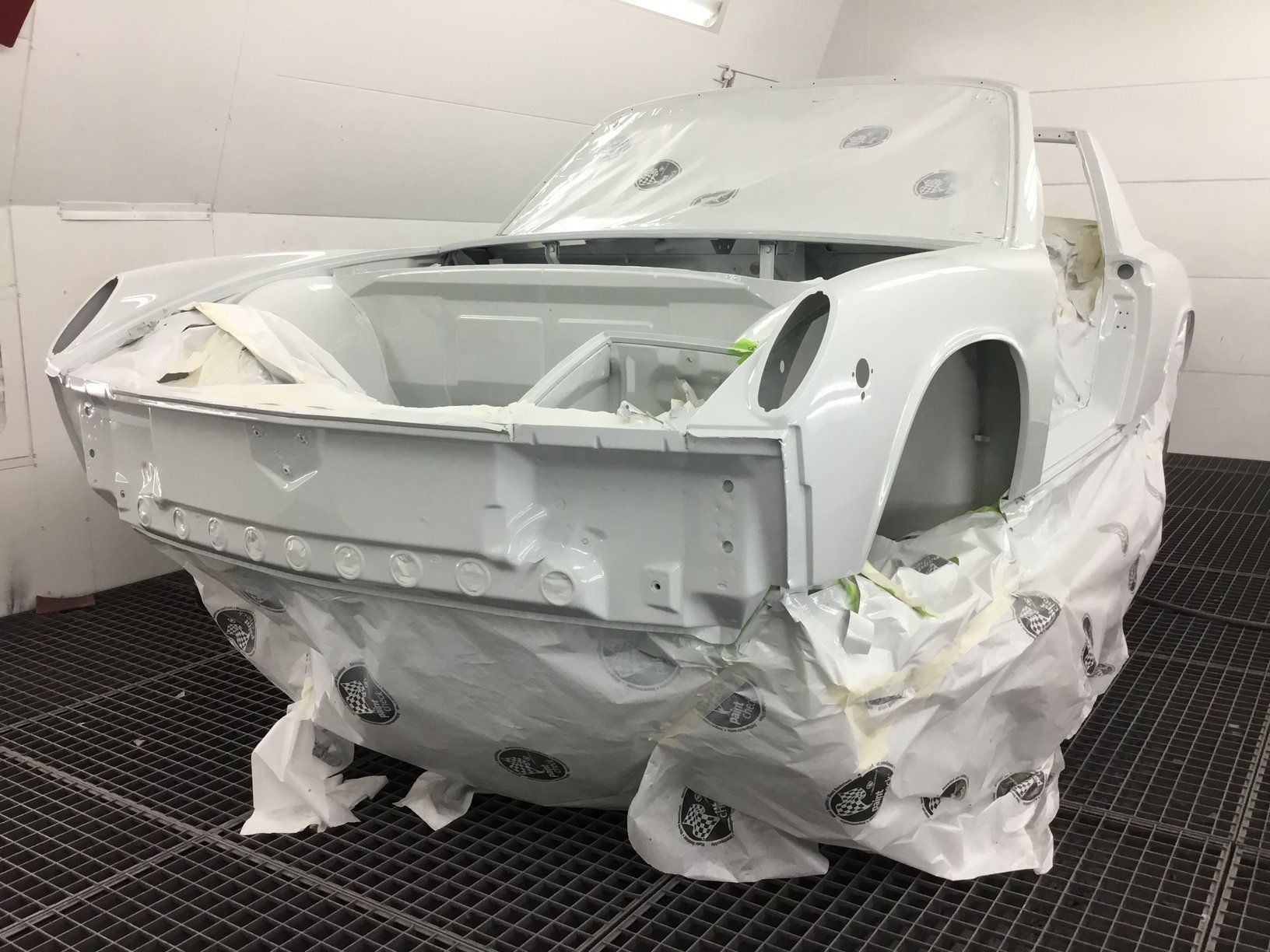 The current finish really is good enough for my needs....very little orange peal and waviness, but the shop owner wants it something he can be proud of, so next up is the "cut and buff" or wet sanding and polishing. Will be mirror-like when they are done. And they're giving me a projected completion of next week some time The front and rear valances and side skirts have all been painted their "hotrod" black and the sheen looks perfect. Not too shiny or flat....just right in my eye. Still have the 2 hoods, engine lid and headlight doors to paint which will take place tomorrow. The doors have already been completed. Wasn't so sure about going with white at the beginning of this project. The original color of the car was light ivory. This Carrara Weisse is a very nice white and has a lot more "pop" than light ivory. I had wanted tangerine, but too many recent cars on 914 World sport that color. My other favorite is a 911 color, Albert blue, but somehow it just didn't look right on a 914 I thought. So here we ended up with the 2018 Porsche color, Carrara Weisse. |