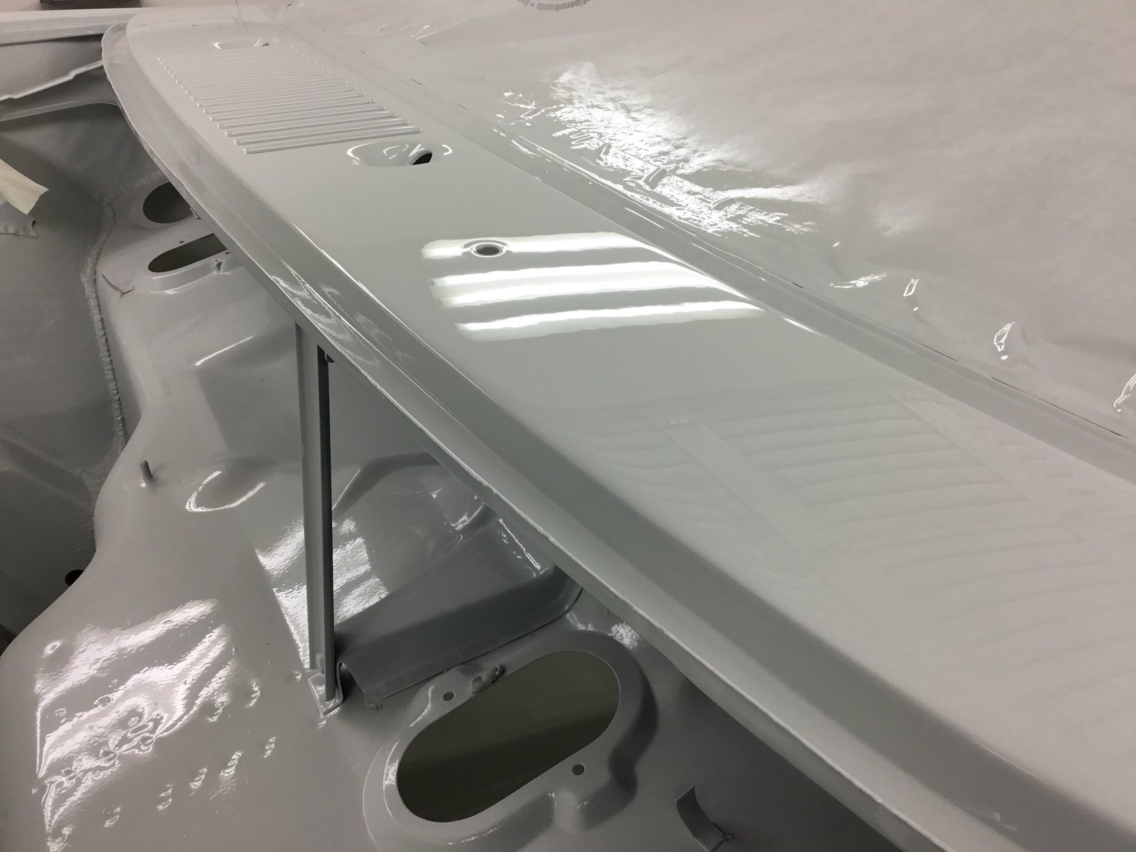 It's a very nice and bright white....much more white than light ivory for sure. Some of the method used to get this car down to the bare metal reared it's ugly head. Impossible (as many have said before) to get all the media out of the car that was used to blast it down to bare metal. When the spray painters start spraying, the leftover media comes out of every nook and cranny imaginable. There is left over media imbedded in some of the paint in the interior. The painters wanted to attack it with their DA's and repaint the cabin, but since it's all underneath sound/heat shield padding and carpeting, I said no to all that extra work. In a way, it will be a remembrance of all the work that went into this chassis to get it ready for paint. Dipping would have been worse I've heard, as the chemicals leach out of all the crevices and joints ruining your paint job for years to come. The exterior still has it's final guide coat that they were sanding off as we speak. Plan is to get the car off the rotisserie and back onto my cart, so that the nose and tail can some quick bodywork completed. Then the remainder of the car will be painted. The roof has been repaired and retextured and is ready for paint. The side sill covers, front and rear valance are also ready to receive their "hotrod" black as well. The black is a very nice satin that has just the right amount of sheen. |