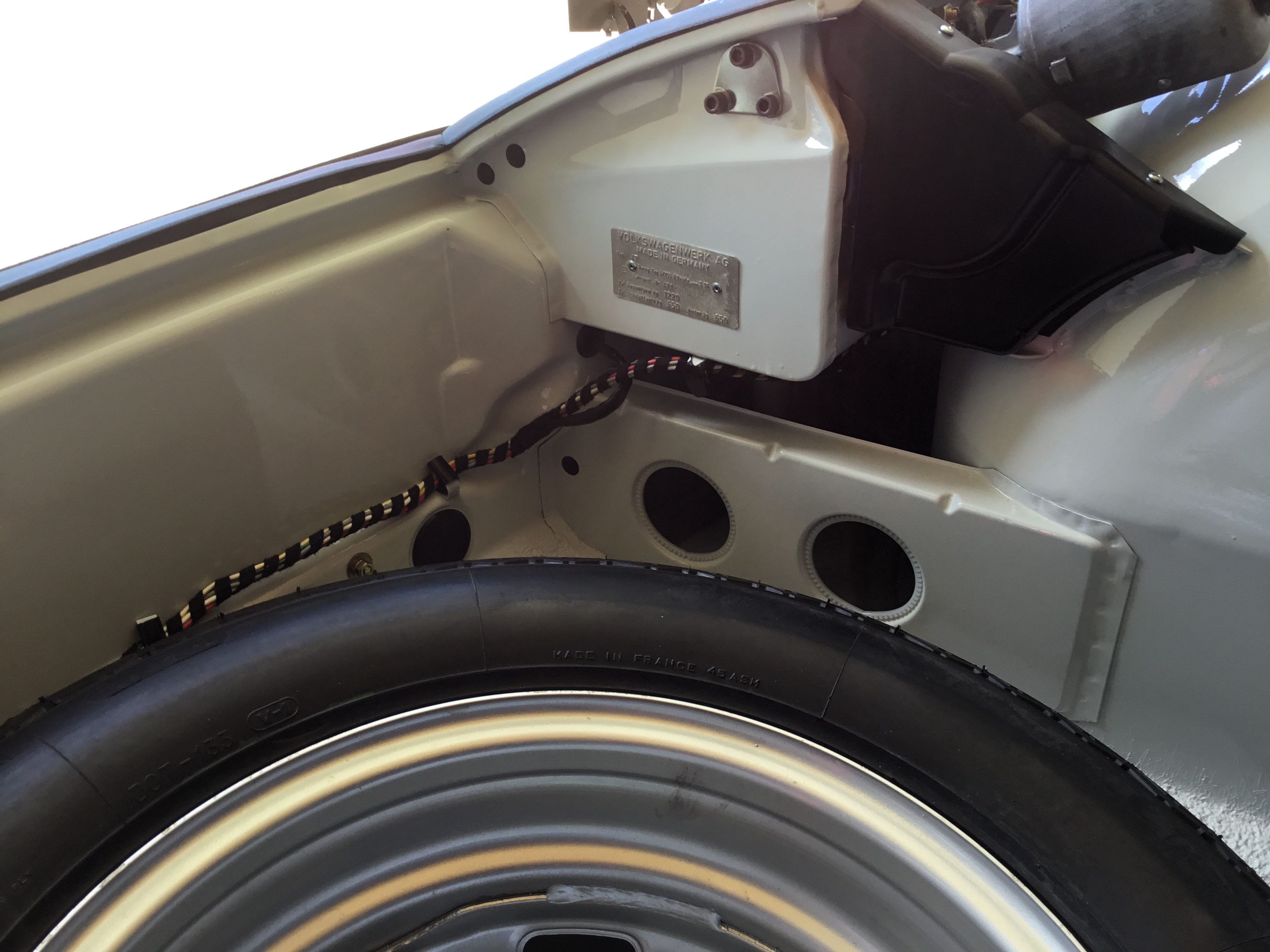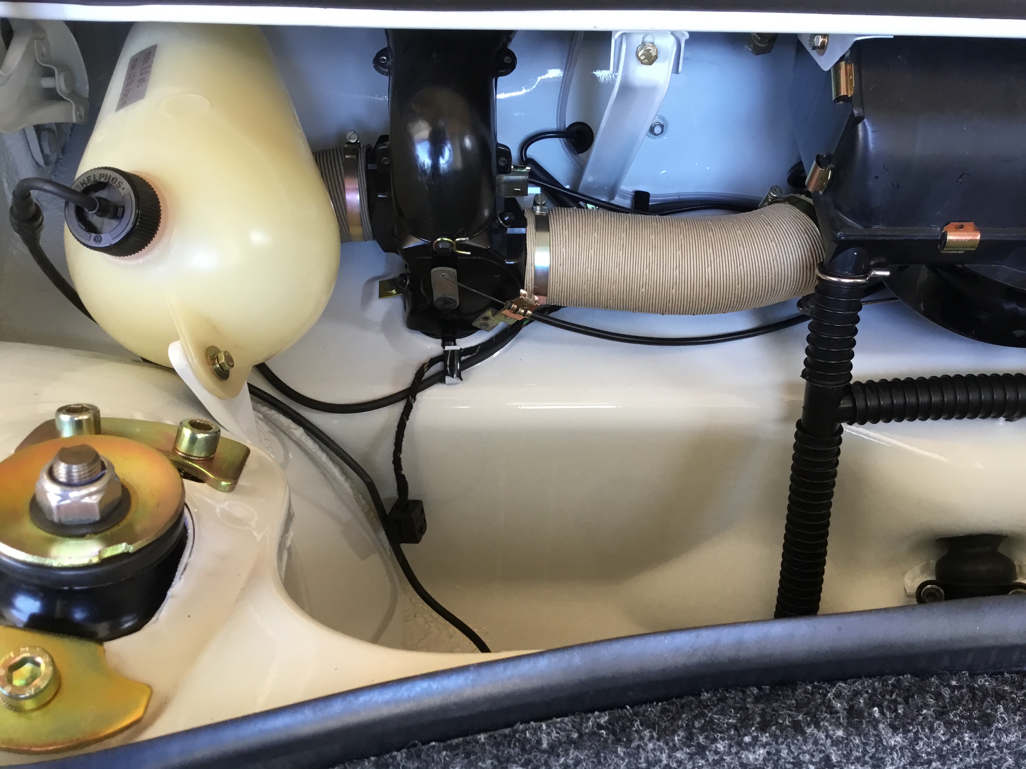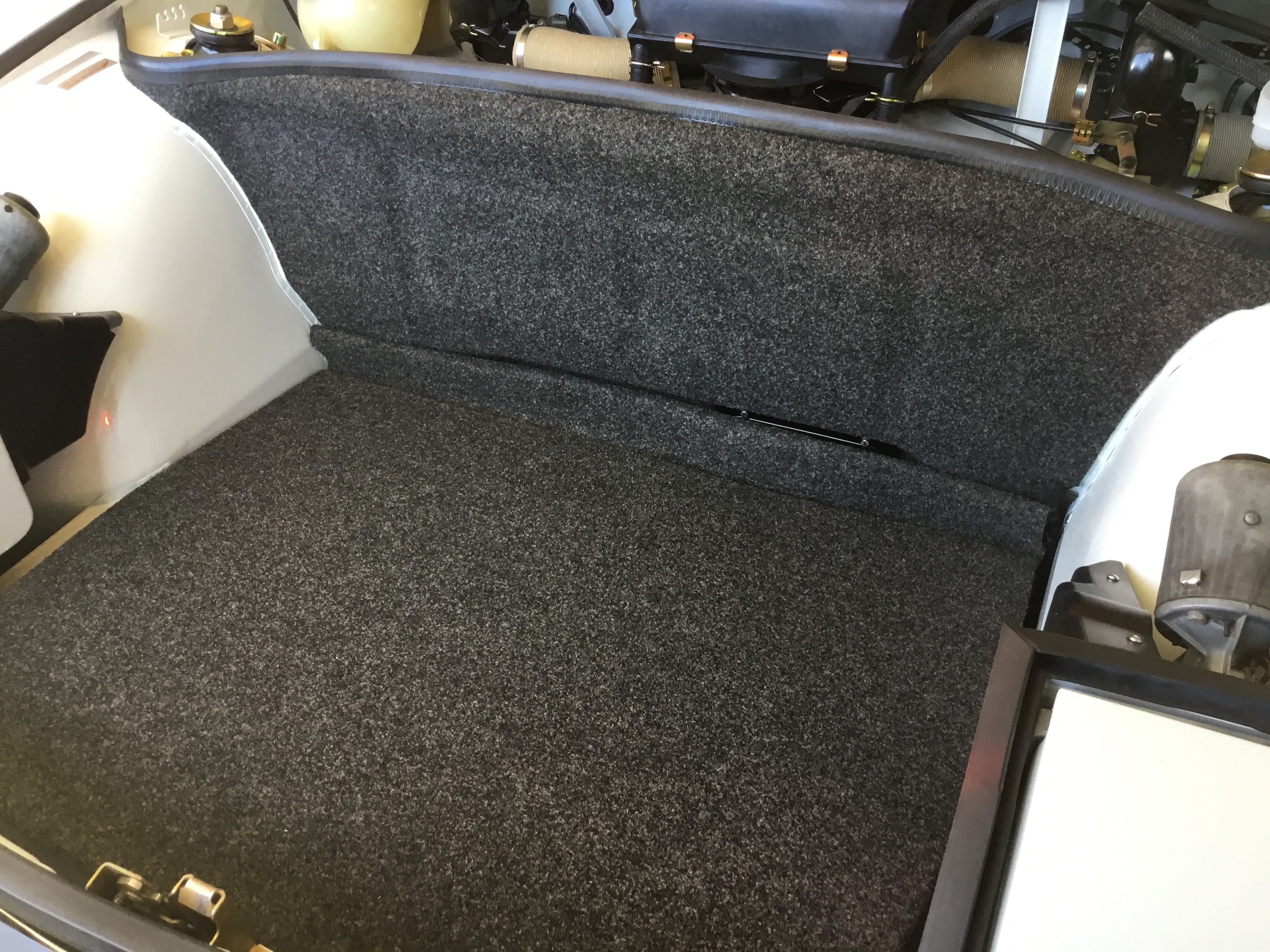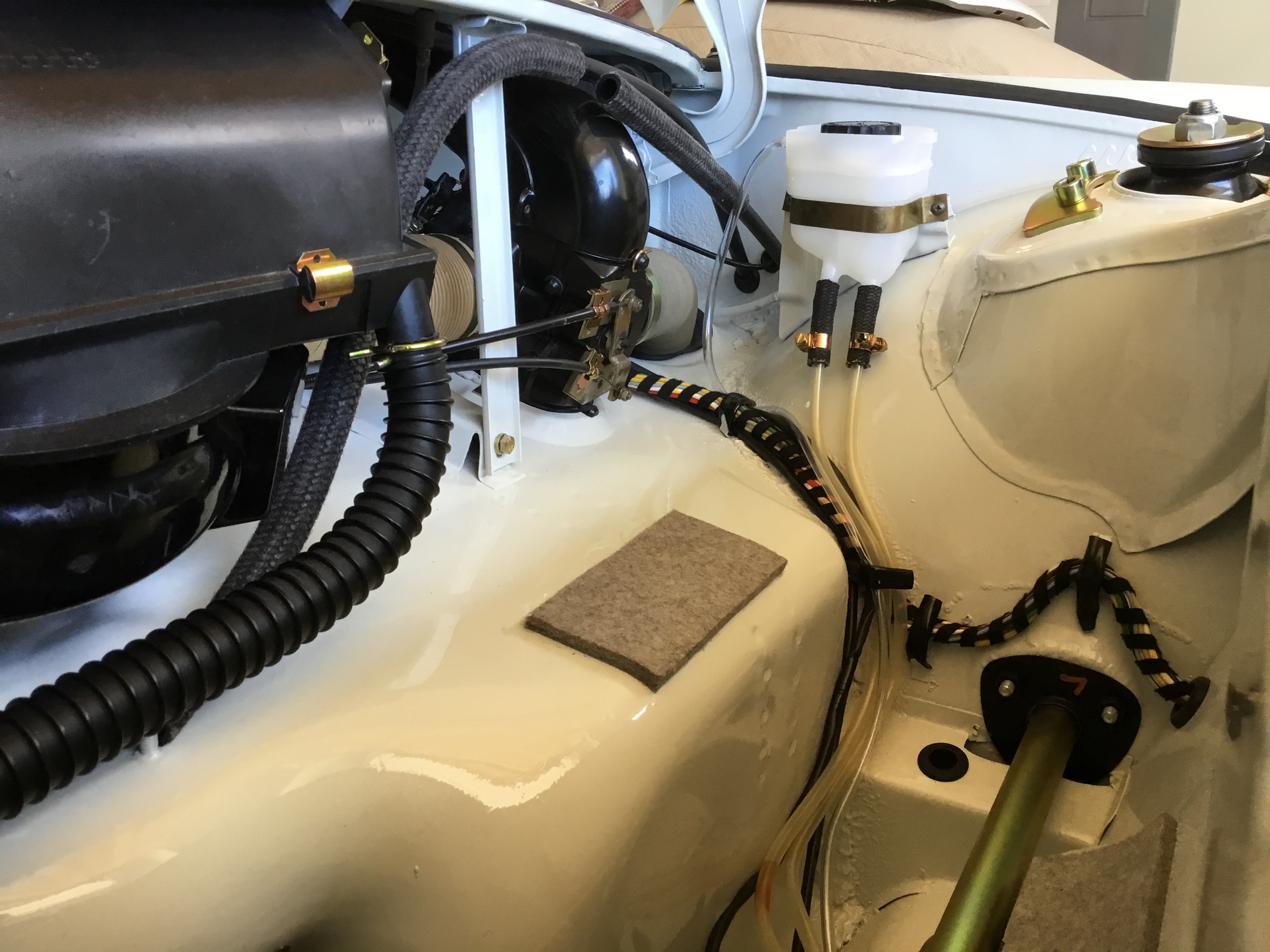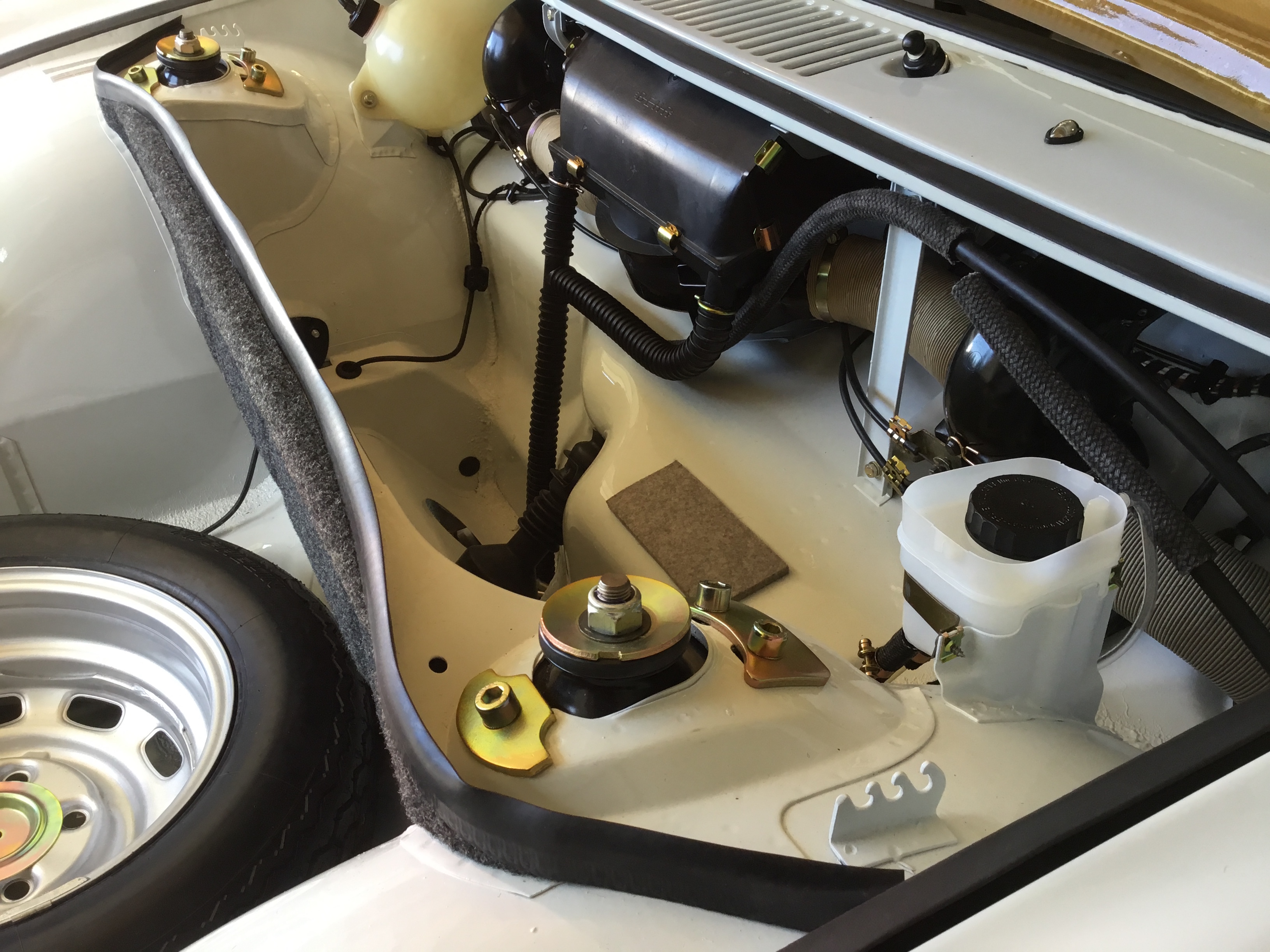 I'm about 90% done with my part of the assembly. Main things left to complete: - installation of the front and rear glass - assembly of the windows in the doors - carpet, back pad and seats Without further ado, here are some update pics beginning with the front trunk. And yes, the installation of the fresh air box was a mutha. For some reason, the wiper assembly was not clocked backwards enough and was blocking the air box from reaching it's desired location. That took a few iterations of back out....and then back in again. The distribution boxes on either side had their own set of challenges. Many new parts, freshly plated parts, etc. Even the felt for beneath the fuel tank is new. I like the look of the "tan" hot air paper/foil tubes for sure. |
