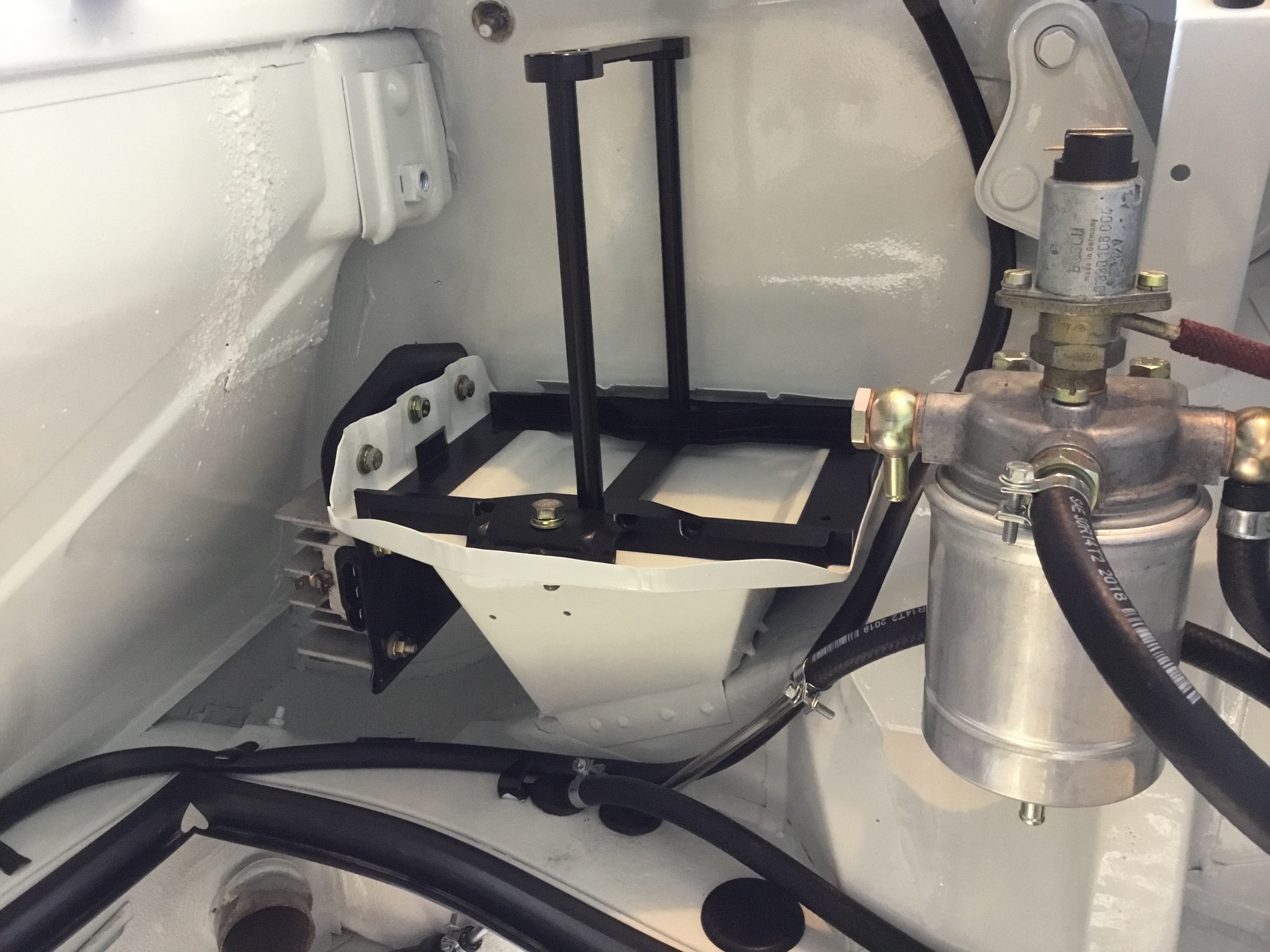 Opposite side of the engine bay showing the battery tray with CDI box bolted to the side (for the MFI engine) and the MFI micro filter that feeds the MFI pump on the engine.