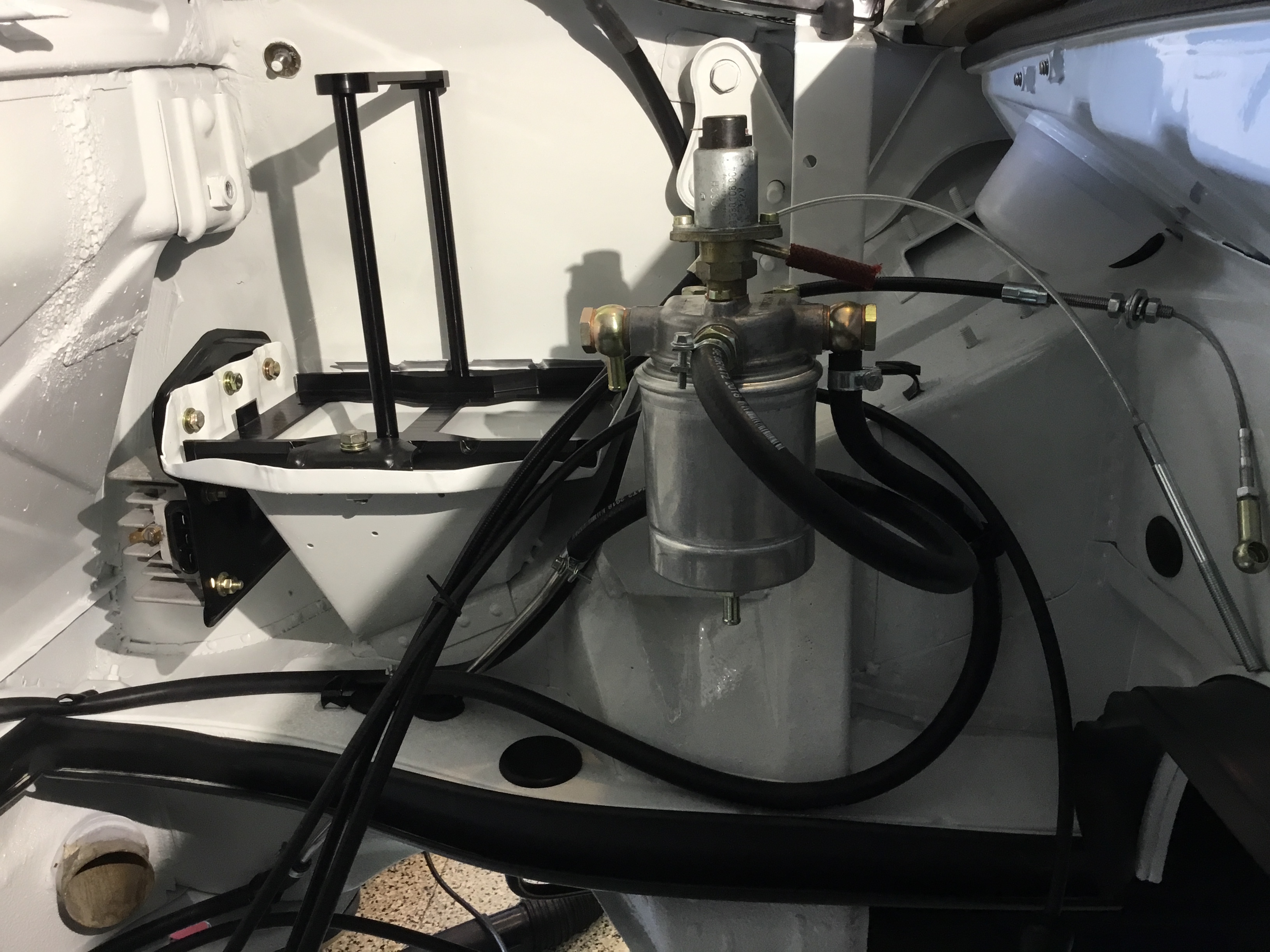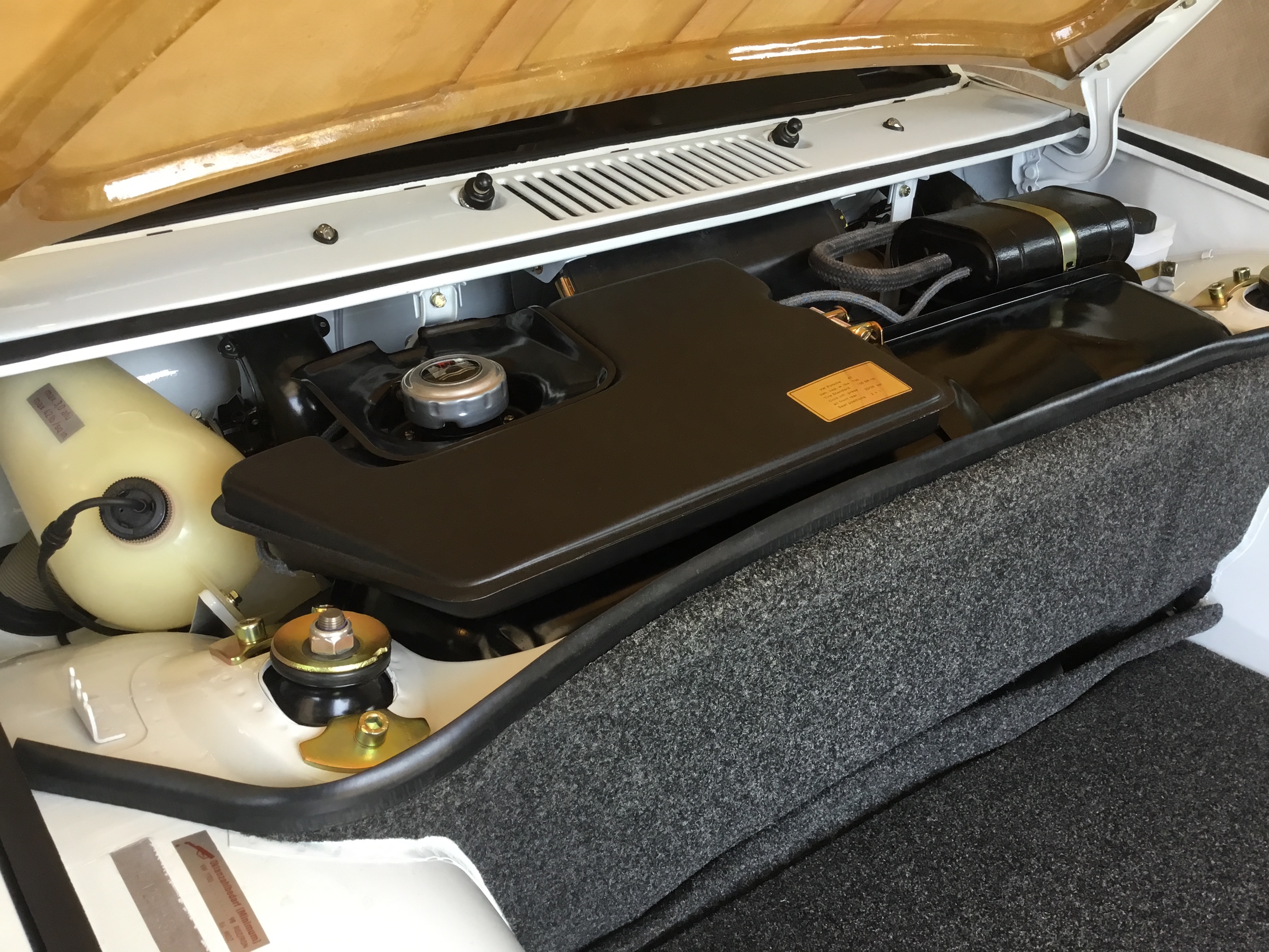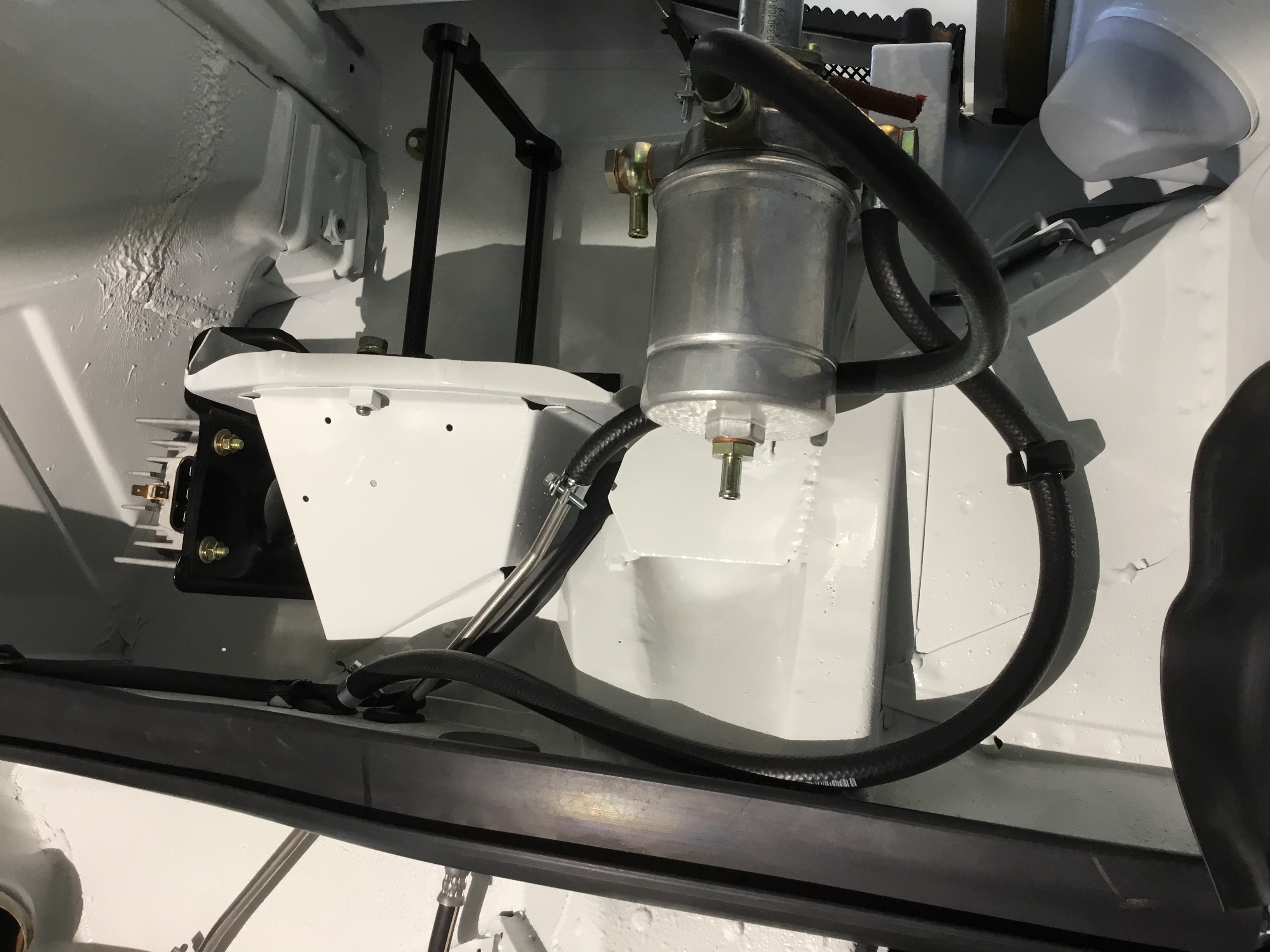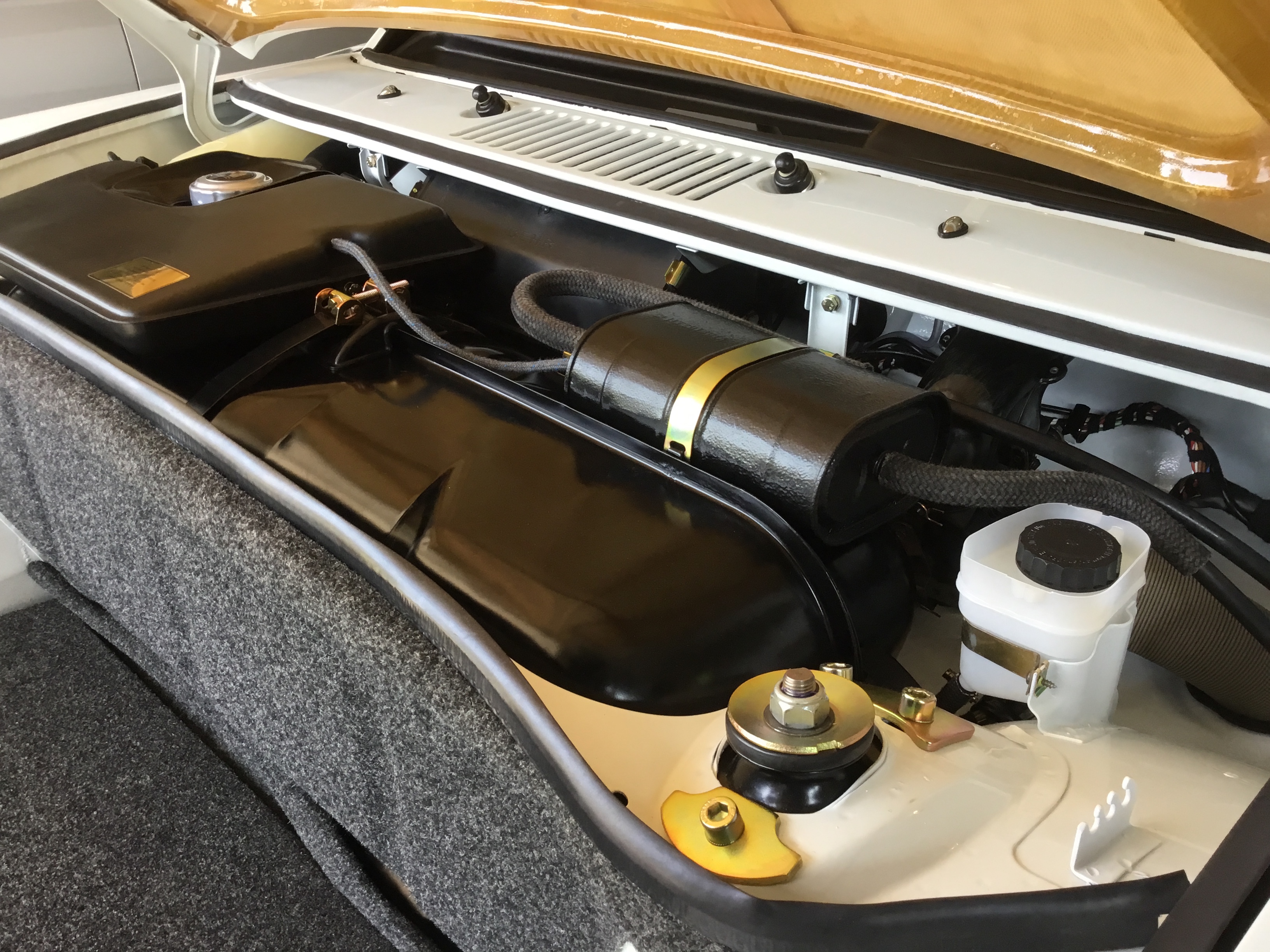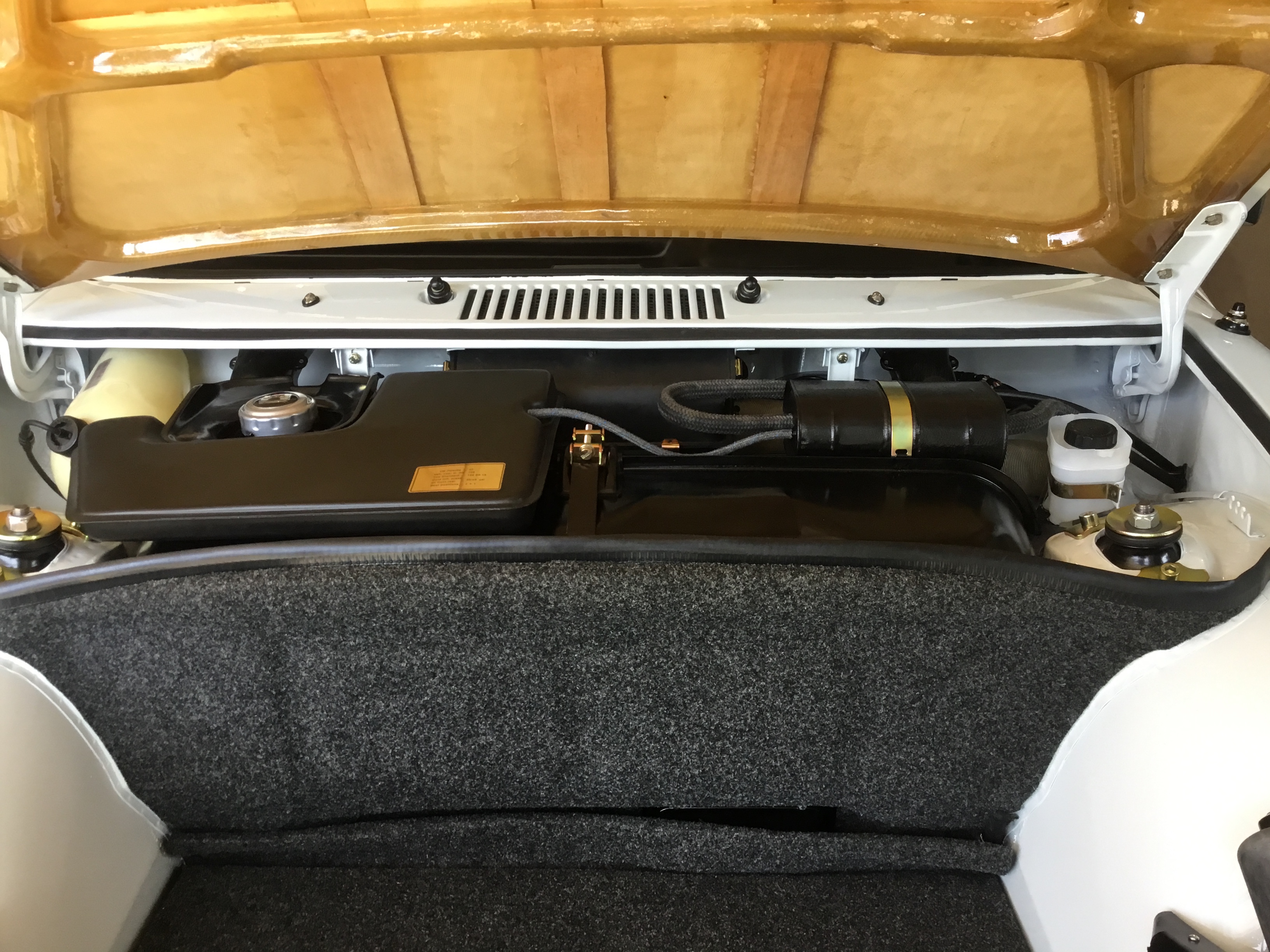 All went fairly smooth. There are just certain things that must be installed in a certain order. Once I figured that out, I had it all in place in a couple hours time. Used Gates Barricade FI hoses rated for 225psi under the tank with high pressure hose clamps. Had plenty of extra fuel line such that it laid in there pretty nicely without any kinks as far as could tell. New braided hoses for the vapor recovery system and lots of replated hardware (yellow zinc) or new. New sticker for the recovery can on top of the tank from Car Bone. |