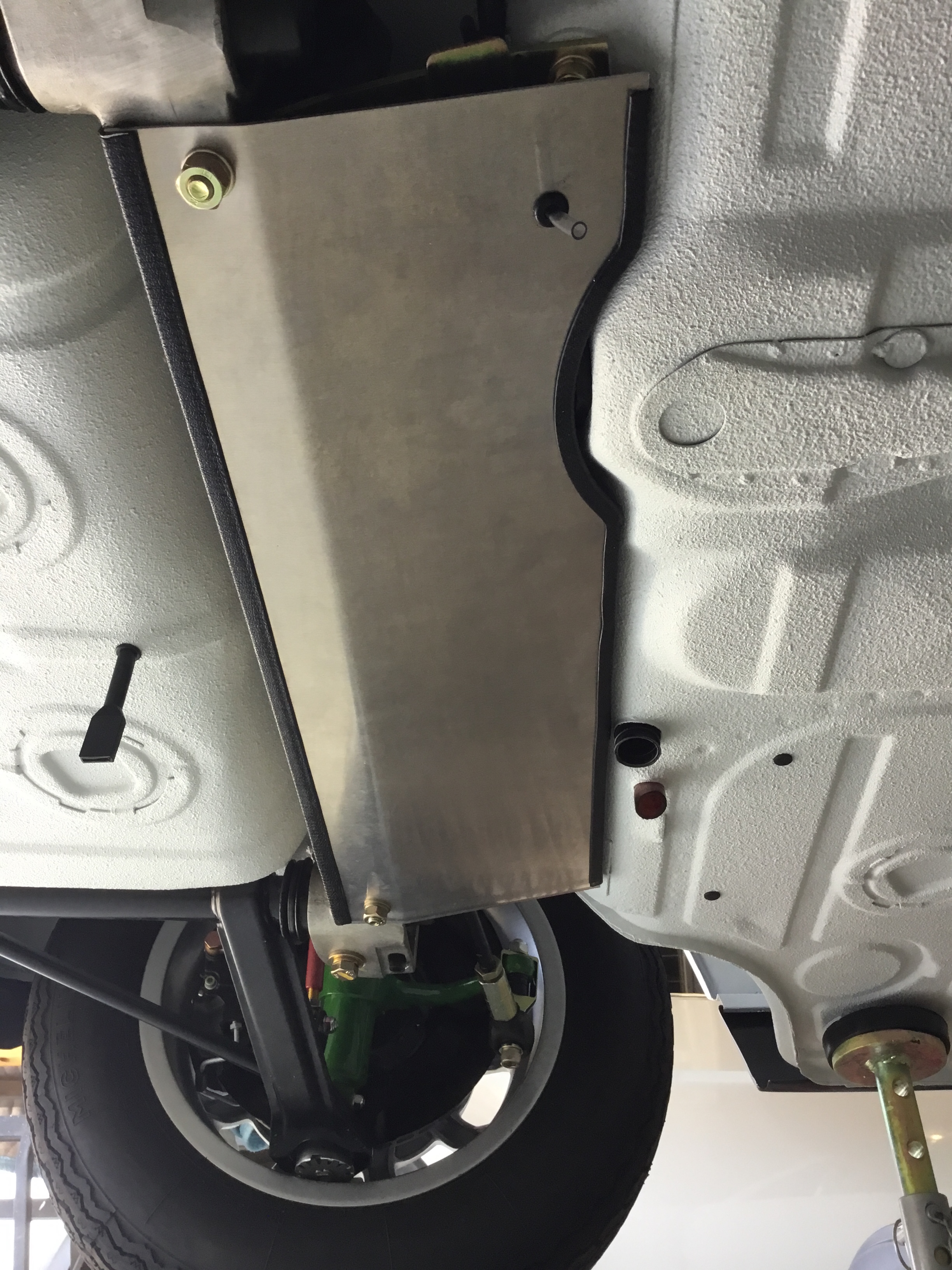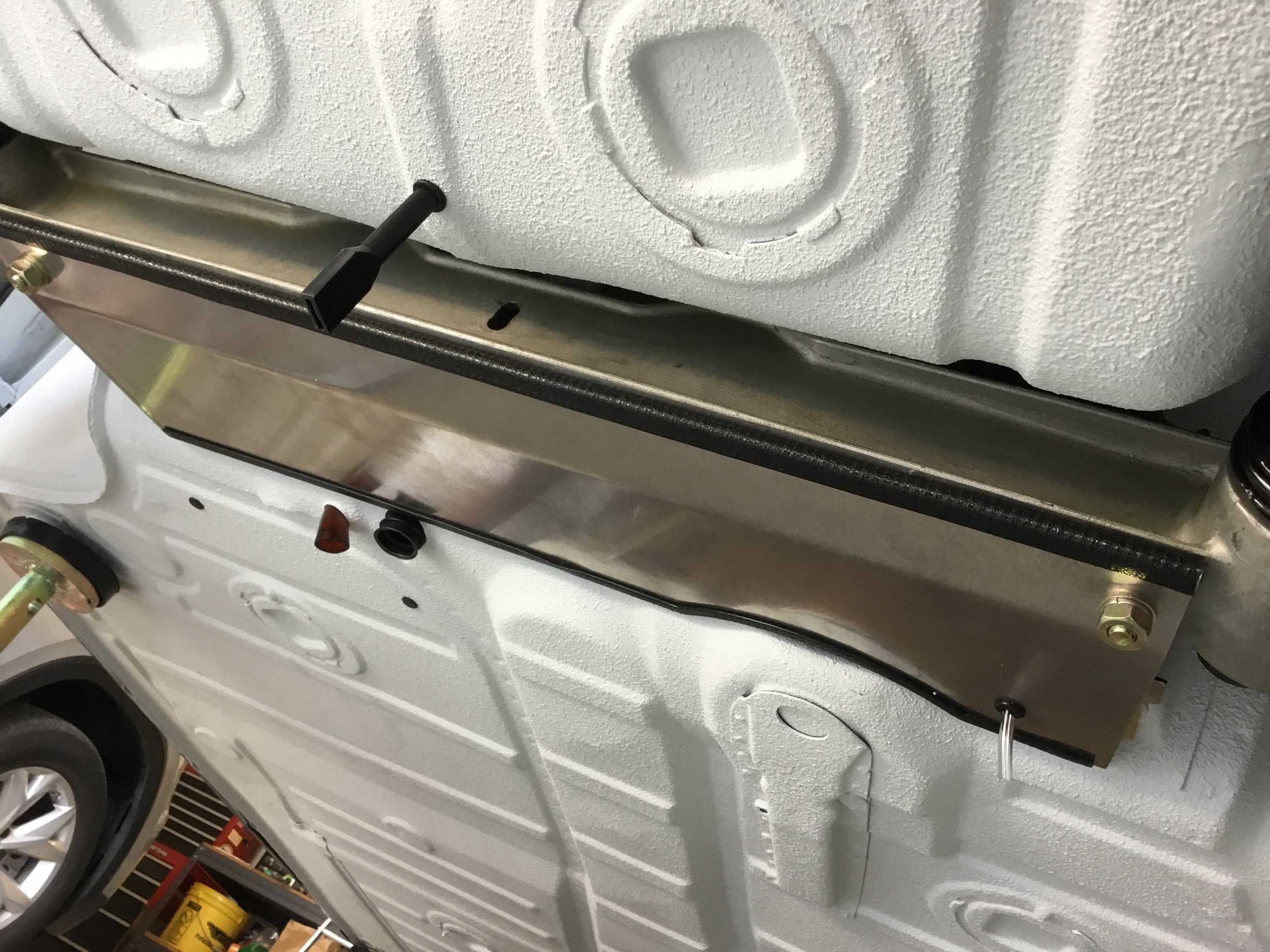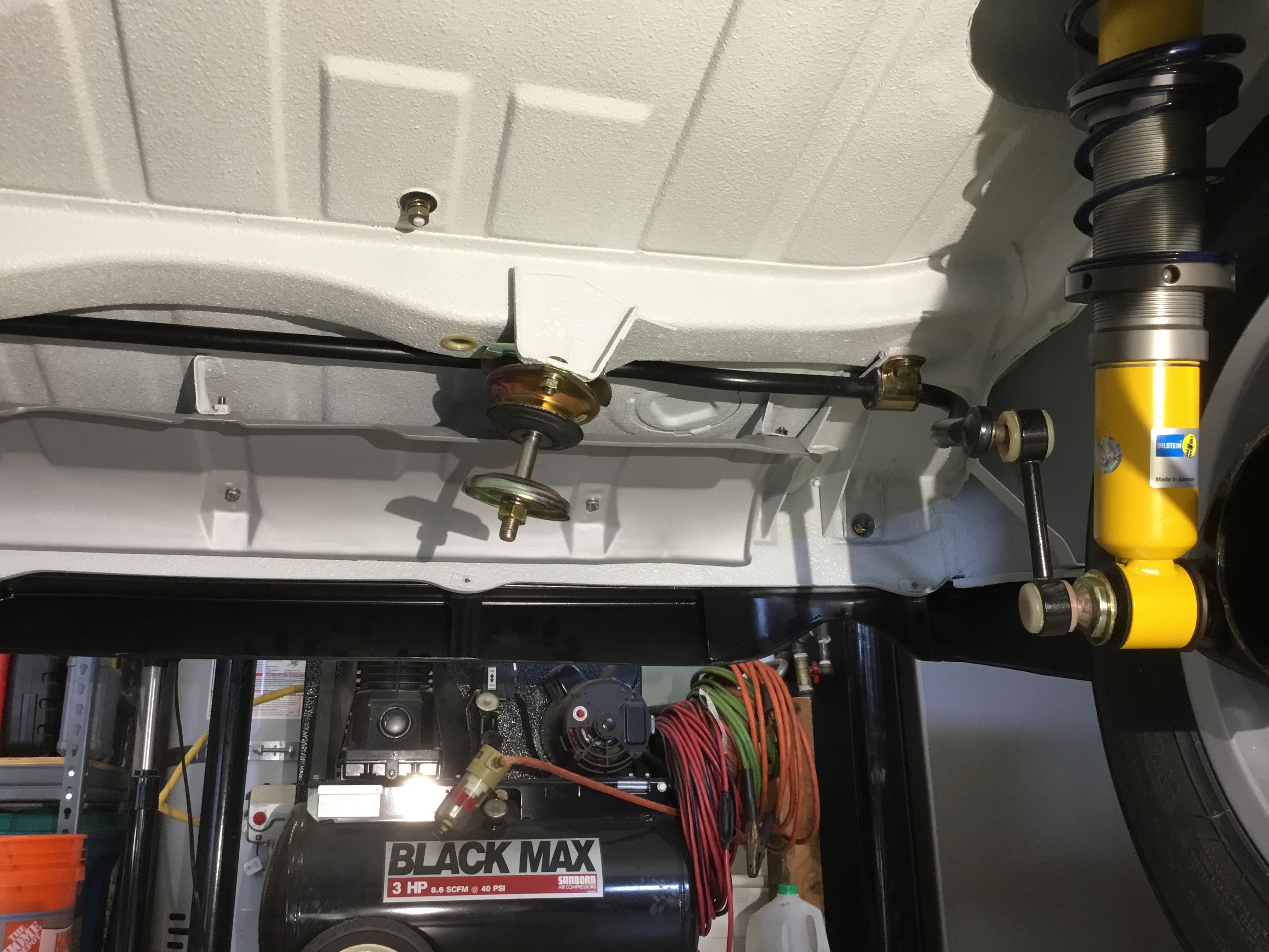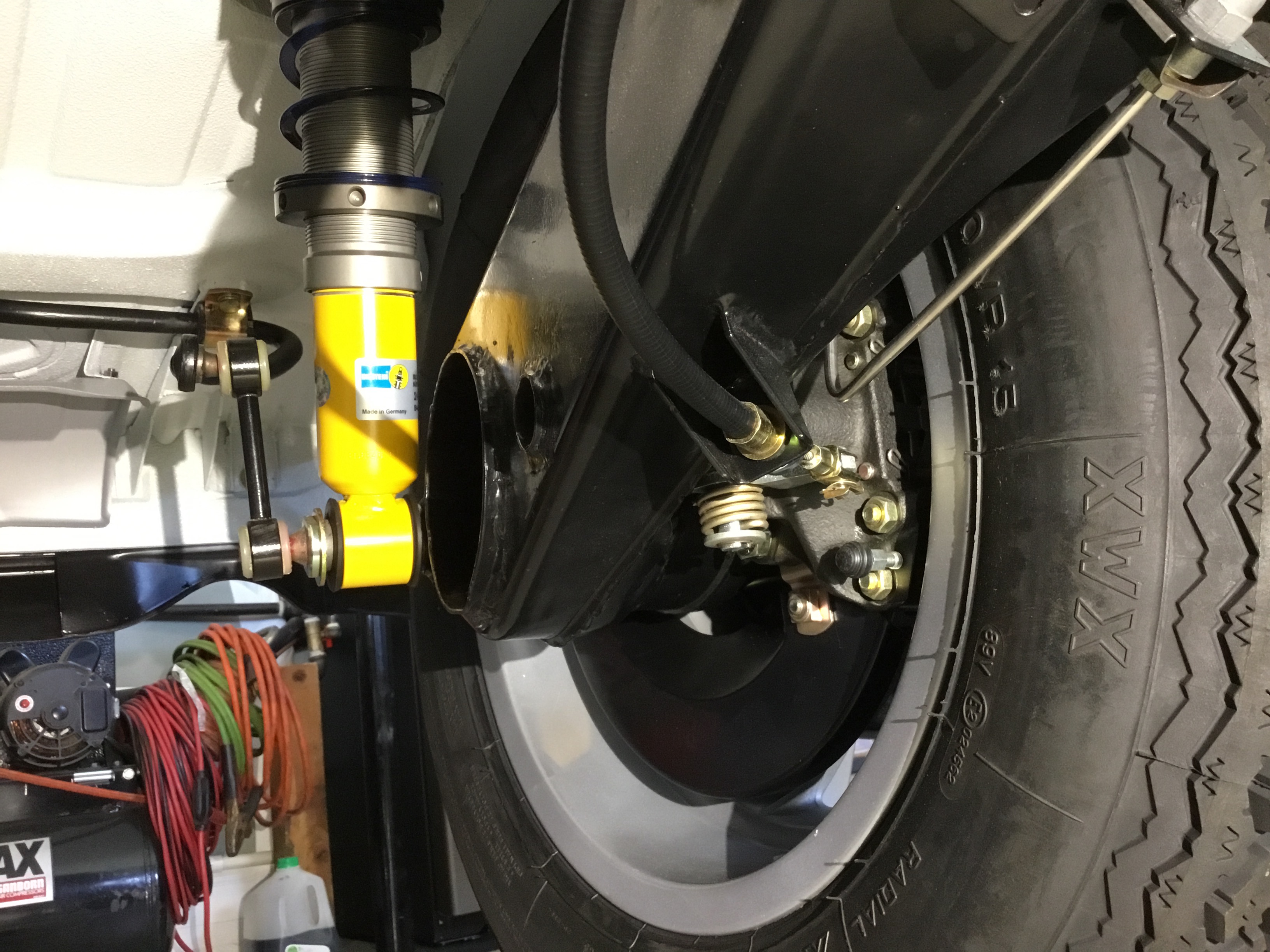 914-6 GT style steel calipers with vented discs. Was able to fit in the brake shields as well. All new stainless steel hard lines and factory rubber lines. Bilstein sport shocks with helper springs joining the main springs....all from Elephant Racing. New rubber bushings up top from 914Rubber. Factory rear swaybar. Removable ceramic coated exhaust heat shield that Cary helped out with. |