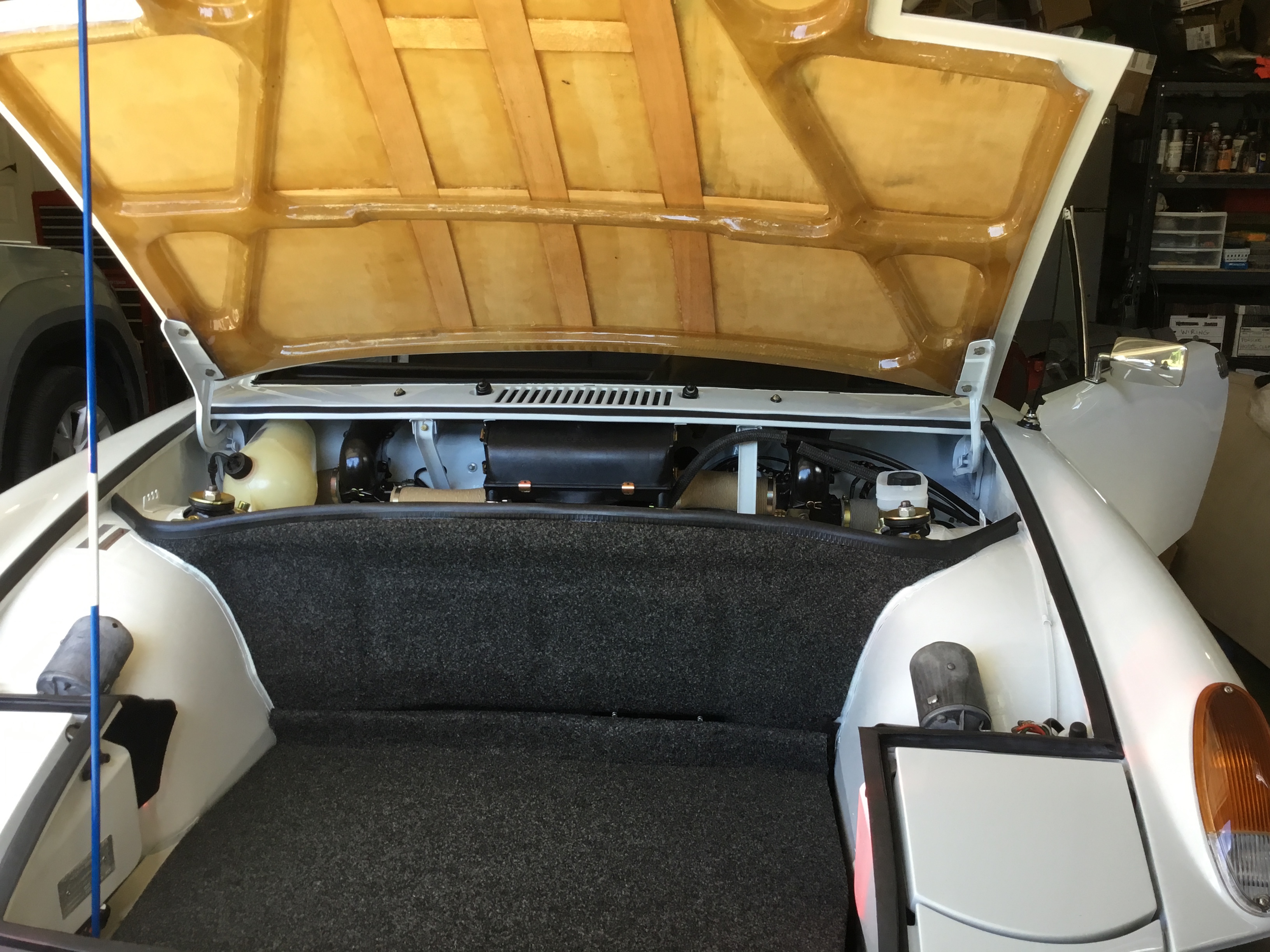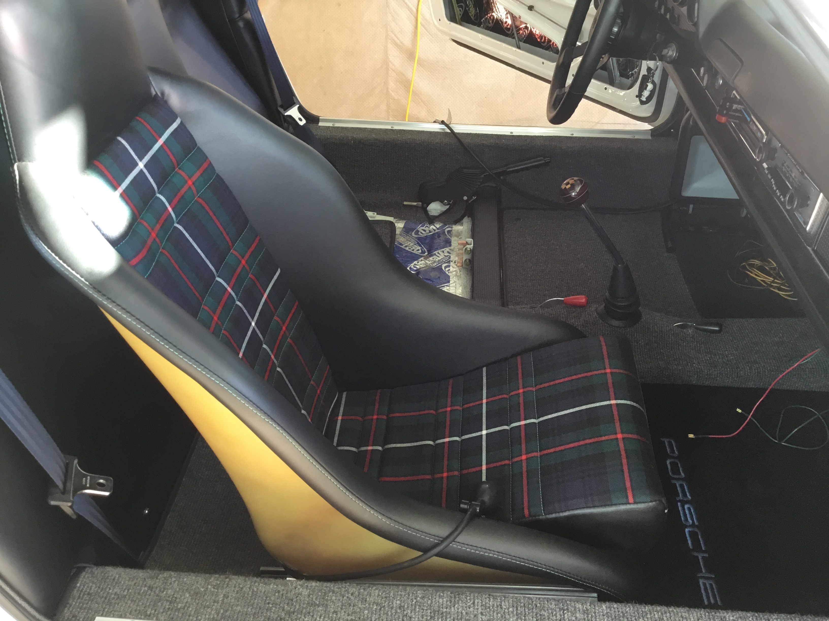 These are the Watkins Glen model from GTS Classics. I picked them because they were more like a sports seat but still fit into the recess of the backpad. German black vinyl along with my custom selection of tartan plaid...Robertson Hunting Modern tartan. Stefan did a great job putting these seats together. I opted for the raw fiberglass backside as well. Most folks get these painted black I think. I wanted the raw fiberglass to tie in with the undersides of the front and rear bonnets and the engine cooling shroud. Need to finish up a bit of under dash wiring before the seats go in for good. I'm a big guy at 6'2" and 200+, so I need a lot of ground space to spread out and get my head up under the dash. (IMG:style_emoticons/default/tongue.gif) The bulb is for the lumbar support adjustments. |