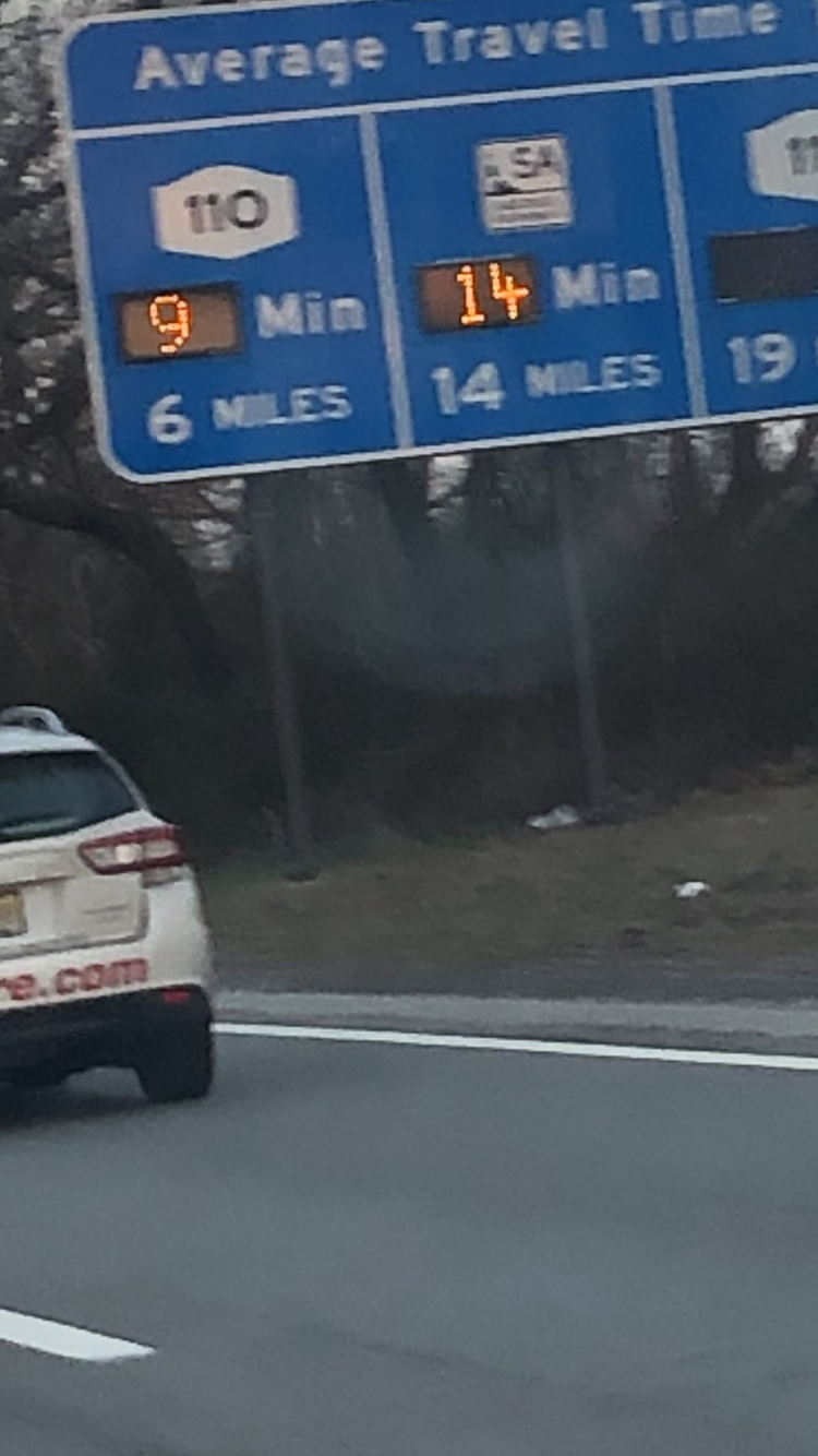 It takes 9 minutes to cover the 6 miles to Route 110 but only 5 more minutes to cover the additional 8 miles to the Sagtikos Parkway? Traffic moving at 96 mph sounds about right for the NS pkwy. (IMG:style_emoticons/default/biggrin.gif) |