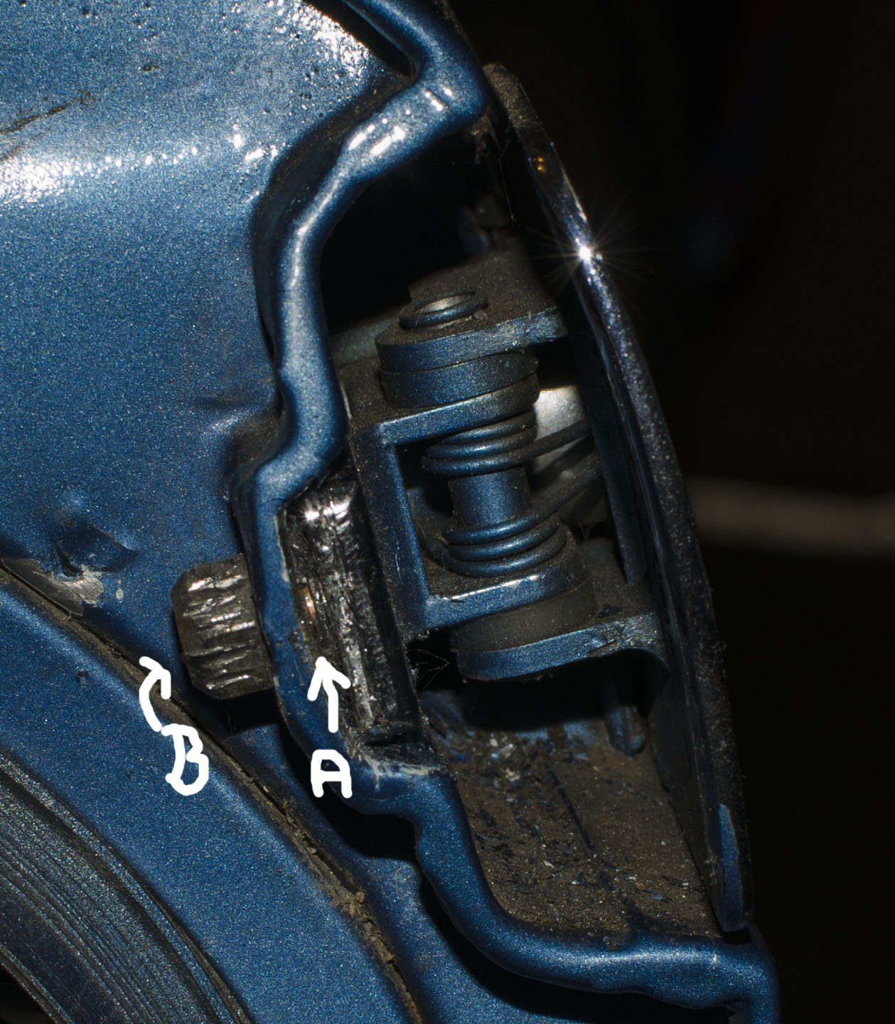 I am thinking that I should try to cut off the stud where (A) is pointing. the other door is the same........... fun tks again. randal edit.............. I have tried the prying and wrenching the nut.... |