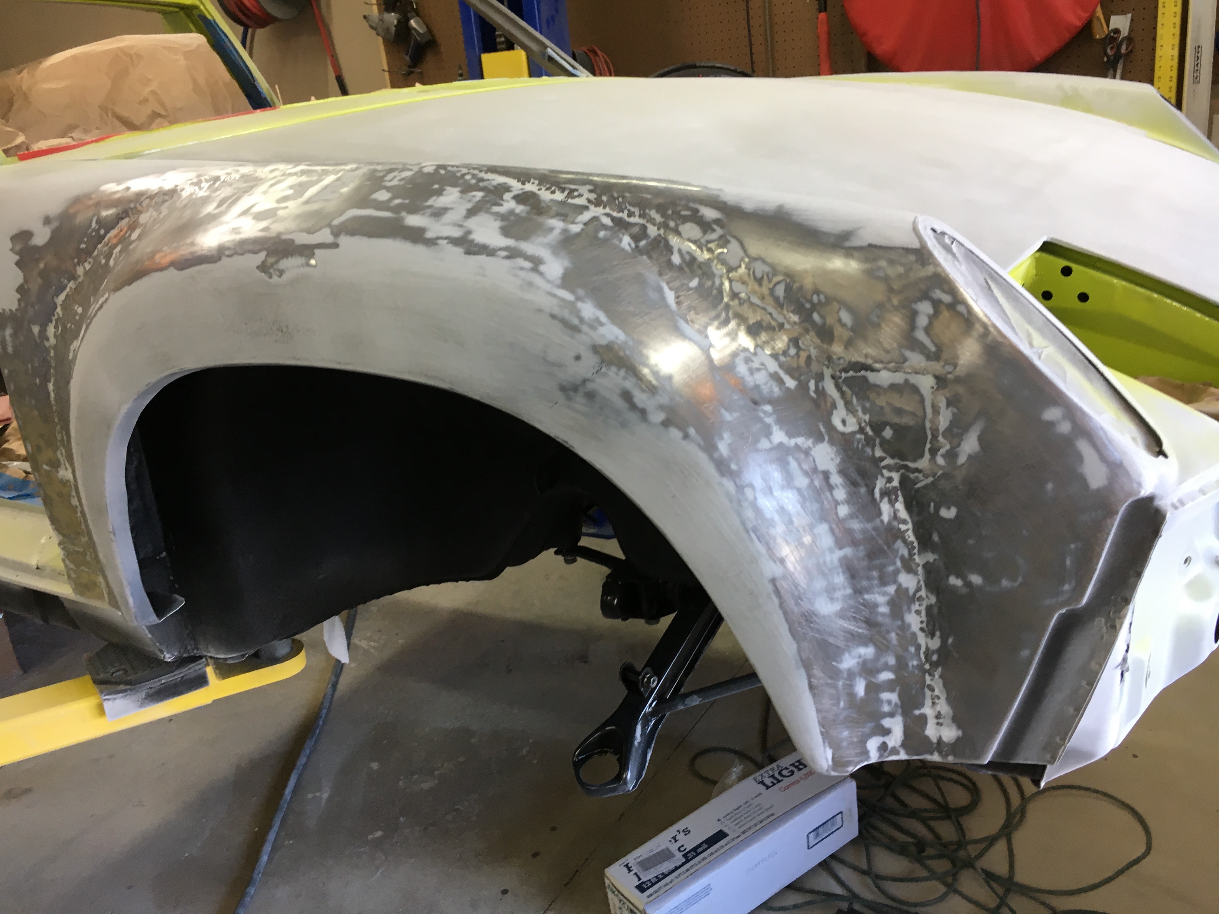 After getting almost finished with body filler on the flares, I realized I probably didn't do it correctly, so it all came off and I started all over again. First layers with metal-impregnated filler, then regular filler, then featherweight. Sounds like a lot of filler but in truth it's 1/8" at the deepest and in most places much less. Attached thumbnail(s) |