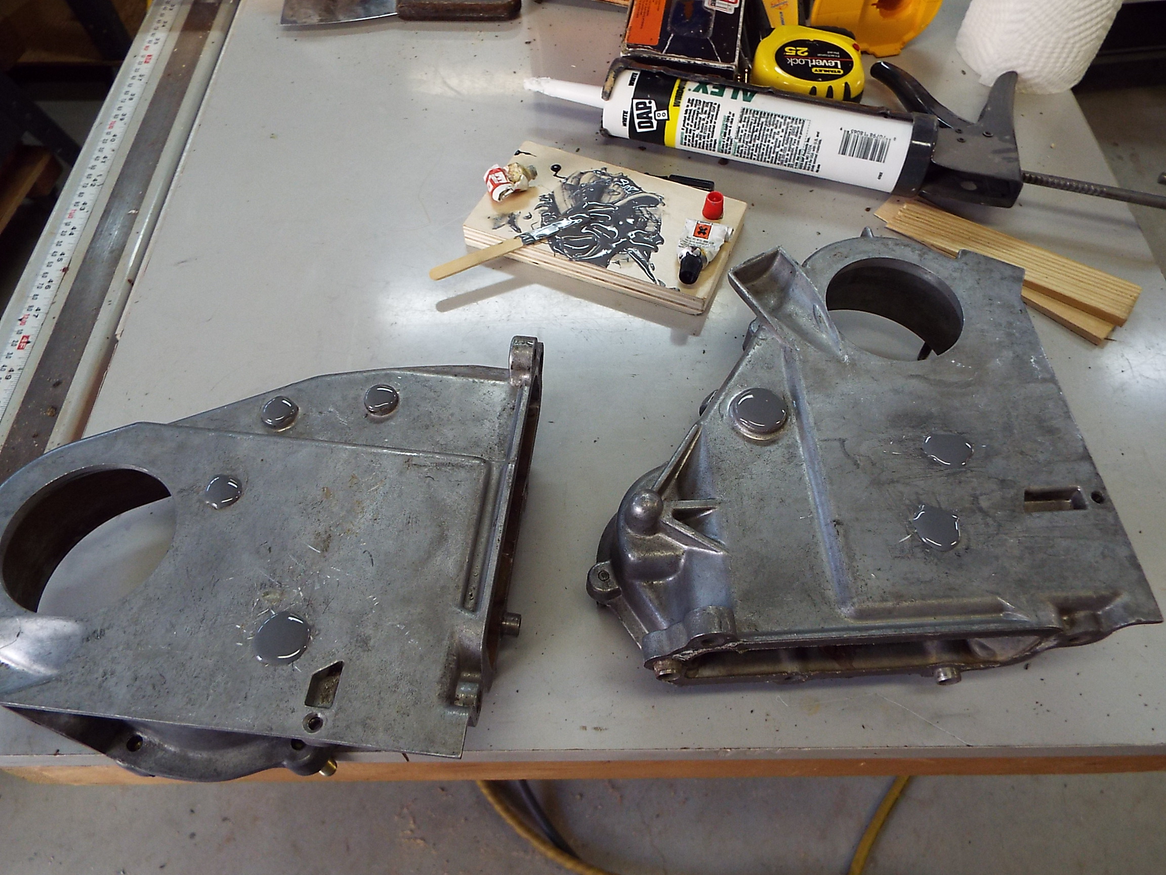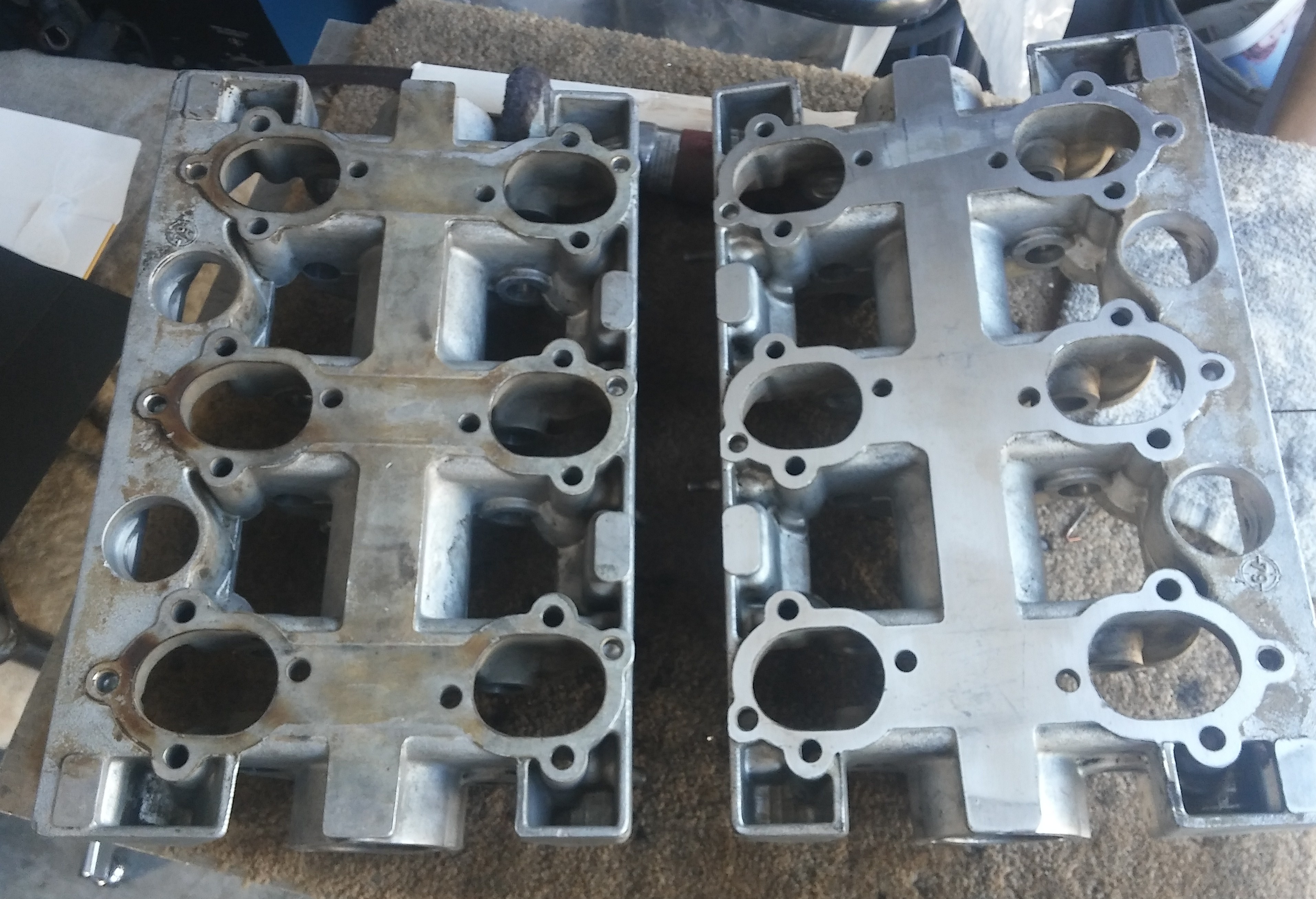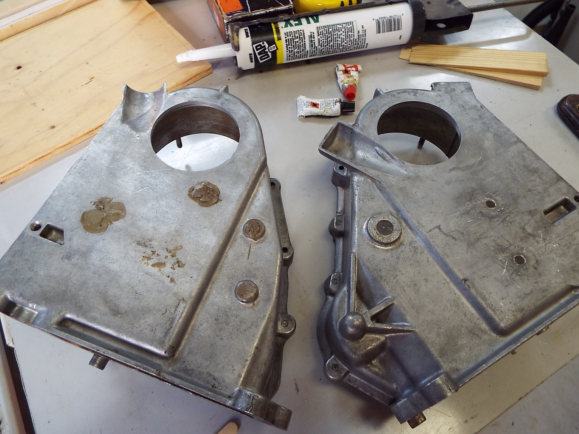 A buddy of mine has a surface plate so I used 320 sand paper to clean the Locktite 472 off of them and of course this also helped ensure flatness too. There were many more cleanings after the sanding operation. Ugh! Before and after pics: |